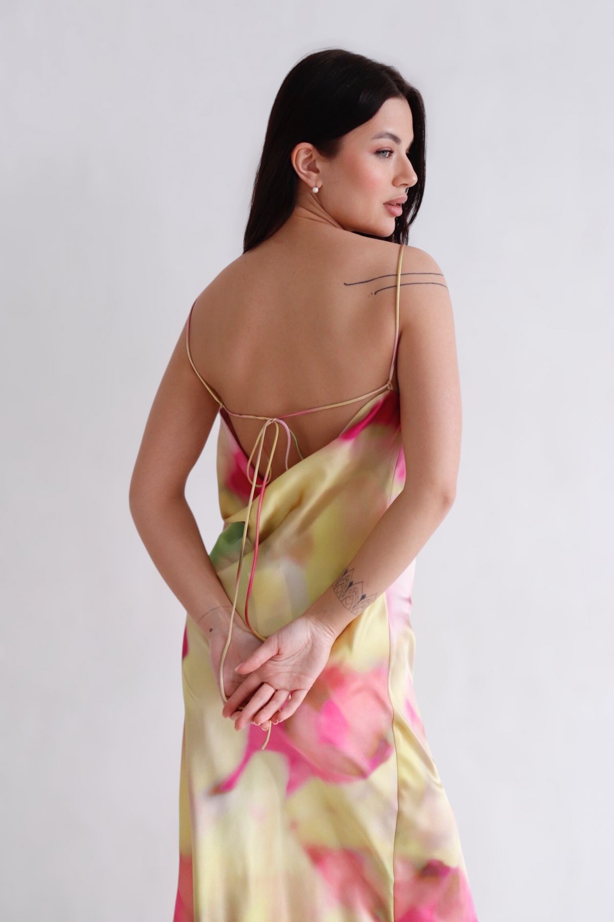 Платье-комбинация на тонких бретелях с драпировкой в зоне декольте. Спинка также с драпировкой, а бретели завязываются. Силуэт - трапеция.