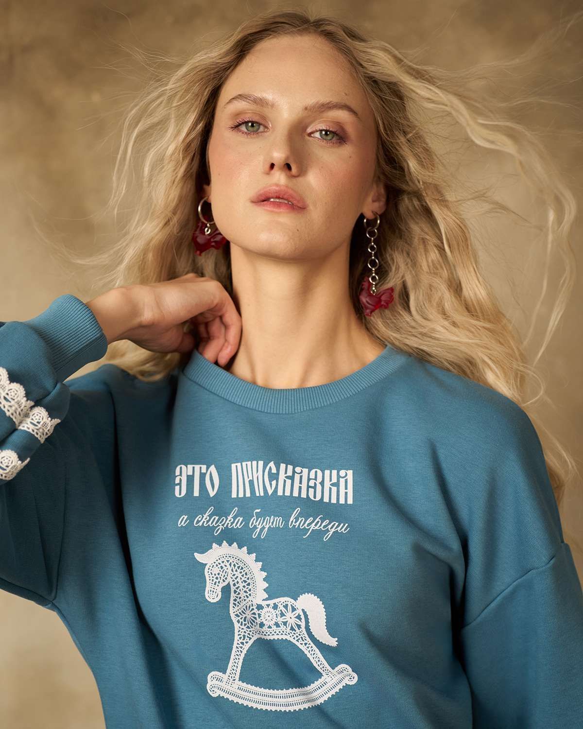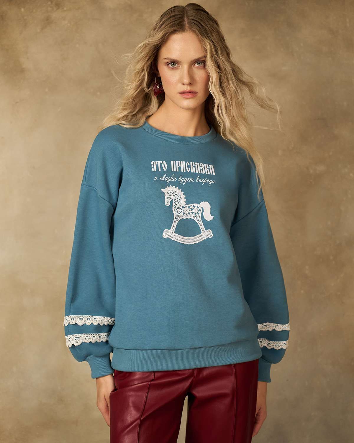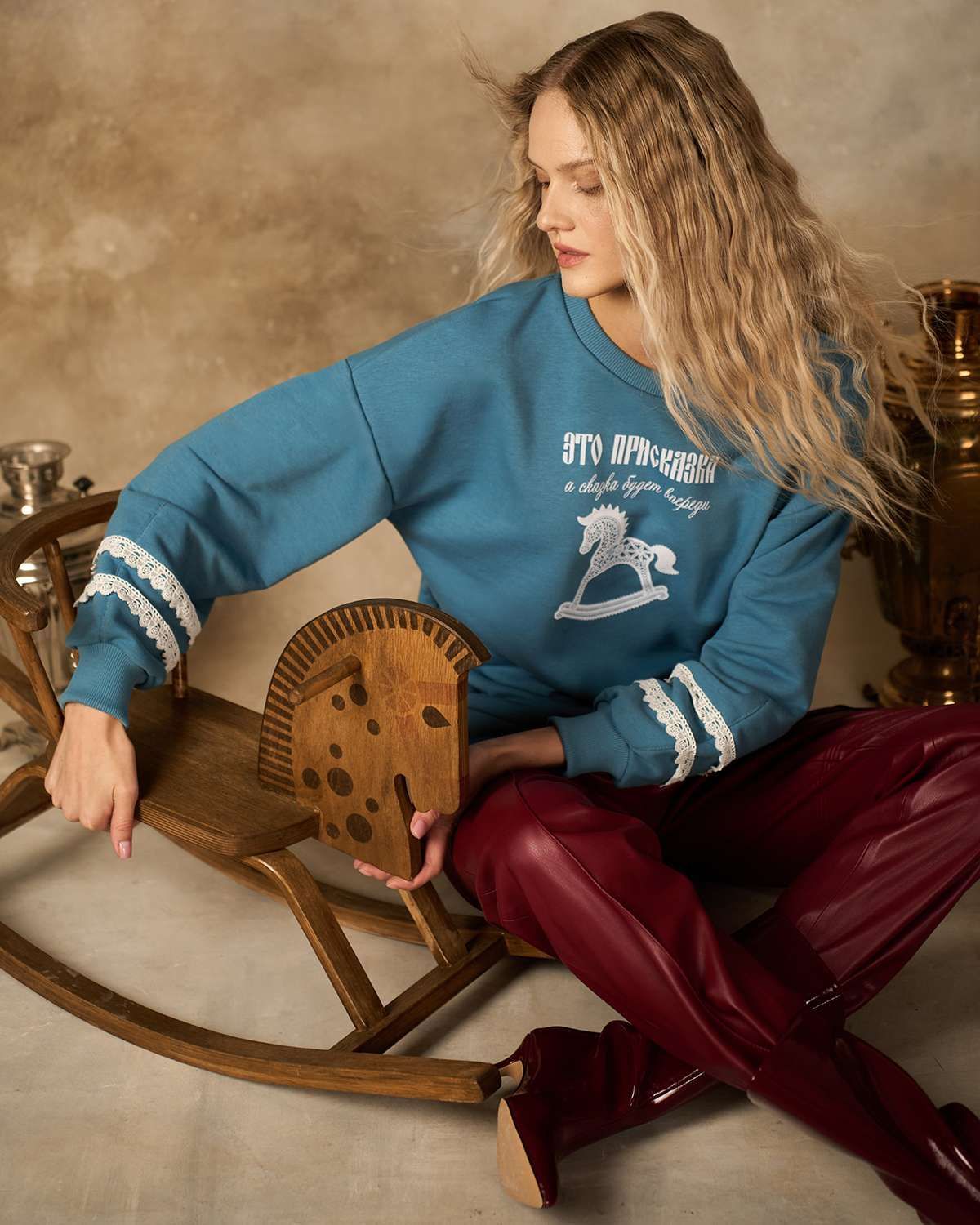 Свитшот свободного кроя с оригинальным дизайном. Его особенность — объемные рукава, придающие образу легкость и комфорт. Передняя часть украшена принтом в виде детской лошадки-качалки из белого кружева, что добавляет изделию уникальность и напоминает о традициях России, воплощая дух национального стиля. Особое внимание уделено деталям: на рукавах расположены элегантные кружевные белые полоски, гармонично сочетающиеся с цветом изделия. Цветовая гамма представлена двумя оттенками: глубоким коричневым и спокойным голубым.
