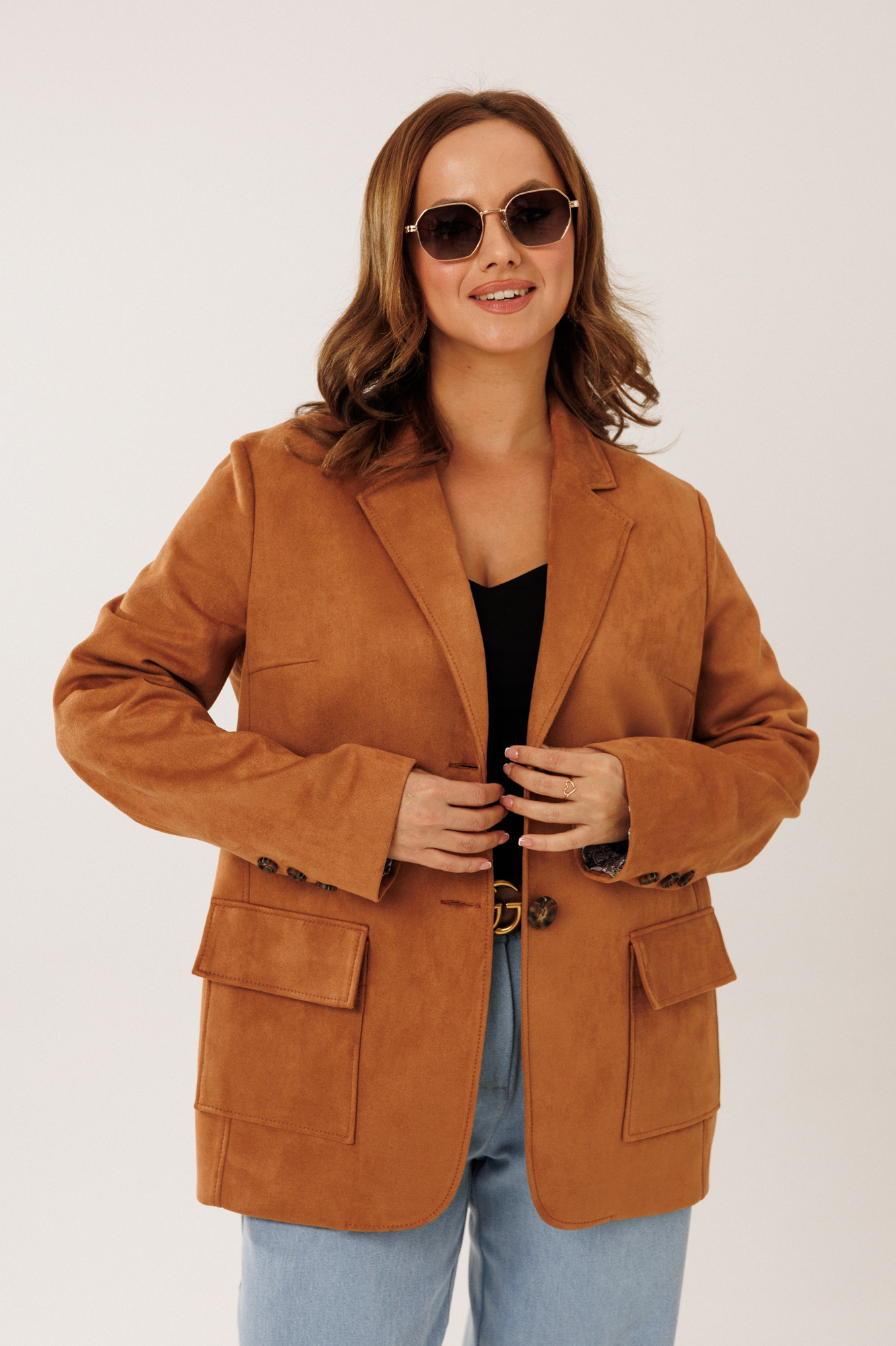 2235/1 Жакет 44-54 46 95% ПЭ, 5 % спандекс Жакет женский прямого силуэта на частичной подкладке. Жакет однобортный, длинной до середины бедра. Полочка с отрезными бочками и вытачкой. На нижней части полочки настрочены накладные карманы с клапаном. Спинка с отрезными бочками и отрезной кокеткой Рукав втачной, полной длинны. По низу рукава обработана имитация шлицы с отделочными декоративными пуговицами. Воротник в жакете втачной с отрезной стойкой и лацканами. Линия низа борта полочки скруглена. Жакет застегивается на петли пуговицы. По воротнику, лацкану, борту, карманам и швам спинки прострочены отделочные строчки. Полочки, кокетка спинки и рукава с контрастной подкладкой.Декоративные элементы и фурнитура могут отличаться от заявленных на фото. Цвет материала может отличаться по тону в зависимости от настроек вашего монитора! Длина жакета по спинке 71 см, длина рукава 61,5 см. 44-54