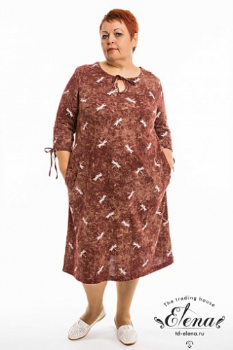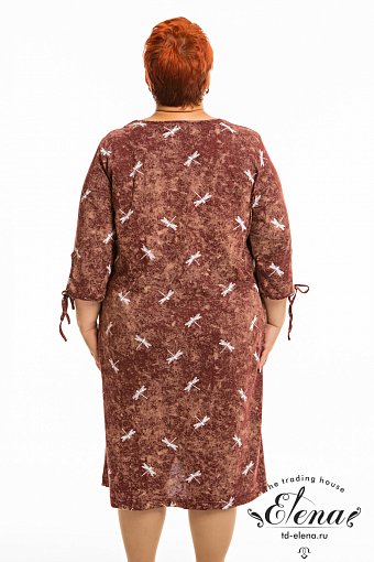 Платье из кулирки с набивным рисунком, с рукавом длиной 3/4. С карманами в боковых швах. На полочке нагрудные вытачки, декоративные "капельки" с завязками по горловине и низу рукавов.