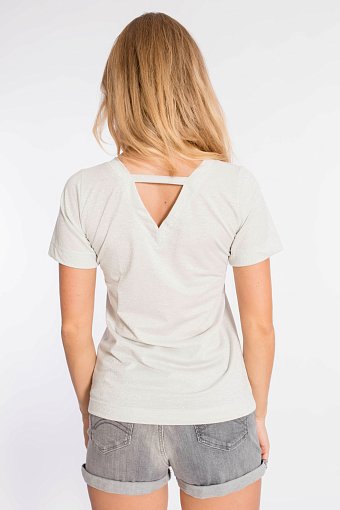 Футболка выполнена из стрейчевого полотна c люрексом. Рукава короткие. Вырез горловины спереди круглый, а сзади V-образный с декоративной планкой.