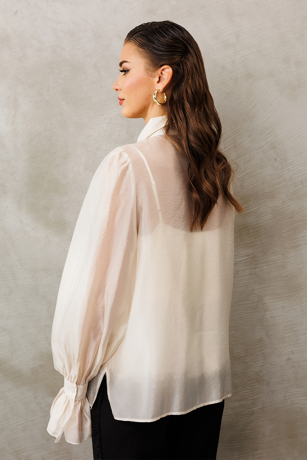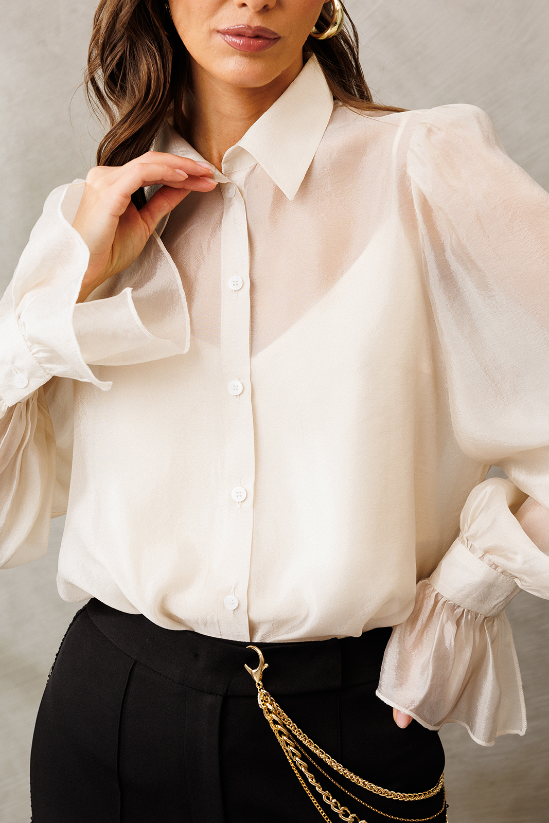 3131 77% вискоза, 23% ПЭ Блузка 4100 42-52 170 сливочный Блузка из креп-шифона с напылением. Прямого силуэта, с втачным рукавом вверху со сборкой внизу на манжете с застежкой на петлю-пуговицу и рюшей на манжете. Полочка с центральной застежкой на петли-пуговицы на цельнокроеной планке. Воротник рубашечный отложной на стойке. Внизу по боковым швам обработаны разрезы. К блузке идет в комплект атласный топ на регулируемых бретелях прямого силуэта, на широкой обтачке. Полочка с V-образным вырезом и нагрудной вытачкой.