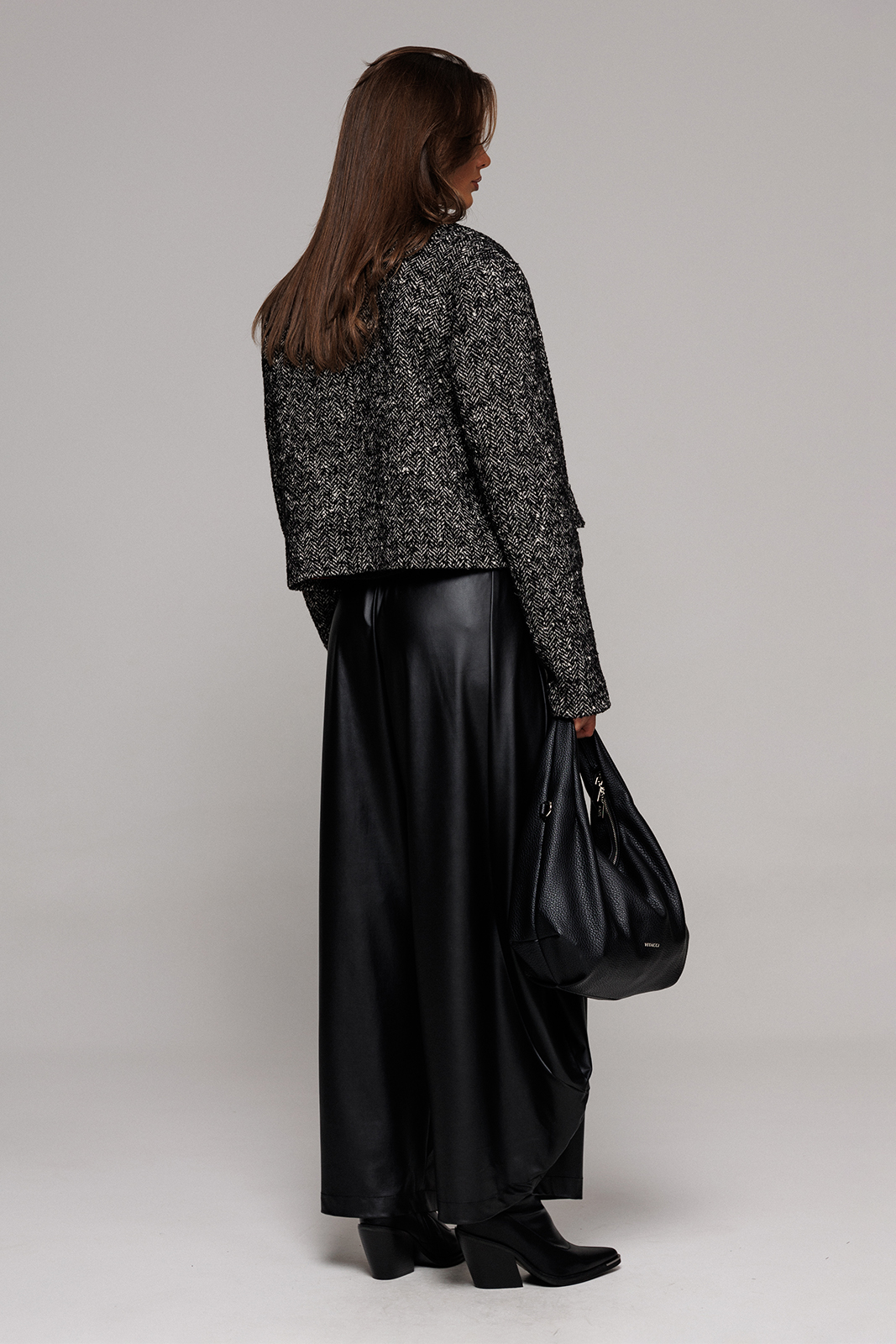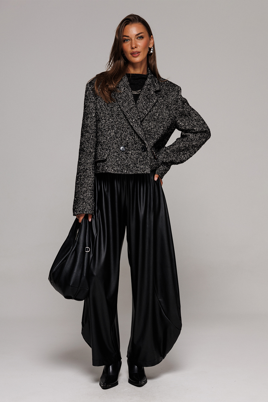 3153 80% ПЭ, 20% шерсть Жакет 6100 42-52 170 темно-серый Жакет укороченный прямого силуэта, двубортный с втачным двухшовным рукавом. Полочка с застежкой на петлю-пуговицу и имитацией кармана с клапаном и отрезным бочком. Спинка с отрезным бочком и центральным швом. Воротник пиджачного типа с отрезной стойкой. Жакет на подкладке.