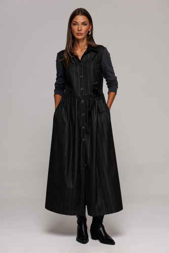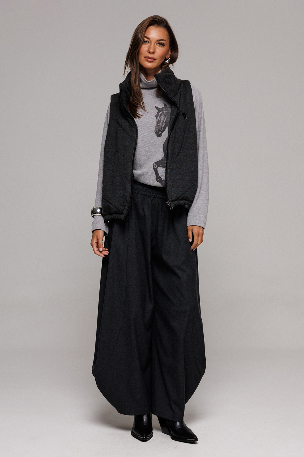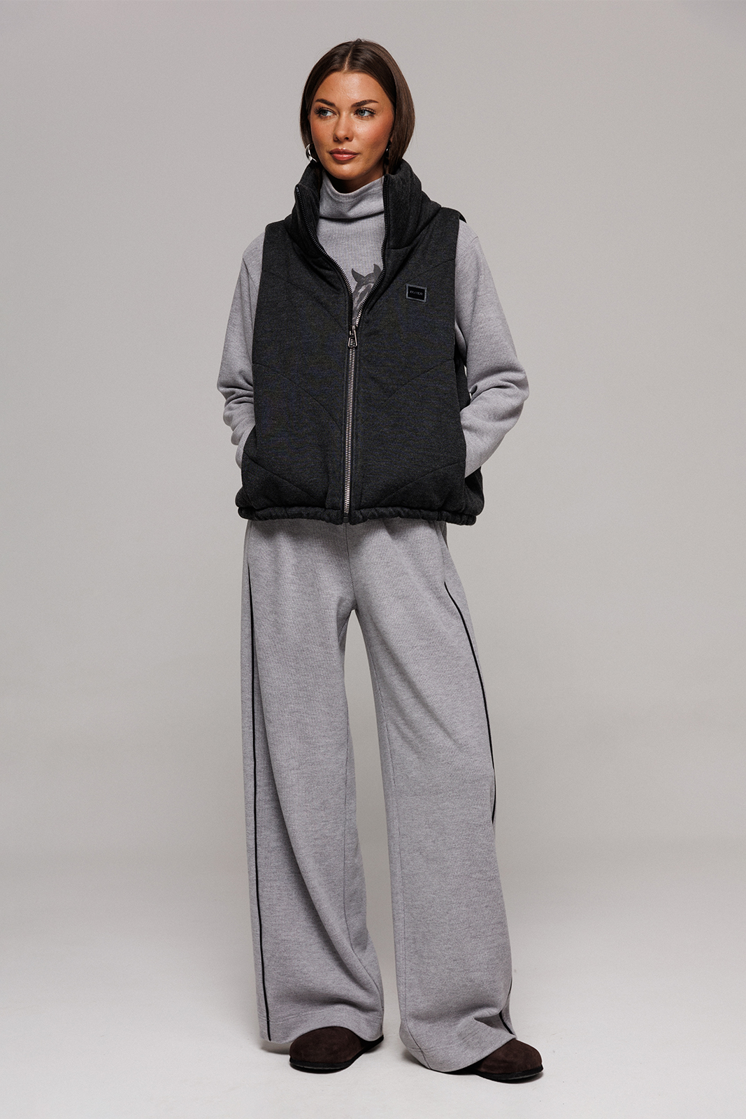 3164 38% вискоза, 33% ПАН, 24% ПЭ, 5% шерсть Жилет 4900 42-54 170 графит Жилет короткий свободного силуэта слегка заужен к низу. Полочка с центральной застежкой на тесьму-молнию, с отрезным бочком и карманом в шве притачивания бочка. По низу жилета вставлена эластичная тесьма с фиксатором на спинке. Воротник стойка с нашивкой "BUTER" по спинке, и на бочке. Жилет из трикотажного полотна с фигурной стежкой на синтепоне (isosoft 150г/м²) и подкладке.