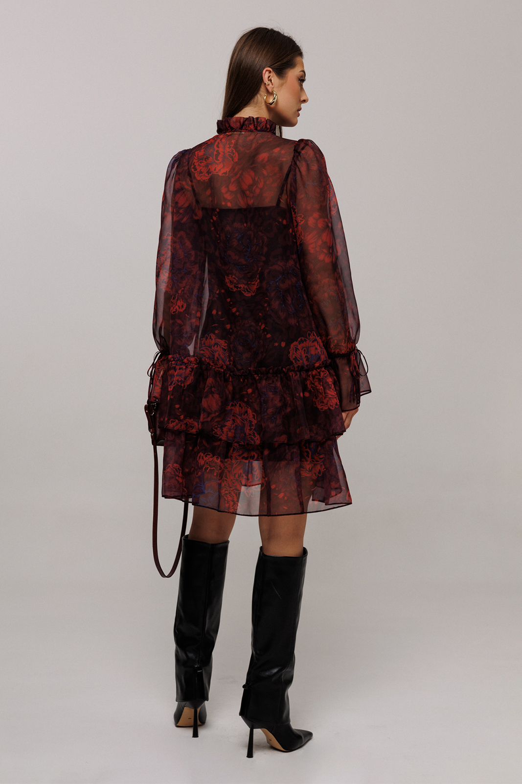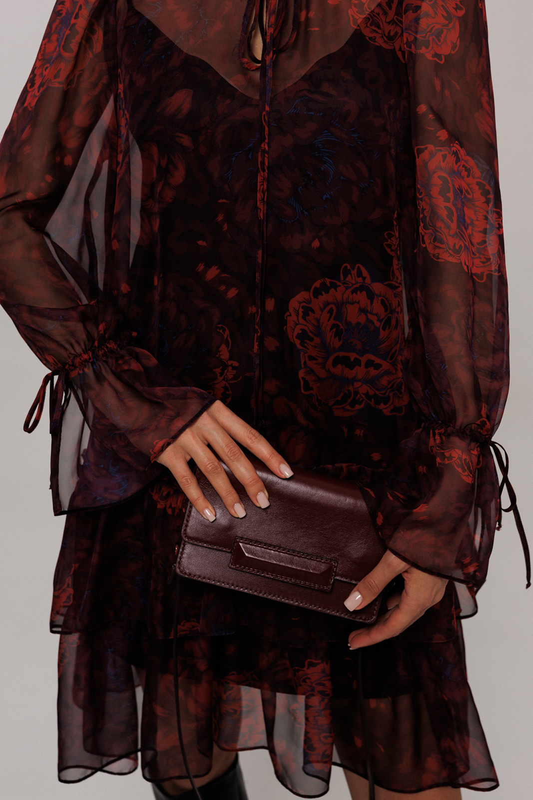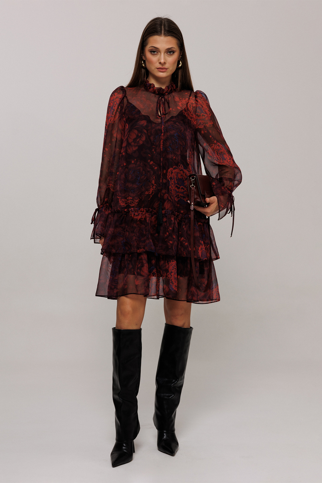 3174 100% ПЭ Платье 4700 42-52 170 бордовый Платье шифоновое А-силуэта. Втачной длинный рукав со сборкой по окату и внизу на завязке. Полочка и спинка с притачными слегка присборенным воланом с рюшей. Воротник стойка-рюша и вырезом каплей по переду на завязке. Платье на подкладке.