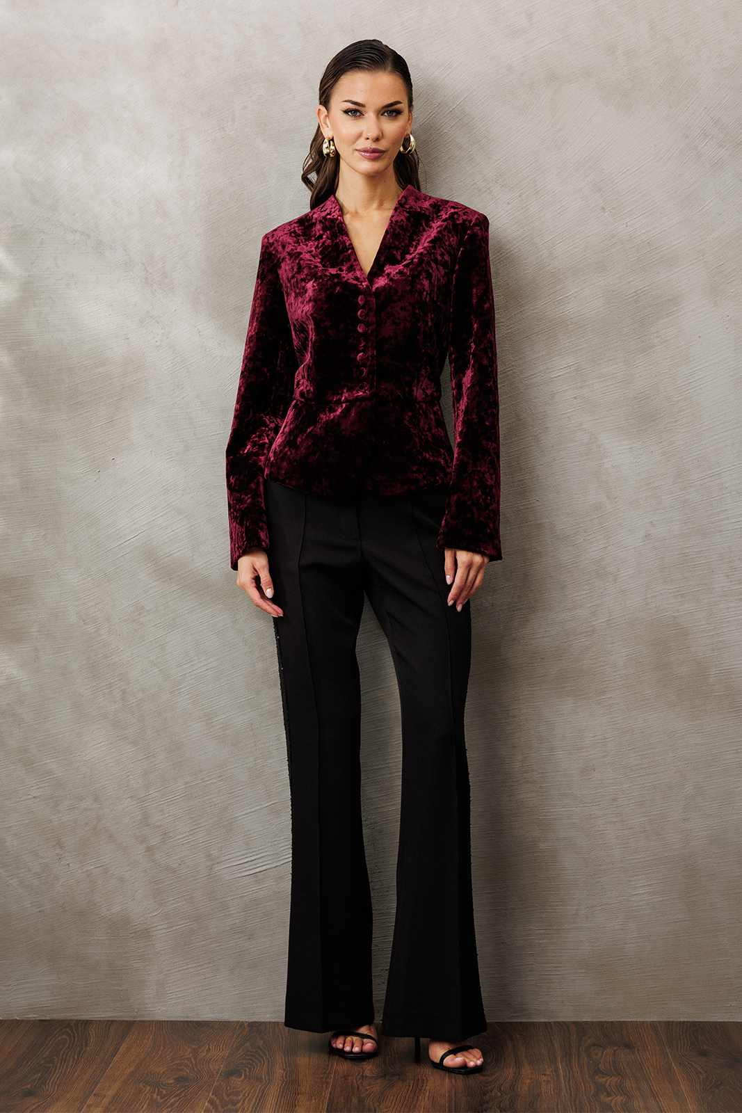 3188 100% ПЭ Жакет 4300 42-54 170 бордовый Жакет из велюровой ткани полуприлегающего силуэта, с втачным двухшовным рукавом. Полочка и спинка с отрезной баской по линии талии. Полочка с V-образным вырезом, однобортной застежкой на петли пуговицы и талиевой вытачкой от баски. Спинка с центральным швом. Жакет с отрезным бочком, переходящим на полочку и на спинку. Жакет на подкладке.