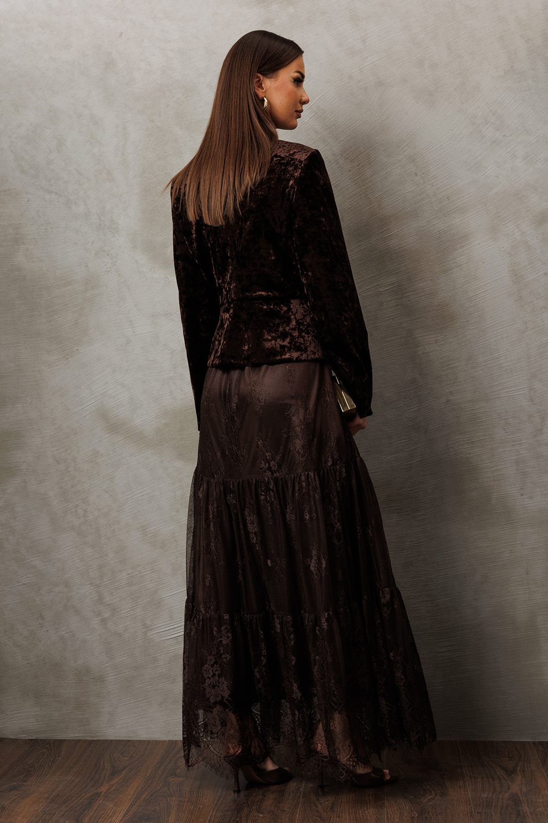 3233 100% ПЭ Юбка 4700 42-54 170 коричневый Юбка из кружева длинная на притачном поясе из кружева со вставленной в него резинкой. Юбка с 2-мя притачными слегка присборенными воланами. Юбка на подкладке.