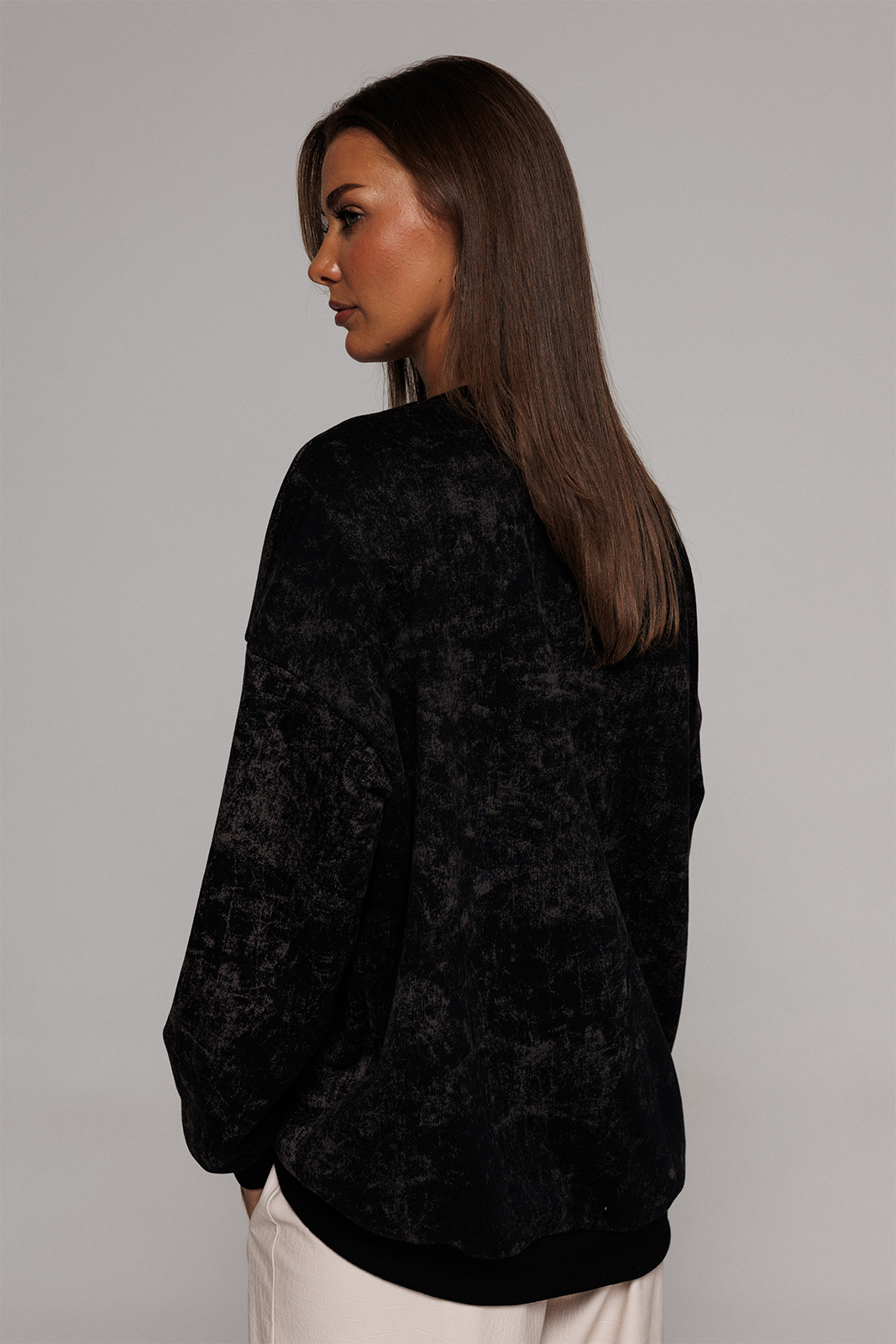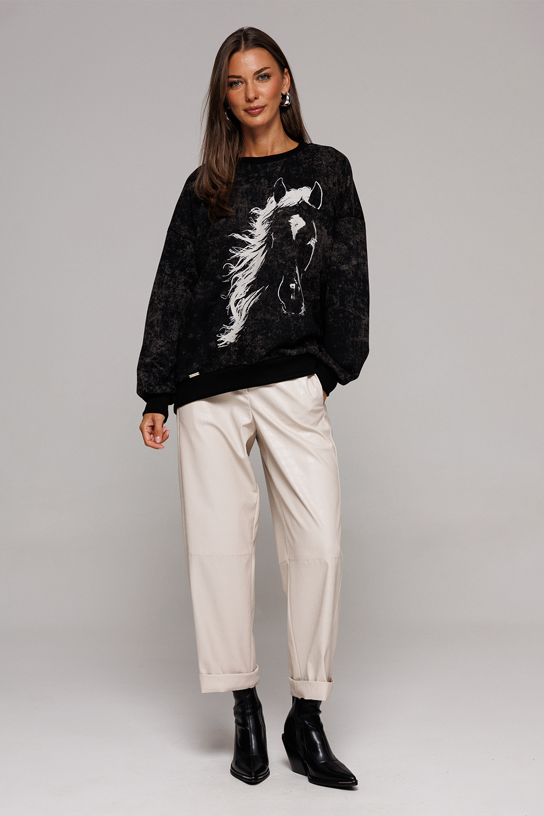 3191 Хлопок 100% Джемпер 3700 42-54 170 черный мрамор Джемпер из трикотажного полотна свободного силуэта, слегка заужен к низу, с втачным рукавом и спущенной линией плеча, с манжетой из отделочной ткани по низу рукава. По переду печать "HORSE" и нашивка с гравировкой "BUTER", низ фигурный. Спинка длиннее переда. По горловине и низу изделия притачная планка из довяза.