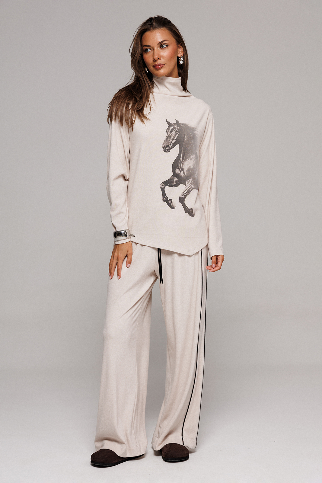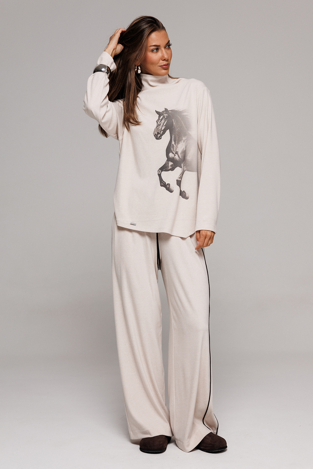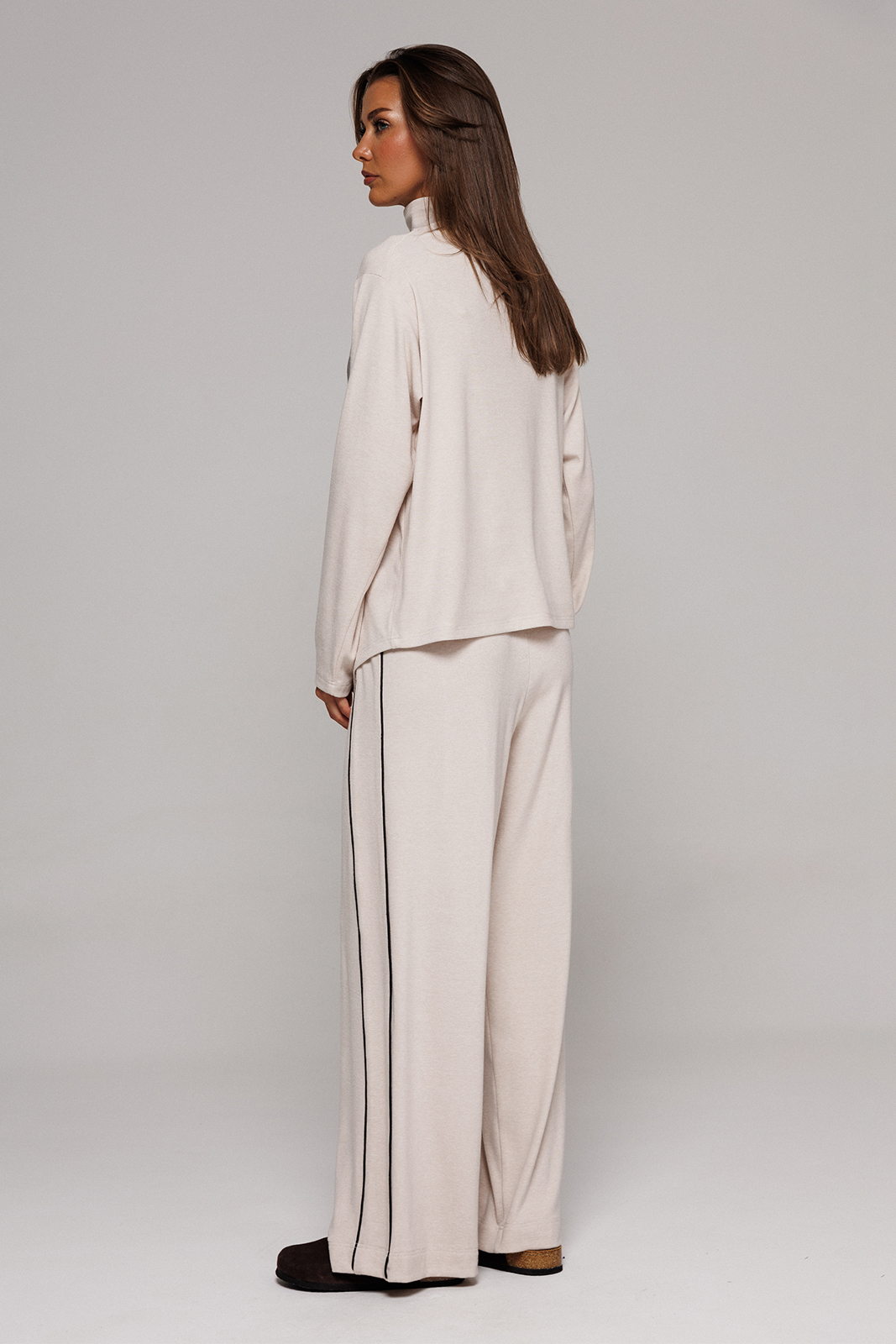 3190 47% вискоза, 27% ПЭ, 20% ПА 6% спандекс Брюки 3500 42-54 170 бежевый Брюки из трикотажного полотна прямого силуэта на цельнокроеном отстроченном поясе со вставленной в него резинкой и декоративным шнурком. Справа отрезной бочок с кантом, слева в боковом шве карман.