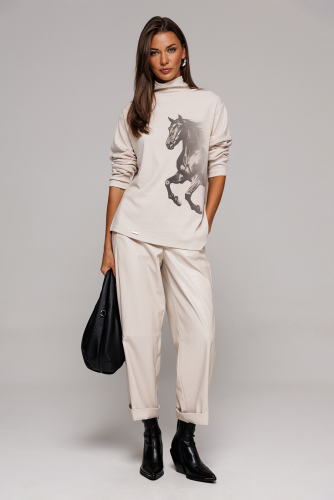 3193/1 47% вискоза, 27% ПЭ, 20% ПА 6% спандекс Джемпер 3500 42-54 170 бежевый Джемпер из трикотажного полотна с велюровым эффектом прямого силуэта со спущенной линией плеча. Рукав втачной. По переду печать "Лошадь" и нашивка с гравировкой "BUTER". Низ джемпера по переду фигурный ассиметричный. Внизу по правому боковому шву обработан разрез. Воротник-стойка цельнокроеный.