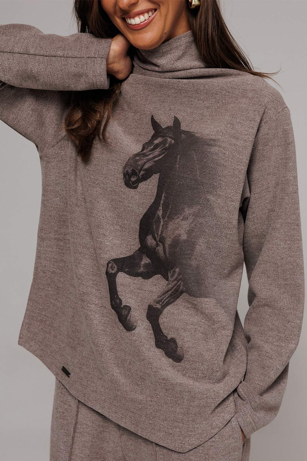 3193 60% вискоза, 35% ПЭ, 5% спандекс Джемпер 3500 42-54 170 капучино Джемпер из трикотажного полотна с велюровым эффектом прямого силуэта со спущенной линией плеча. Рукав втачной. По переду печать "Лошадь" и нашивка с гравировкой "BUTER". Низ джемпера по переду фигурный ассиметричный. Внизу по правому боковому шву обработан разрез. Воротник-стойка цельнокроеный.