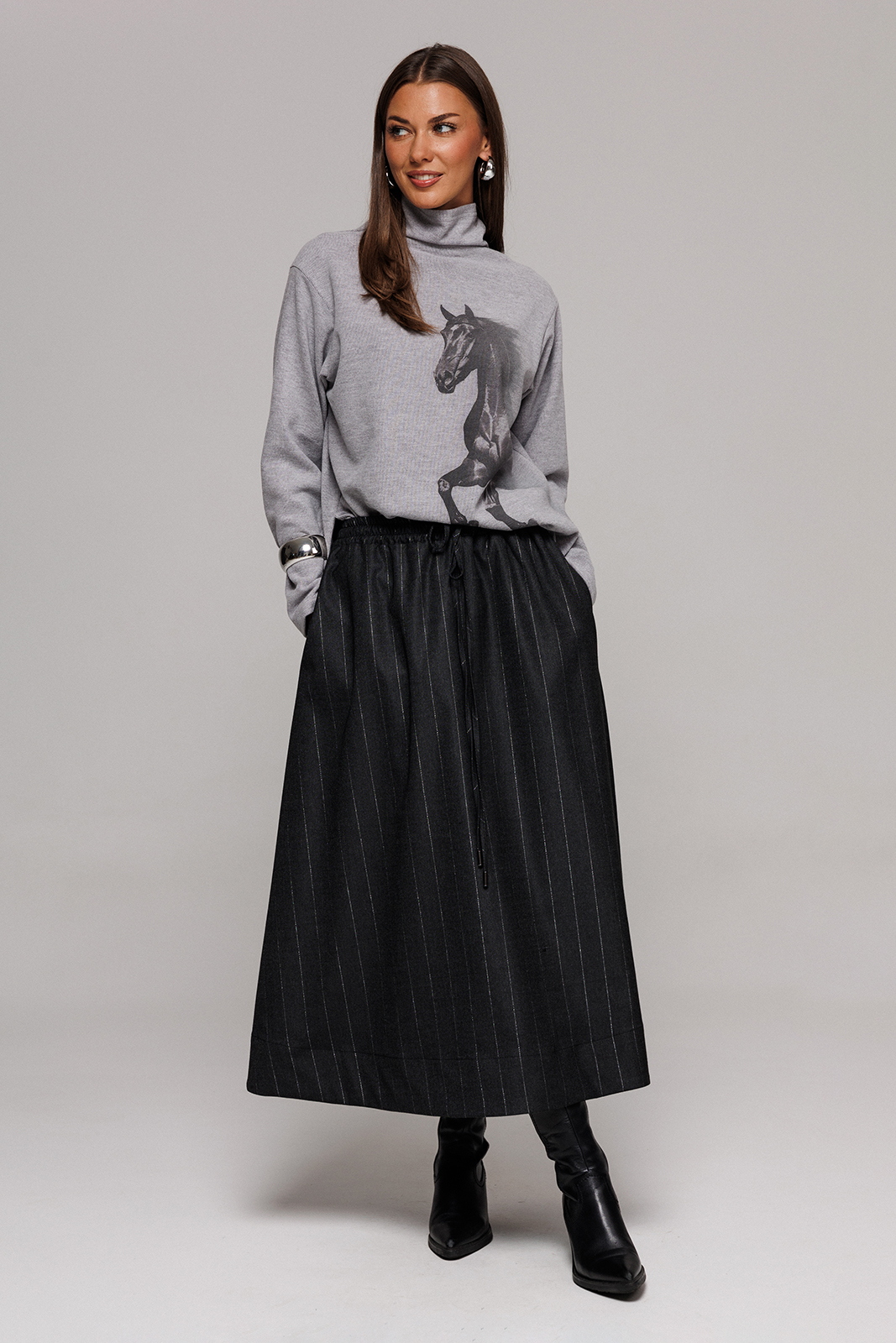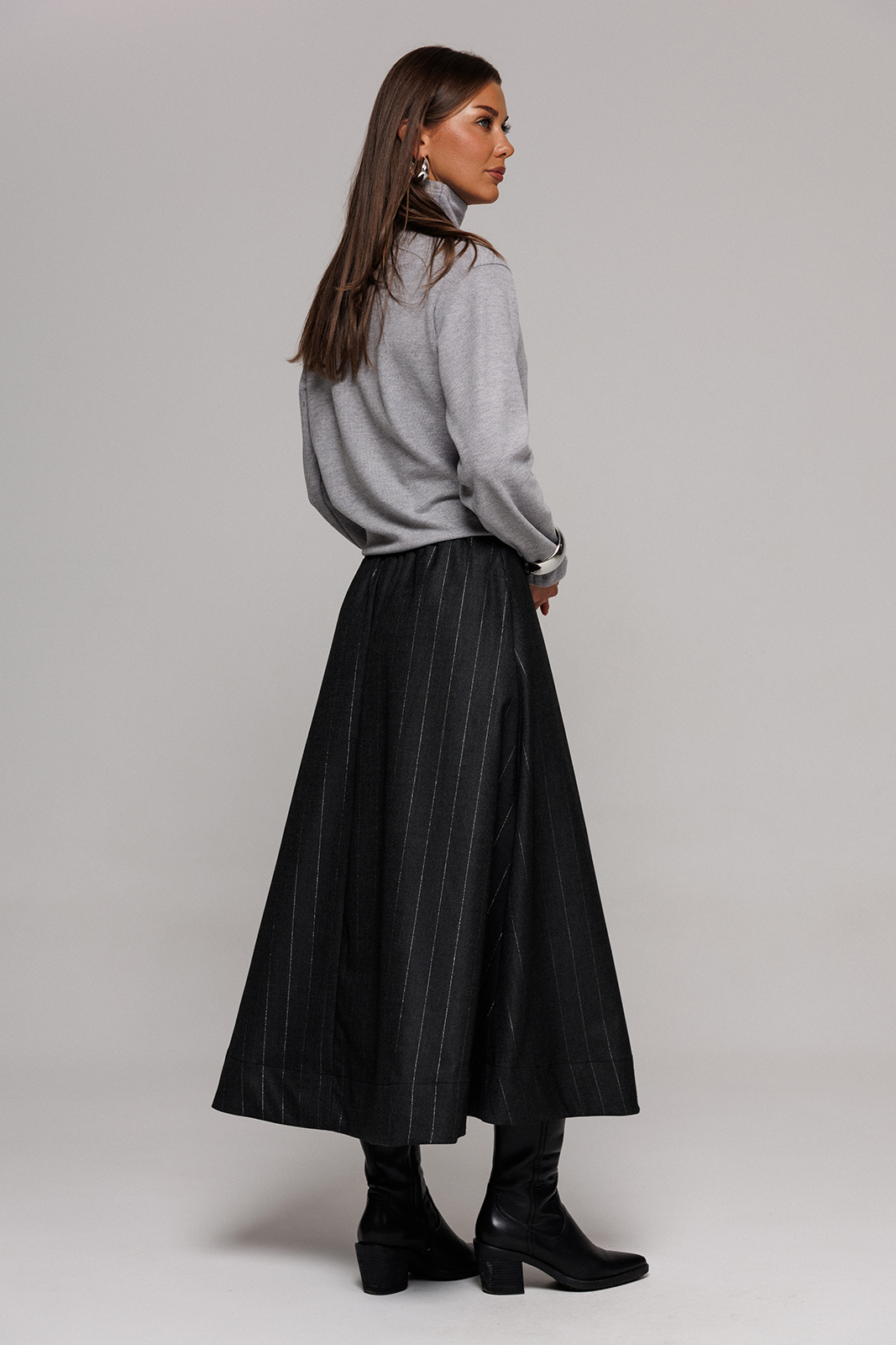 3199 70% ПЭ, 28% вискоза, 2% спандекс Юбка 3900 42-54 170 темно-серый Юбка длиной миди из костюмной ткани в полоску из люрекса. А-силуэта на притачном отсроченном поясе на резинке со втянутым в него шнурком с наконечниками и карманами в боковых швах. По переду внизу нашивка "BUTER". Юбка без подкладки