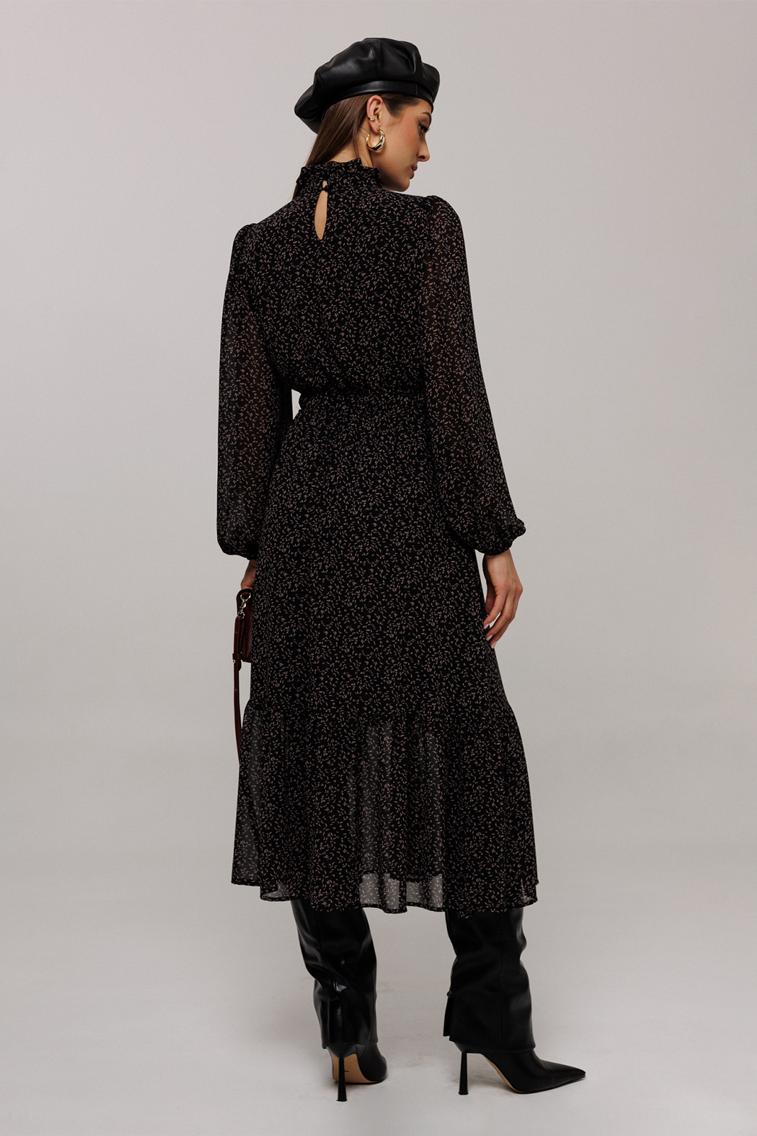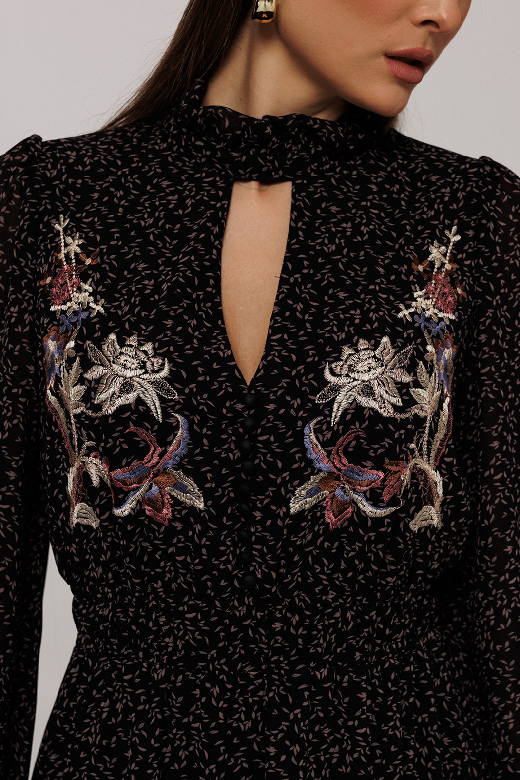 3209 100% ПЭ Платье 4700 42-54 170 черный Платье полуприлегающего силуэта отрезное по линии талии, нижняя часть расширена к низу. Платье с втачным рукавом со сборкой по окату и внизу на резинке. Лиф с V-образным вырезом и имитацией центральной застежкой на пуговицы. По спинке и переду выставка на талии с резинками и по низу платья волан. По горловине стойка с рюшей и застежкой на навесную петлю пуговицу на спинке. Платье на подкладке.