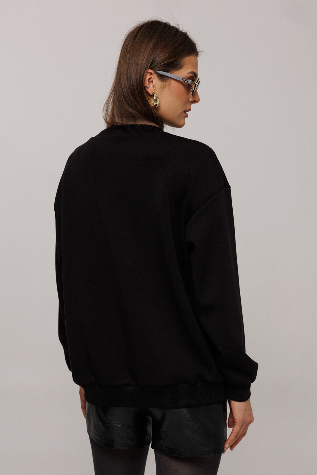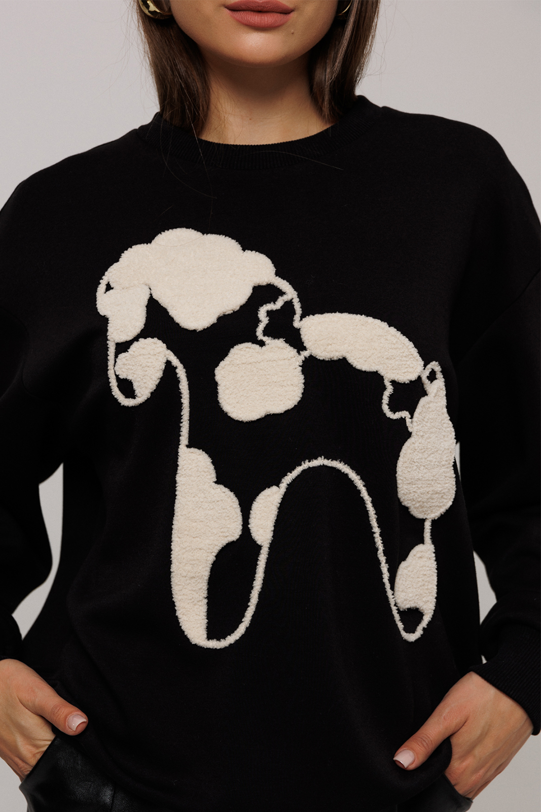 3212 54% ПЭ, 40% вискоза, 6% спандэкс Джемпер 3600 42-52 170 черный Джемпер из технологичного трикотажного полотна с эффектом peach. Прямого силуэта с втачным рукавом и спущенной линией плеча, с манжетой из отделочной ткани по низу рукава. По переду вышивка "Лошадка". По горловине и низу изделия притачная планка из отделочной ткани.