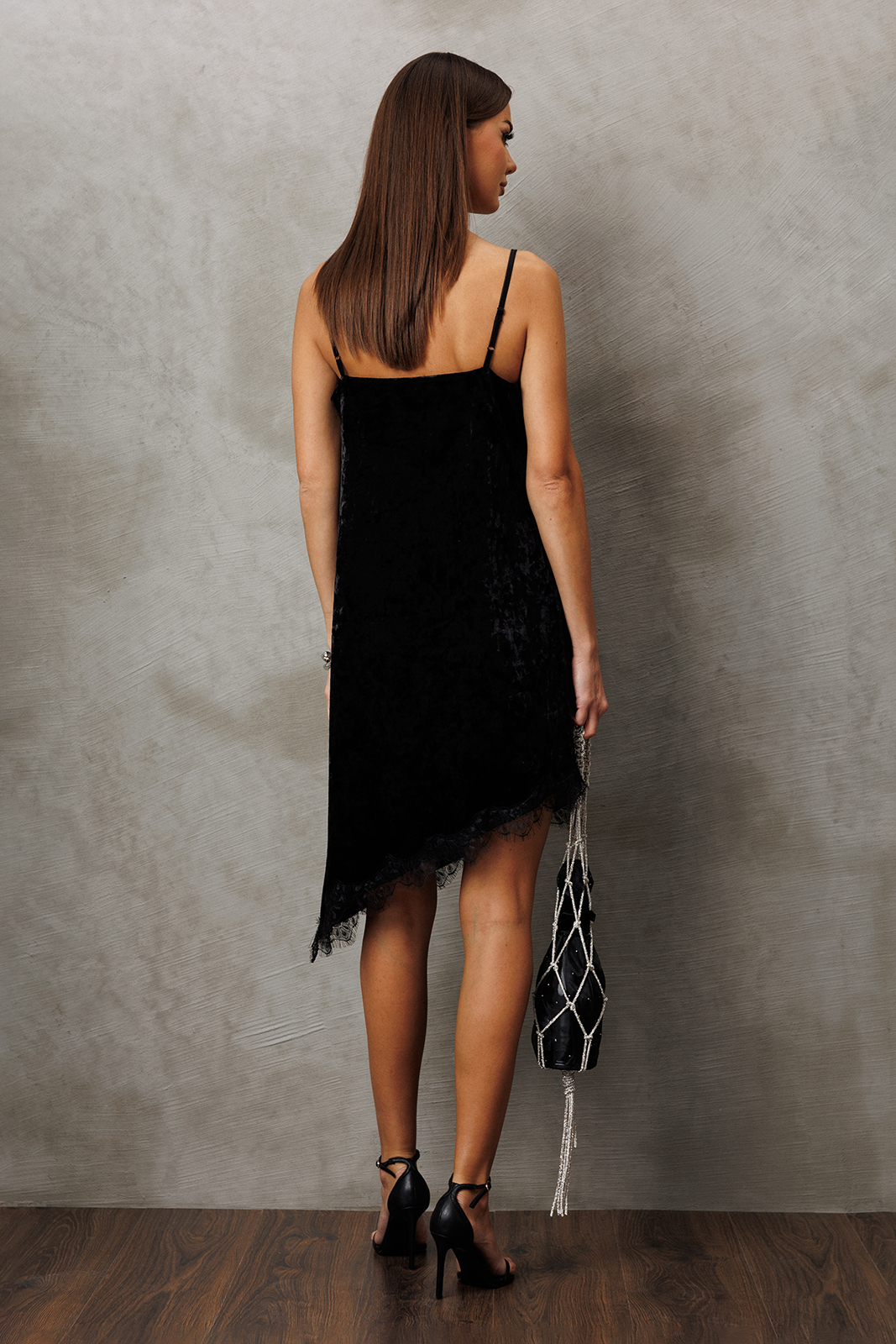 3236 100% ПЭ Платье 3900 42-50 170 черный Платье из велюра с кружевом на регулируемых бретелях и асимметричным низом. Платье полуприлегающего силуэта, верху на широкой обтачке. Полочка с V-образным вырезом и кружевом по вырезу и нагрудной вытачкой. По низу платья кружево.