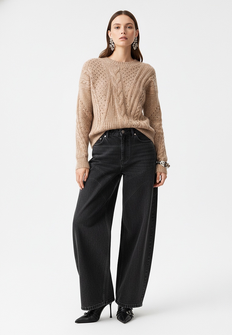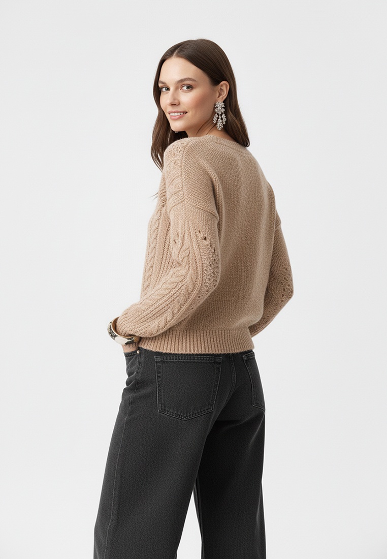 Вязанный джемпер прямого силуэта с круглой горловиной. Рукав втачной рубашечного покроя, со спущенной линией плеча.