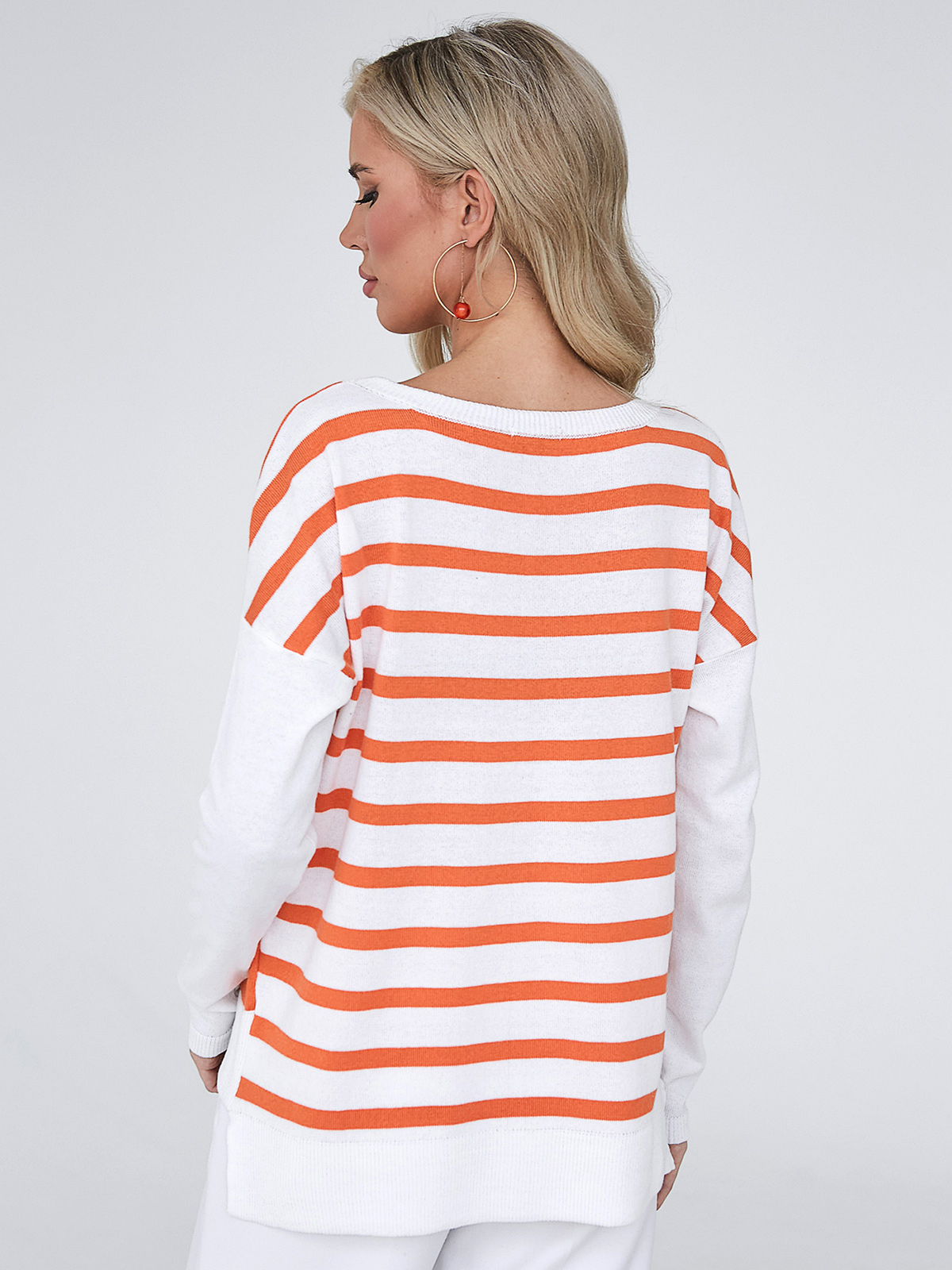 Этот лёгкий хлопковый джемпер с удлинённой спинкой - воплощение стиля и комфорта. Прямой силуэт оверсайз придаёт ему особую элегантность, а длина до линии бедра спереди и на 20 см длиннее сзади создаёт неповторимый образ. V-образный вырез горловины и линия плеча, опущенная, как у рубашки, завершают стильный вид изделия. Рукав стандартной длины добавляет изысканности этому универсальному предмету гардероба.