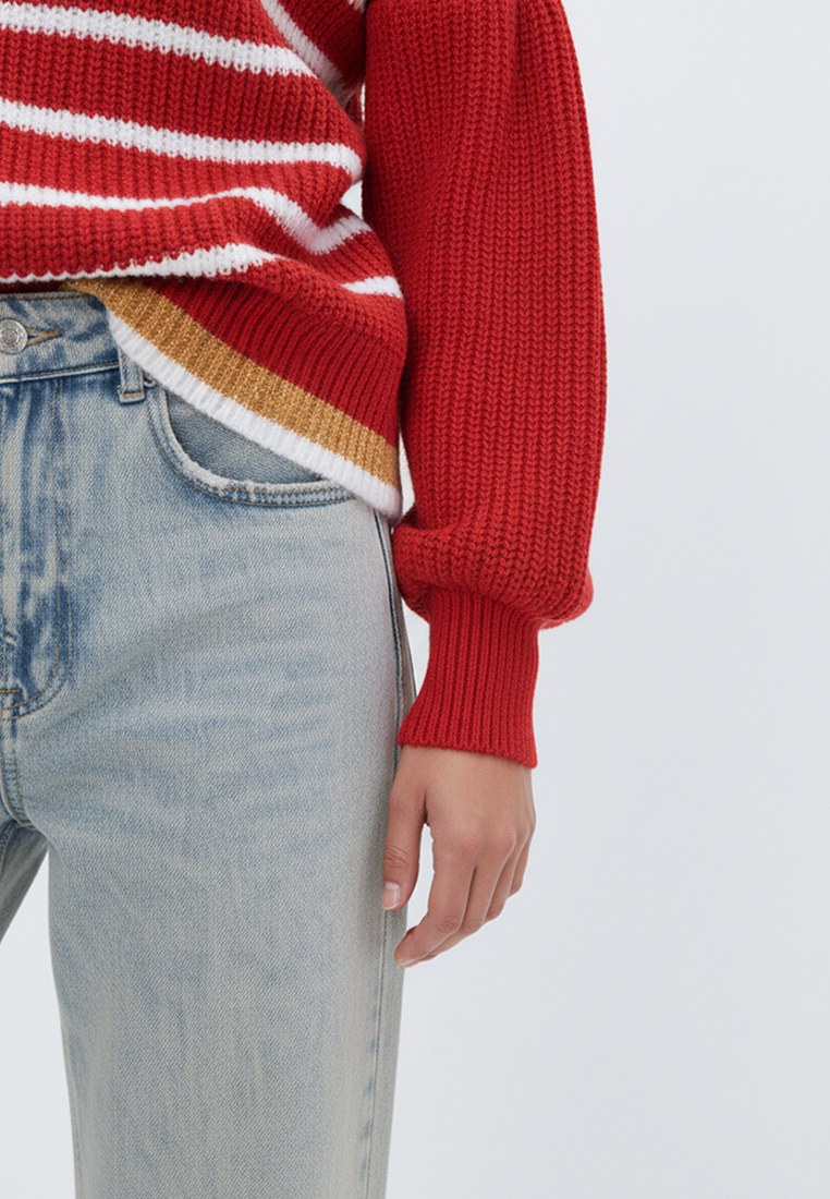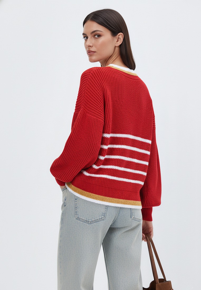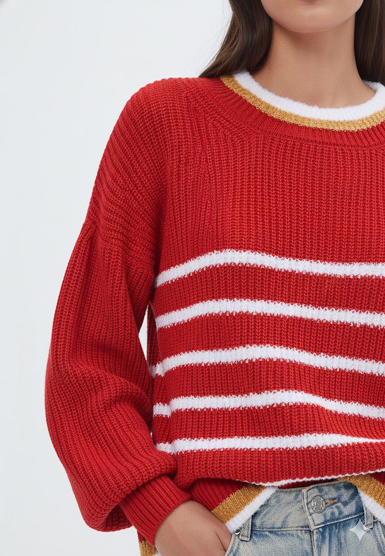 Вязаный джемпер из шерстяной пряжи с фактурными контрастными полосками, прямого свободного покроя немного оверсайз. Длина изделия до линии бедра.