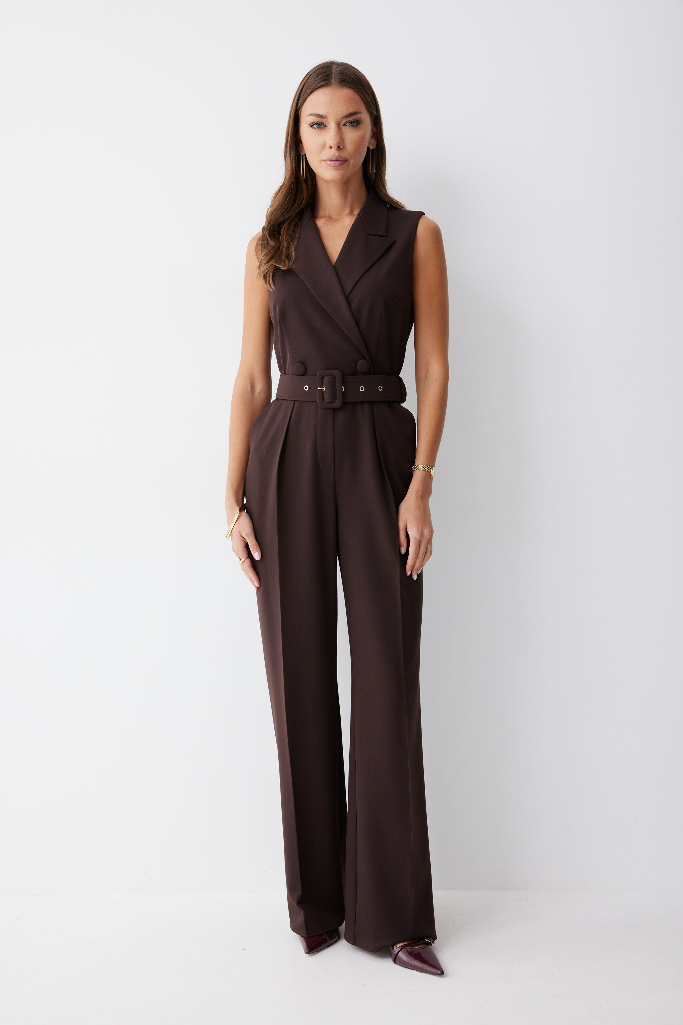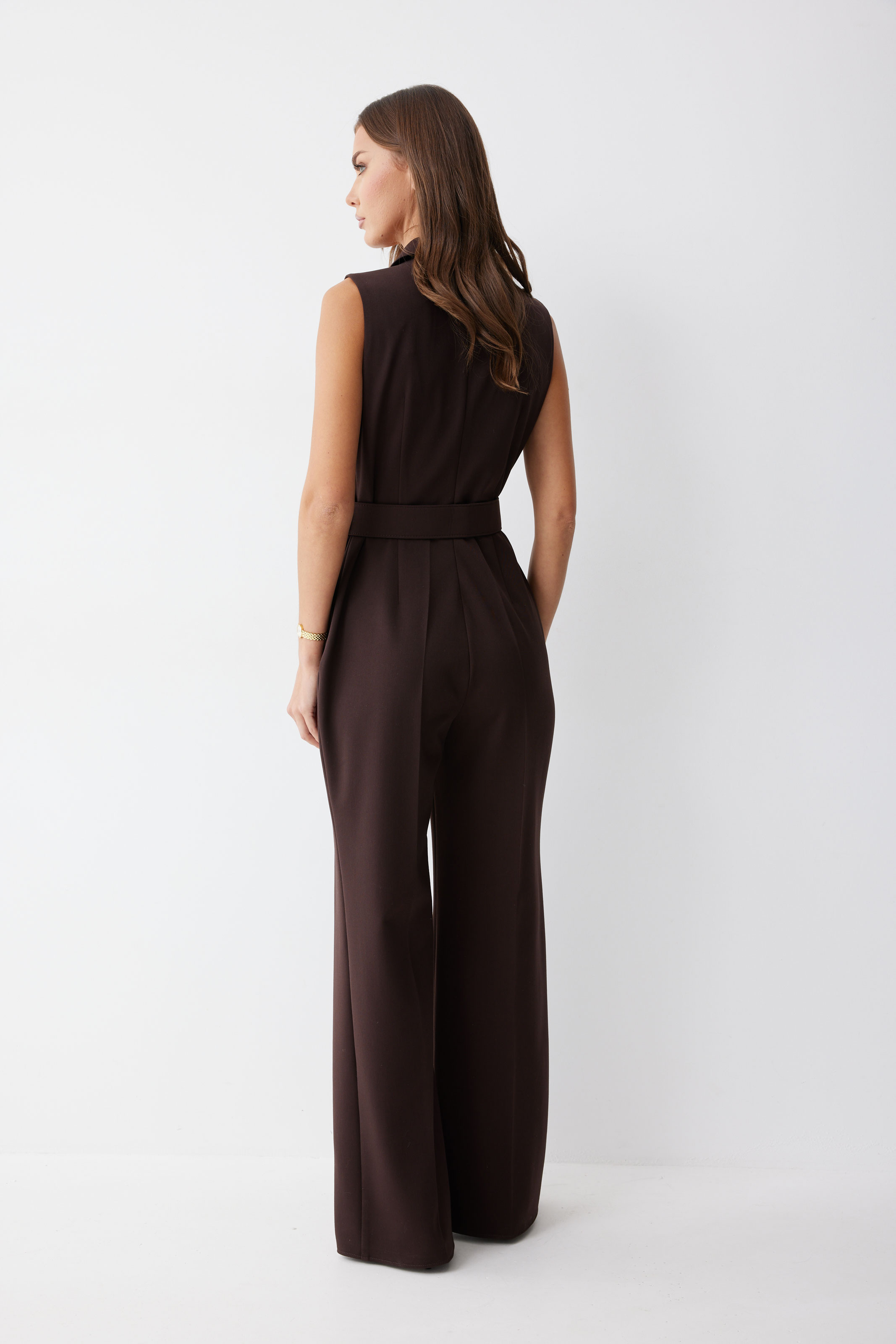 Комбинезон 4211 (коричневый) 3485 42-52 Комбинезон полуприлегающего силуэта из костюмной ткани. Воротник пиджачного типа. Комбинезон отрезной по линии талии, верхняя часть комбинезона на запах. На спинке в среднем шве застежка на потайную молнию. В боковых швах карманы. По переду на лифе талиевые и нагрудные вытачки, на брюках декоративные складки. На спинке лифа талиевые вытачки. В комплект входит ремень. Обращаем ваше внимание, что фурнитура может отличаться от фото. Длина комбинезона (42-46р - 154см)(48-52р - 157см)