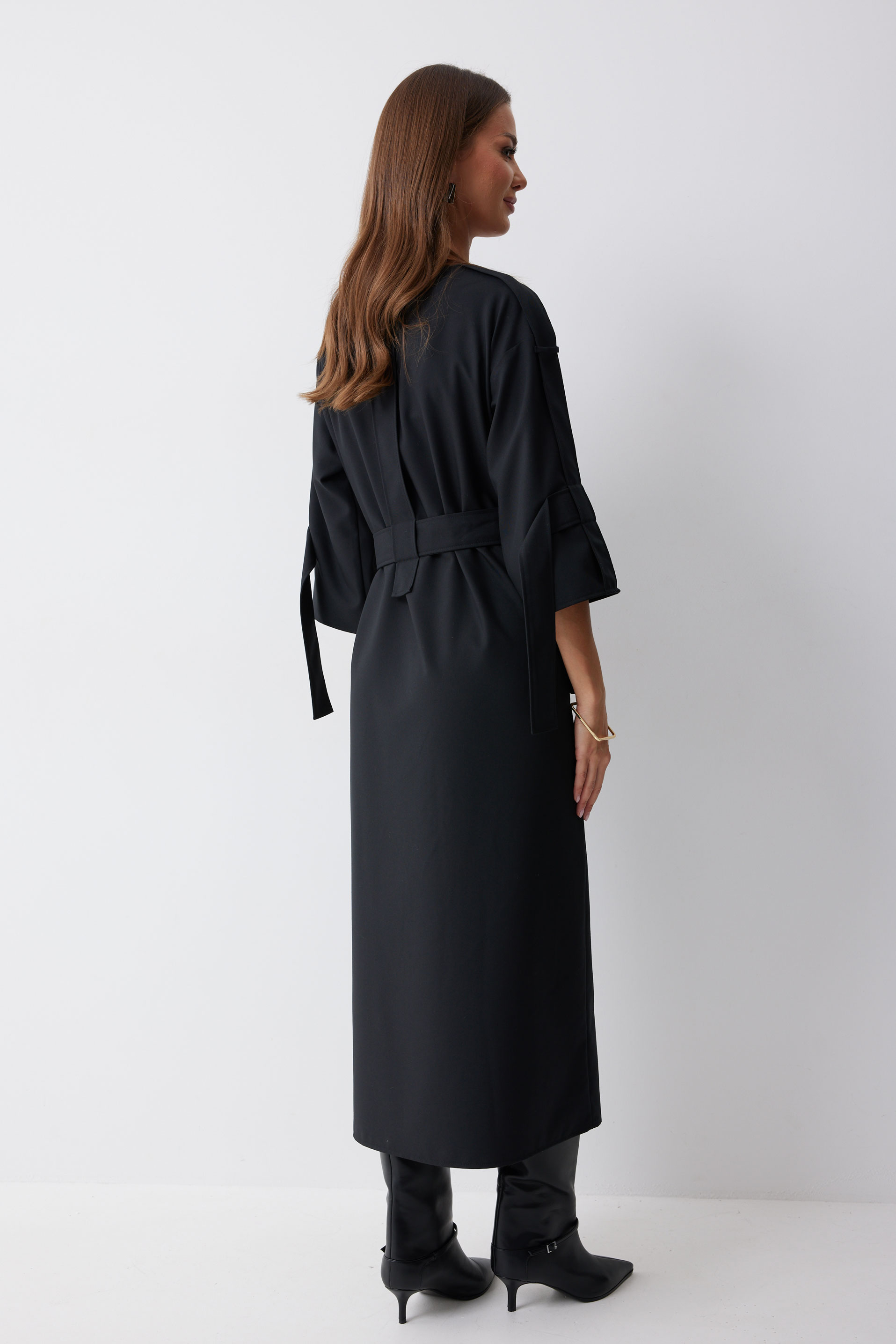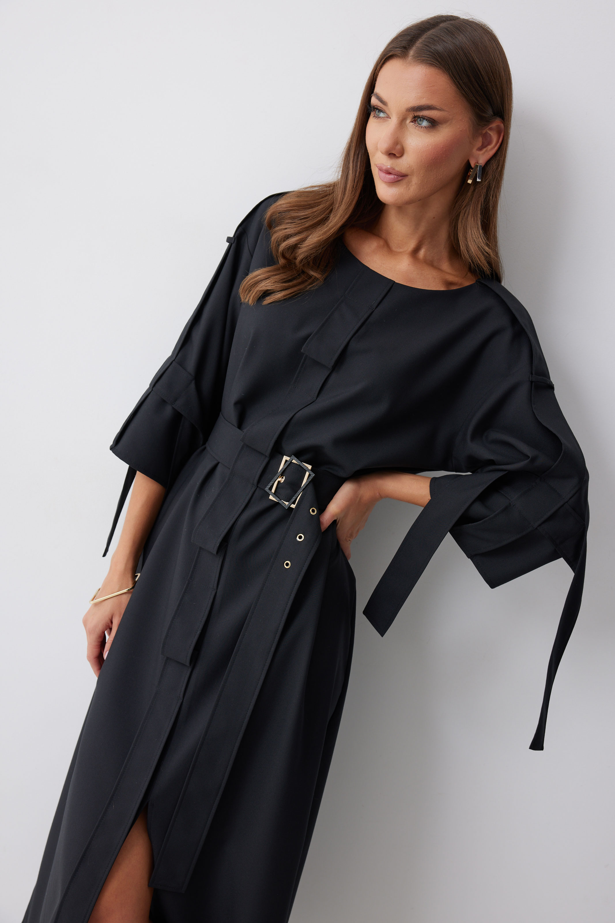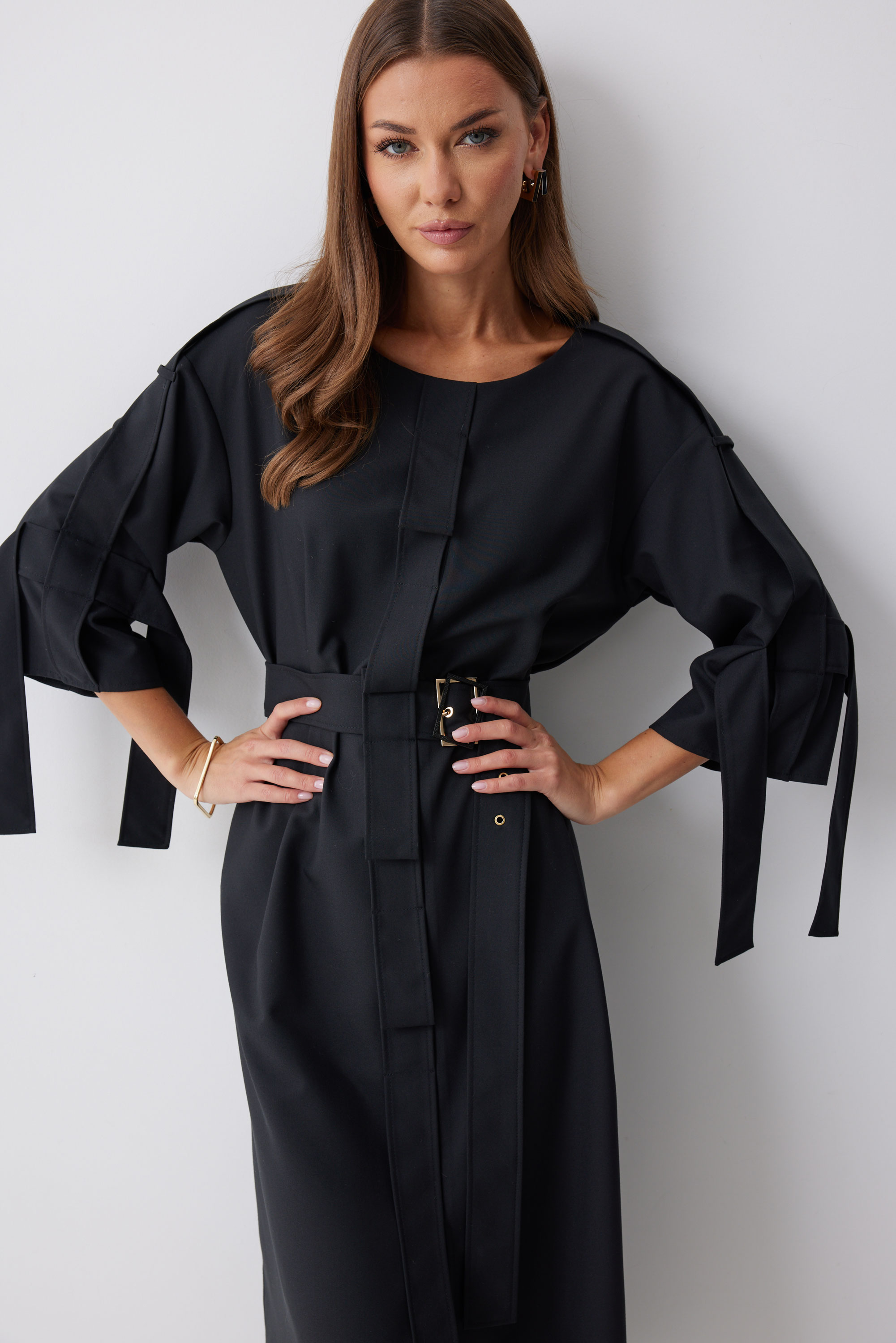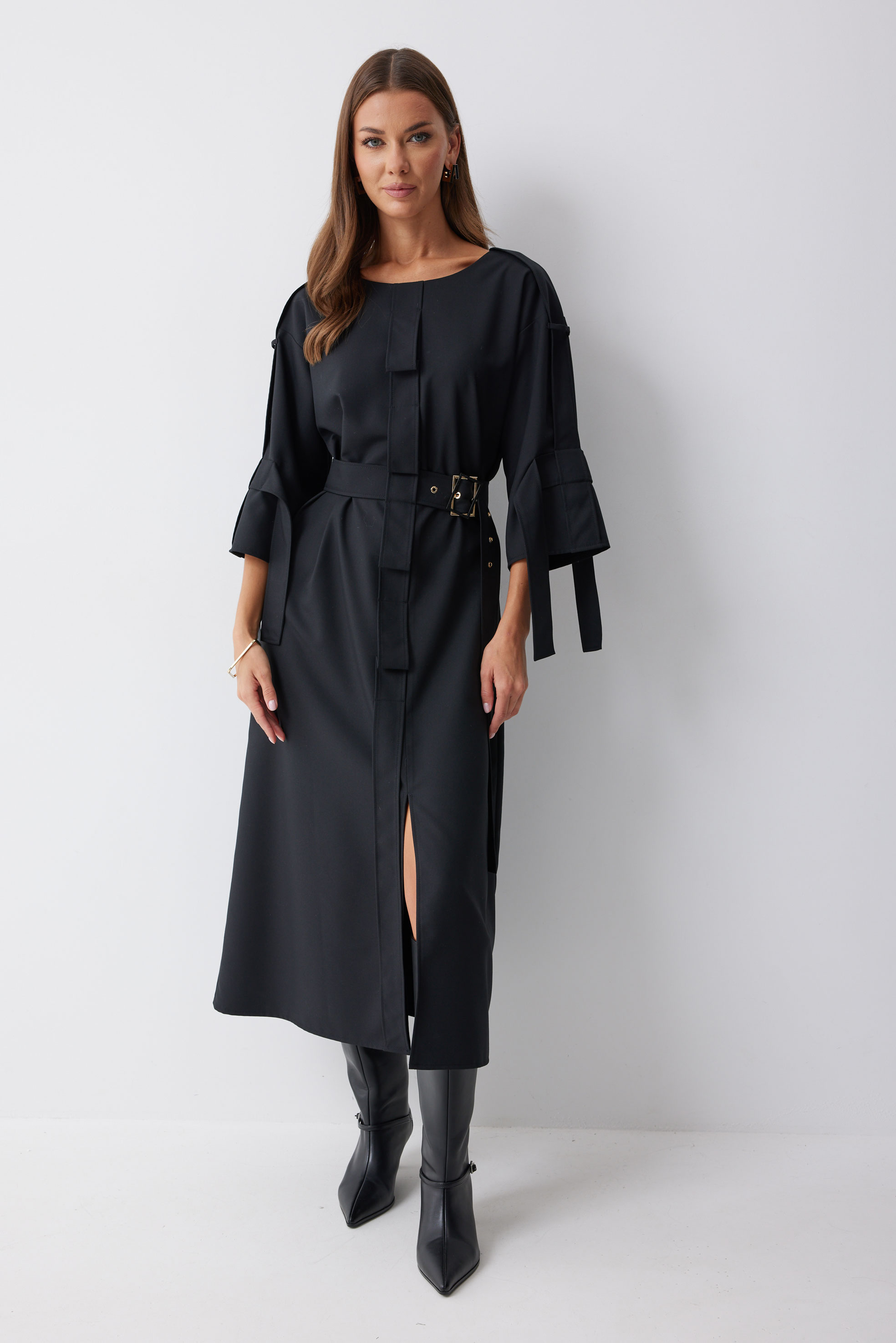 Платье 4212 (черный) 3230 44-48 Платье прямого силуэта из костюмной ткани. Горловина округлая. Рукав со спущенной линией плеча длиной 7/8. По переду и спинке по центру декоративный элемент. В комплект входит съемный ремень. Обращаем ваше внимание, что фурнитура может отличаться от фото. "Длина платья 123см