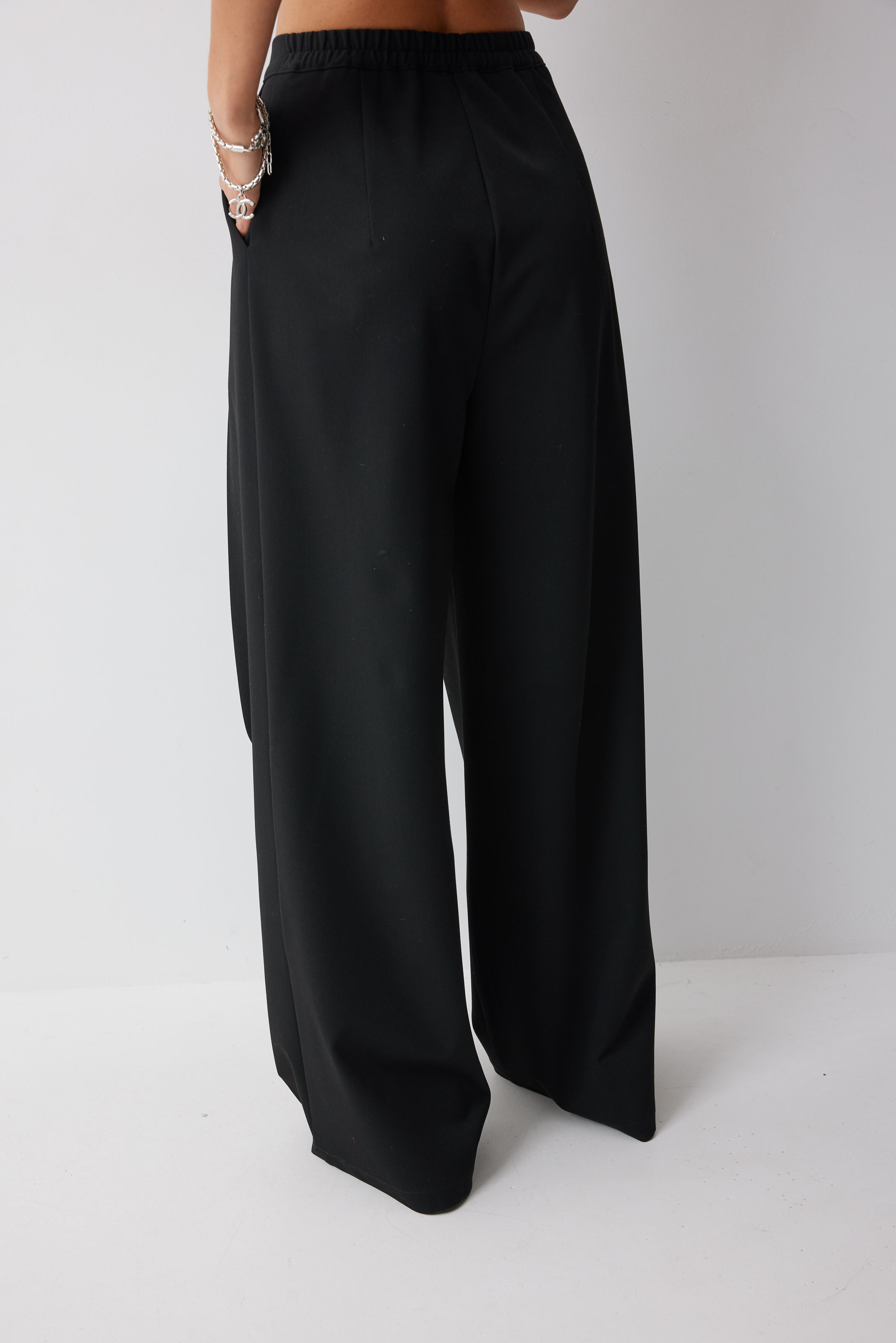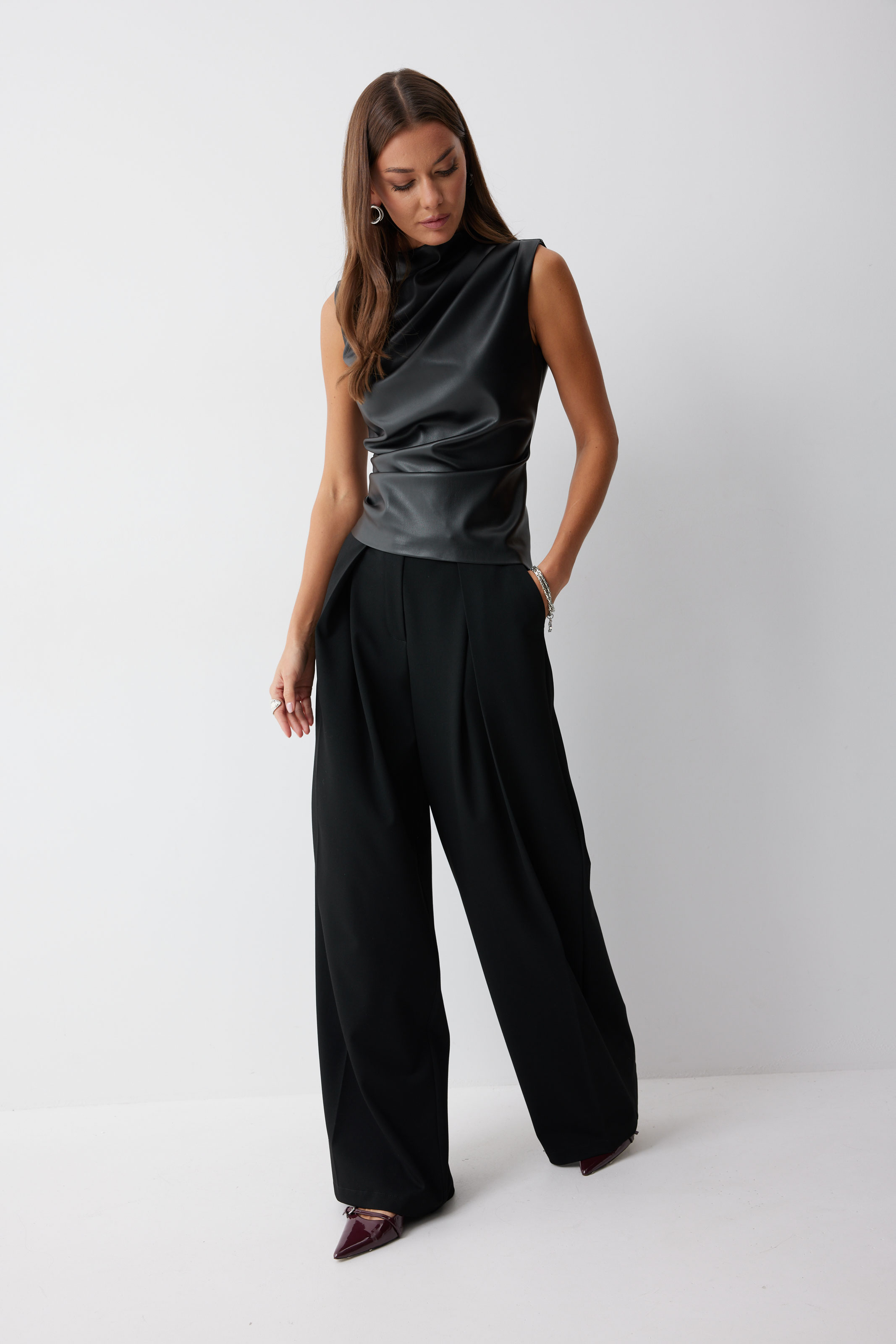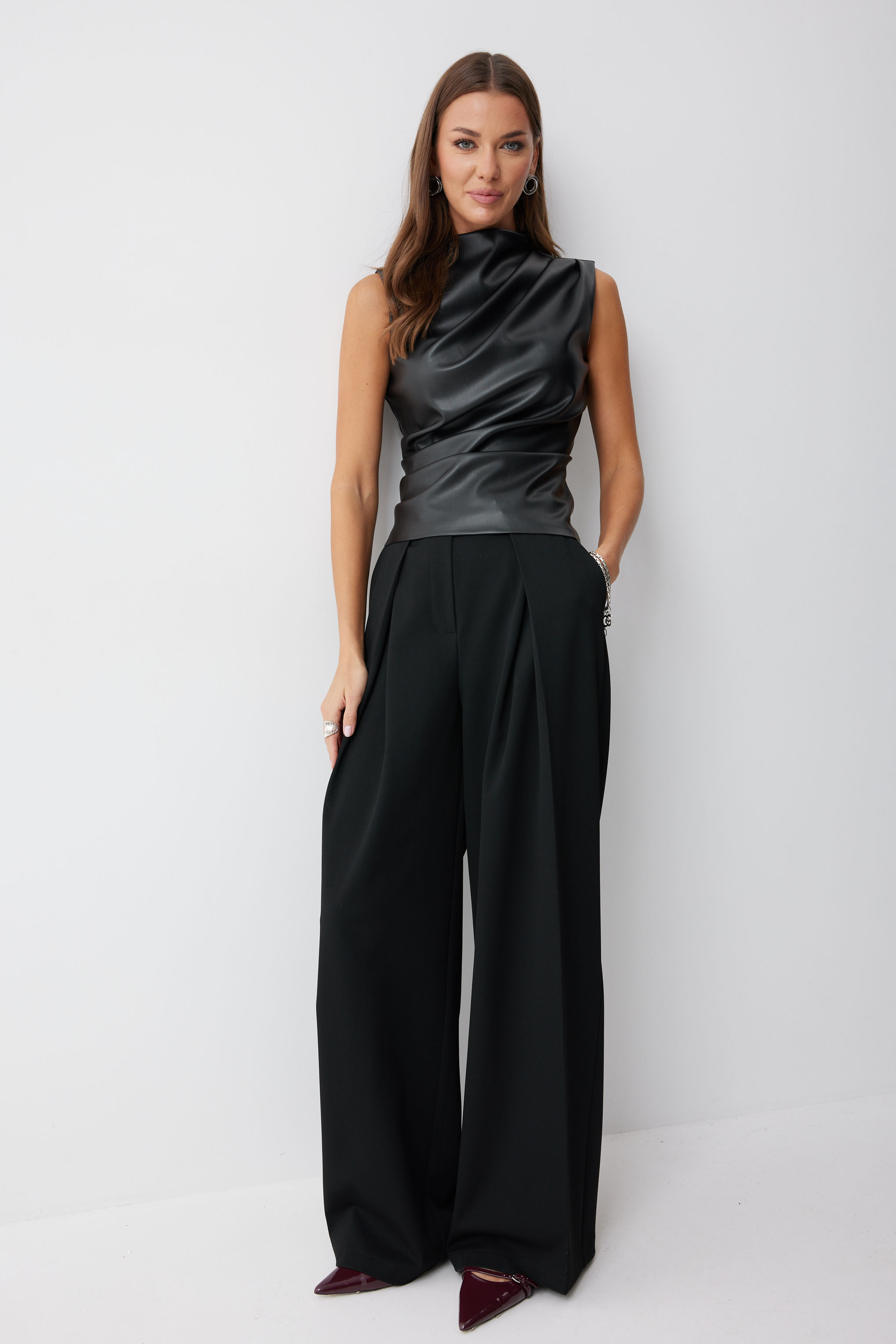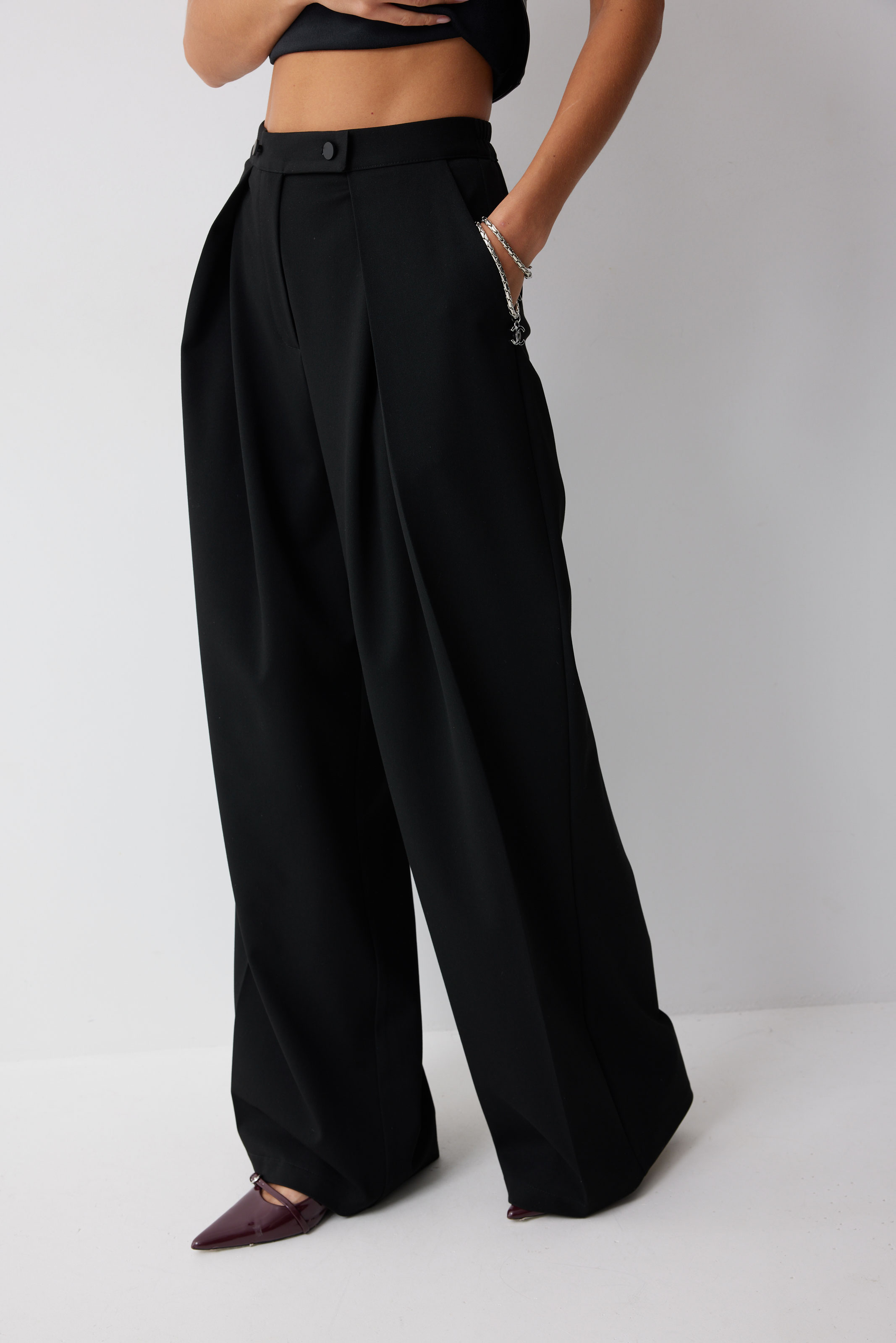 Брюки 4214 (черный) 2720 44-54 Брюки прямого силуэта расширенные книзу из костюмной ткани. По верху брюк притачной пояс с застежкой на петли и пуговицы. На передних половинках обработана застежка молния в среднем шве. На передних половинках карманы и декоративные складки. По поясу задних половинок брюк резинка и вытачки. Обращаем ваше внимание, что фурнитура может отличаться от фото. Длина брюк (44-48р - 108+3,5см пояс)(50-54р - 109+3,5см пояс)