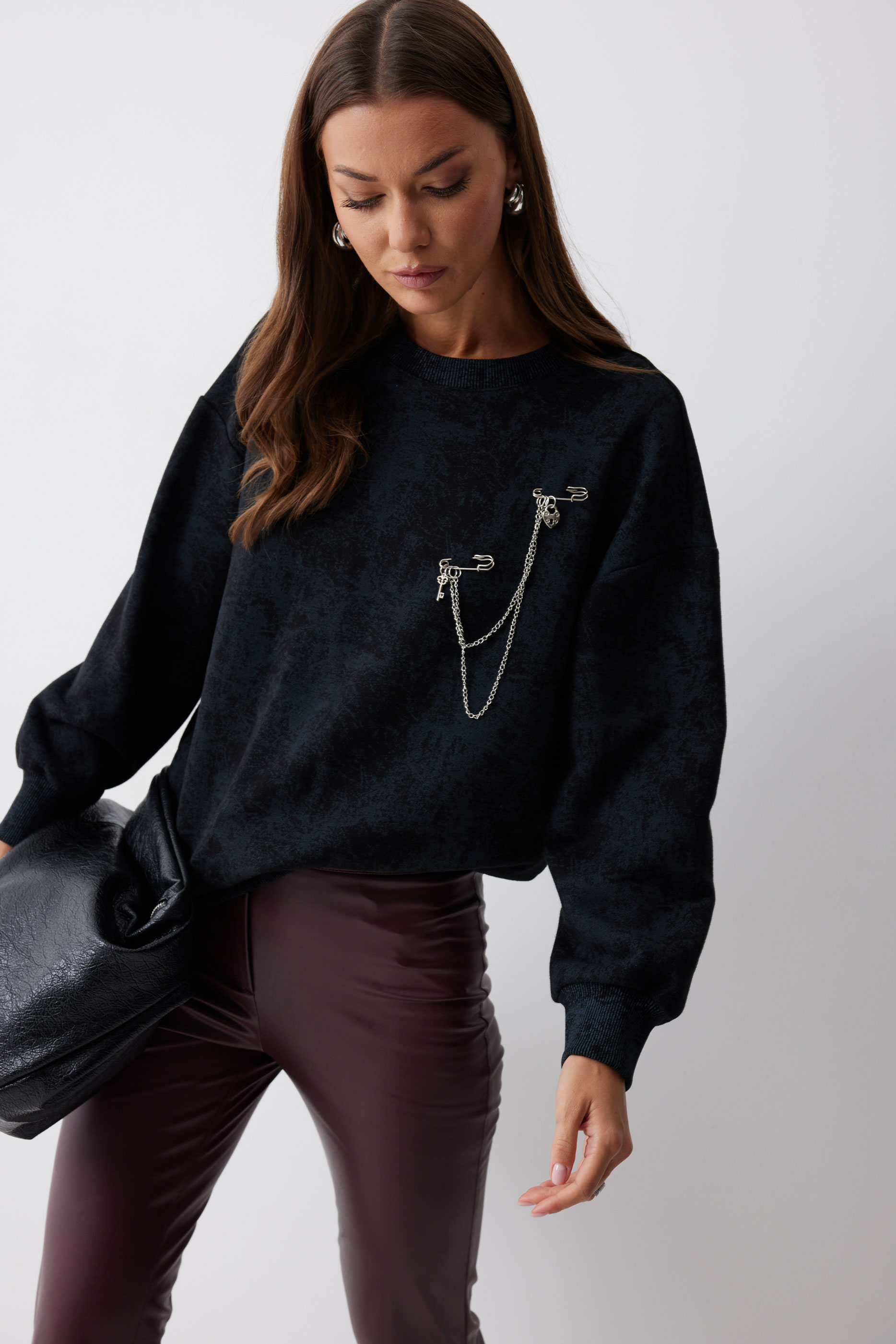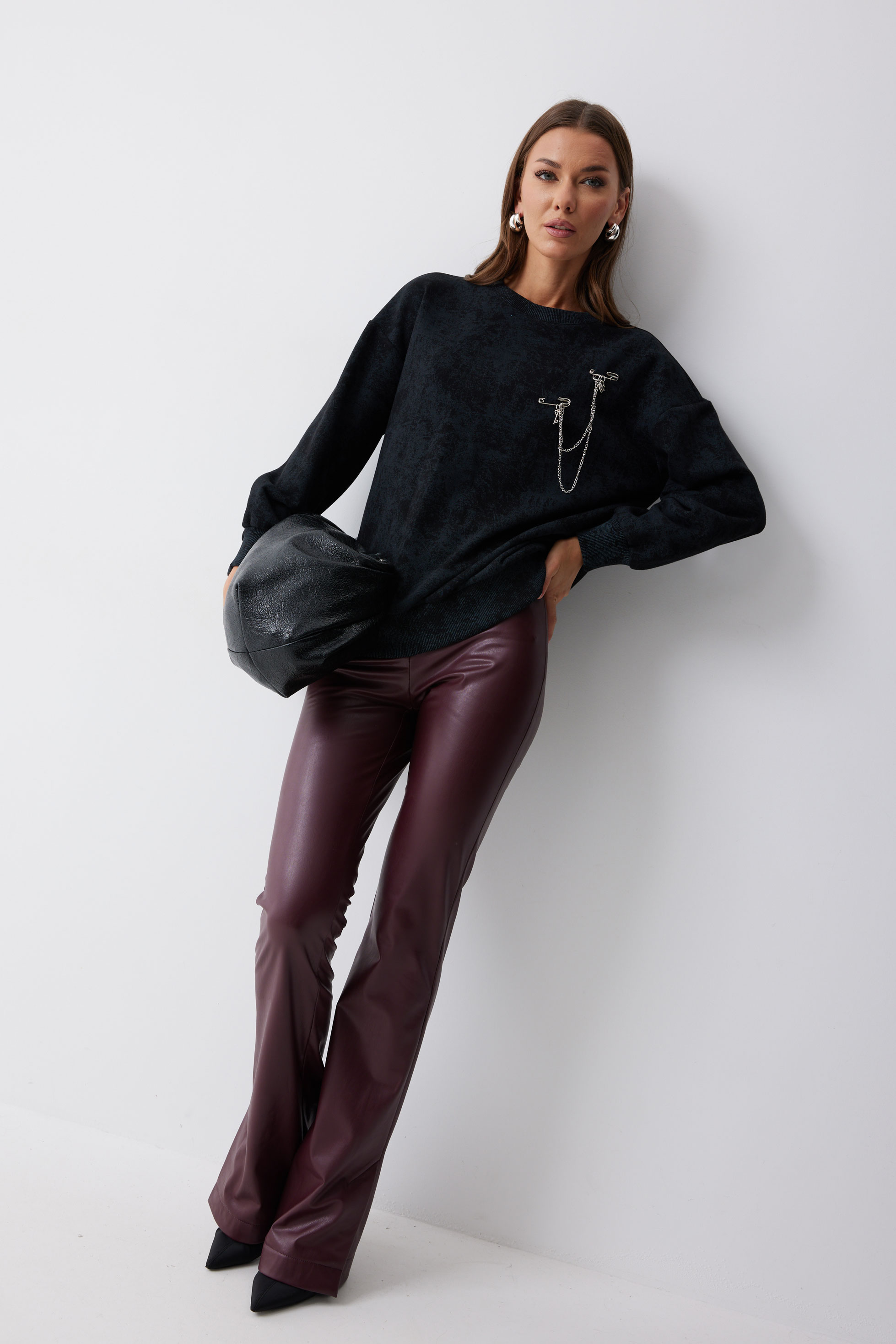 Джемпер 4216 (черный) 2805 44-54 Джемпер прямого силуэта с притачным поясом по низу из трикотажного полотна. Горловина округлая с притачной планкой. Джемпер со спущенным плечом, рукав втачной с притачным манжетом по низу. На спинке расположена дизайнерская вышивка. В комплект входит съёмное украшение. Обращаем ваше внимание, что фурнитура может незначительно отличаться от фото. "Длина джемпера (44-48р – 63см)(50-54р - 65см)