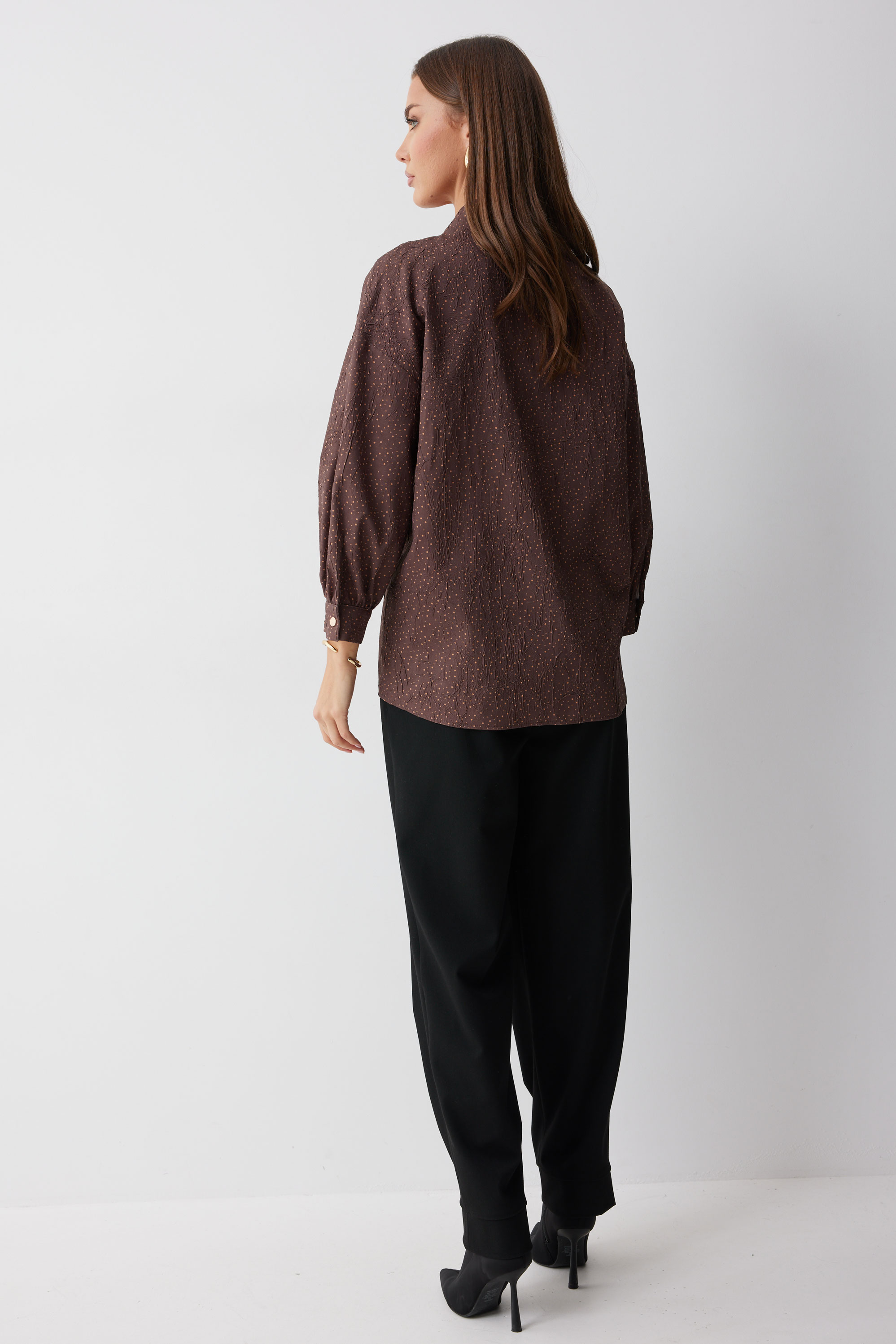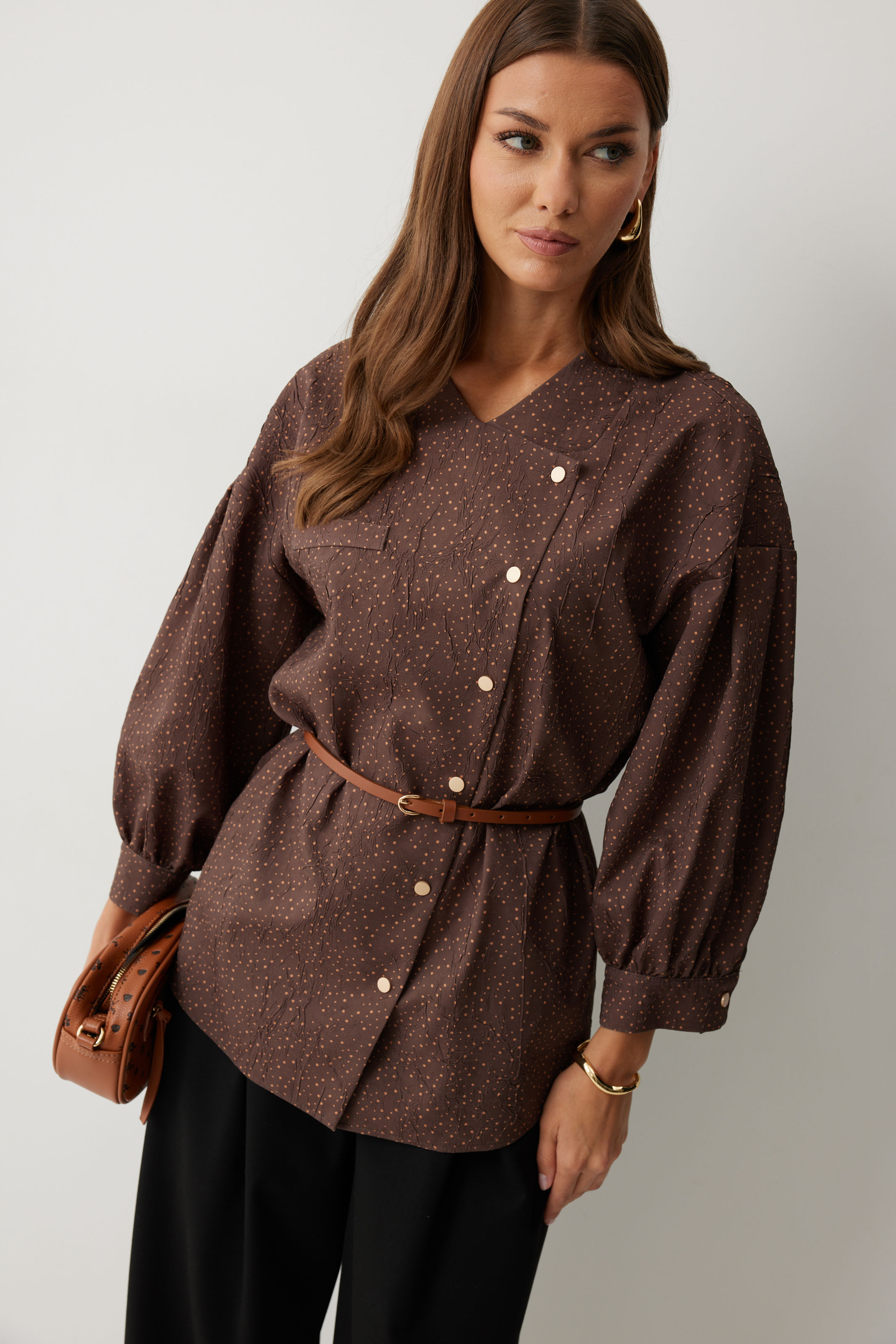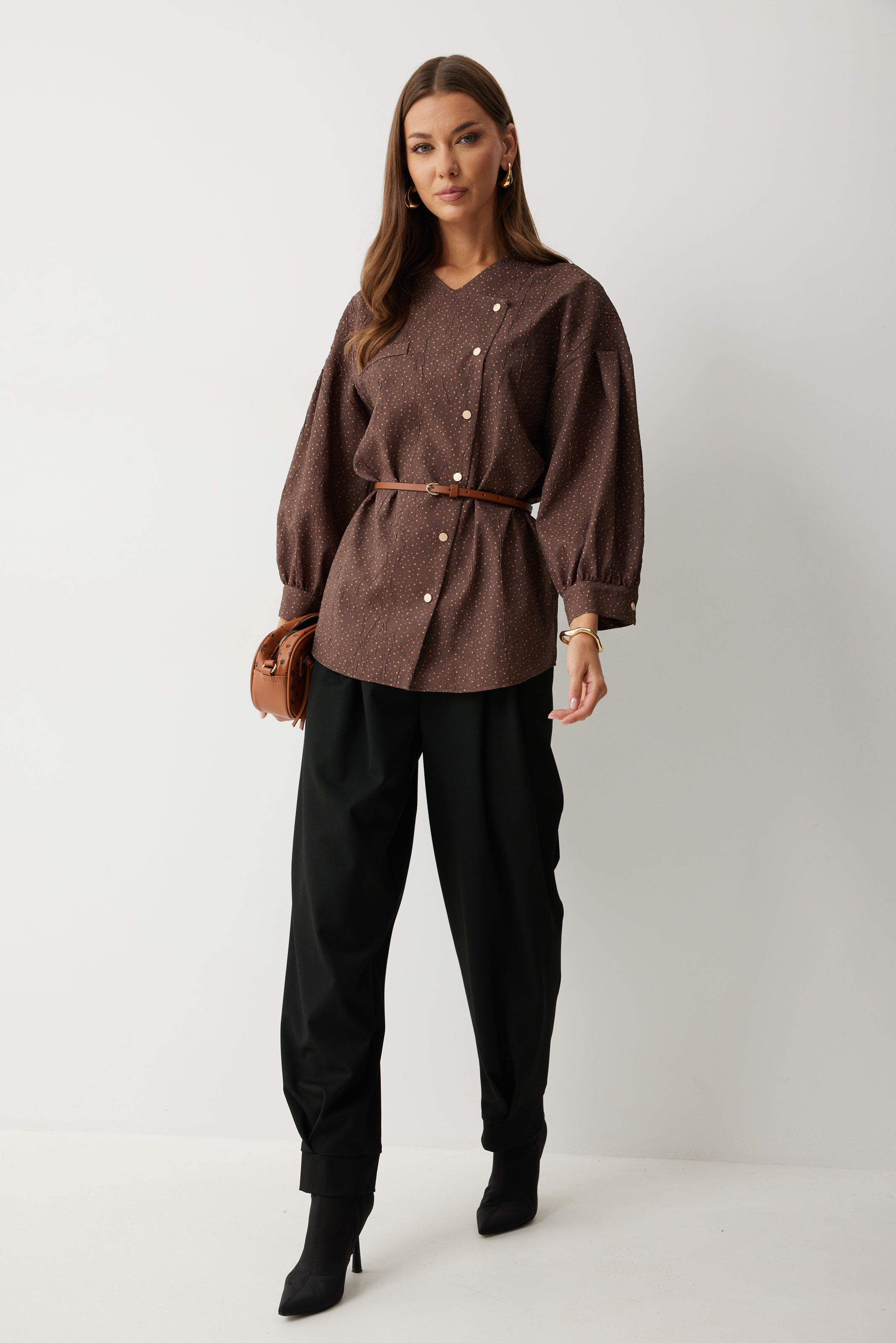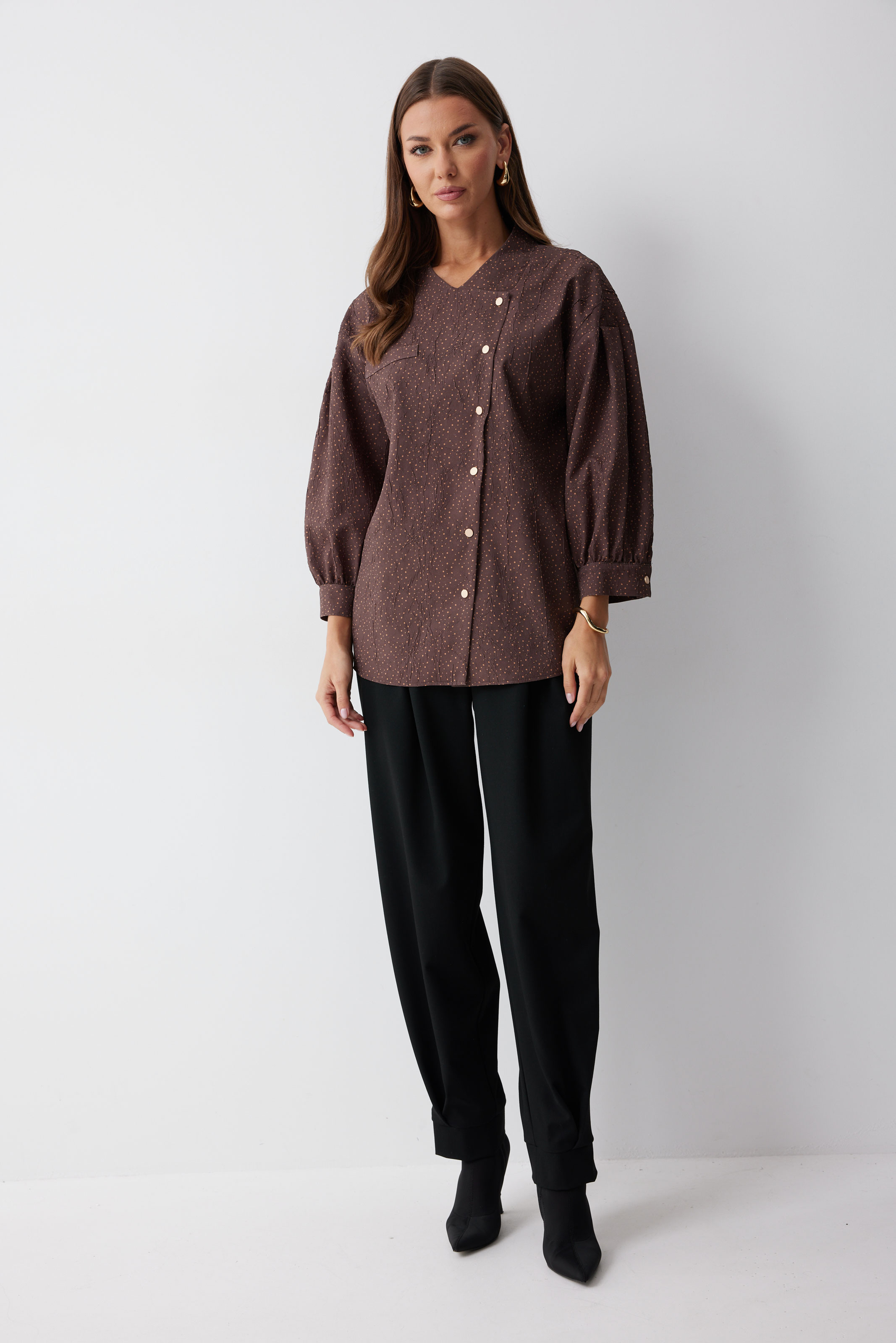 Блузка 4217 (коричневый) 2720 44-54 Ассиметричная блузка прямого силуэта. Низ фигурный. Рукав, спущенный с встречной складкой по центру. По низу манжета с застежкой на кнопку. По переду декоративная настрочная листочка. Ассиметричная двубортная застежка на кнопки. Воротник-стойка. Обращаем ваше внимание, что фурнитура может незначительно отличаться от фото. "Длина блузки (44-48р - 69см)(50-54р - 71см)