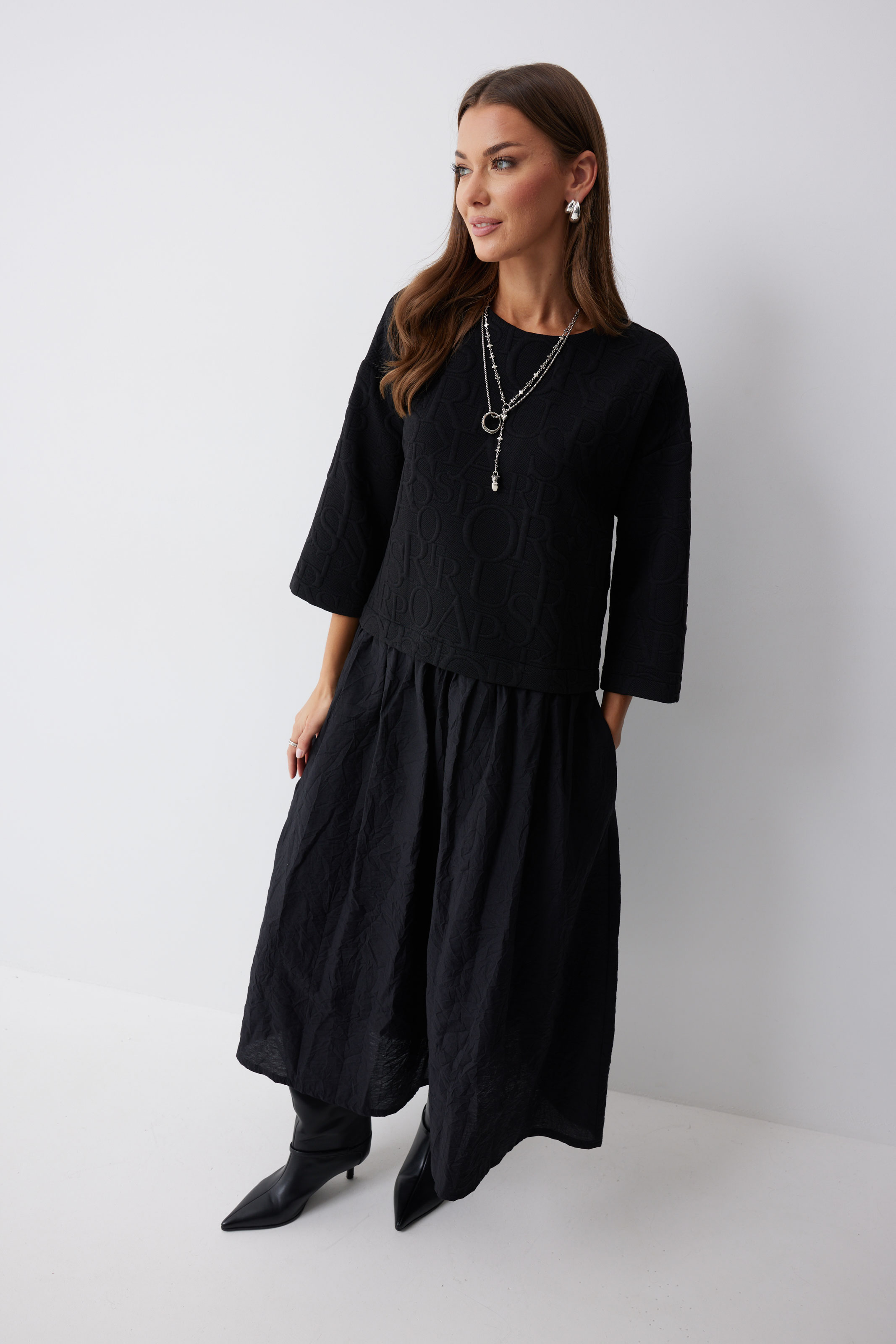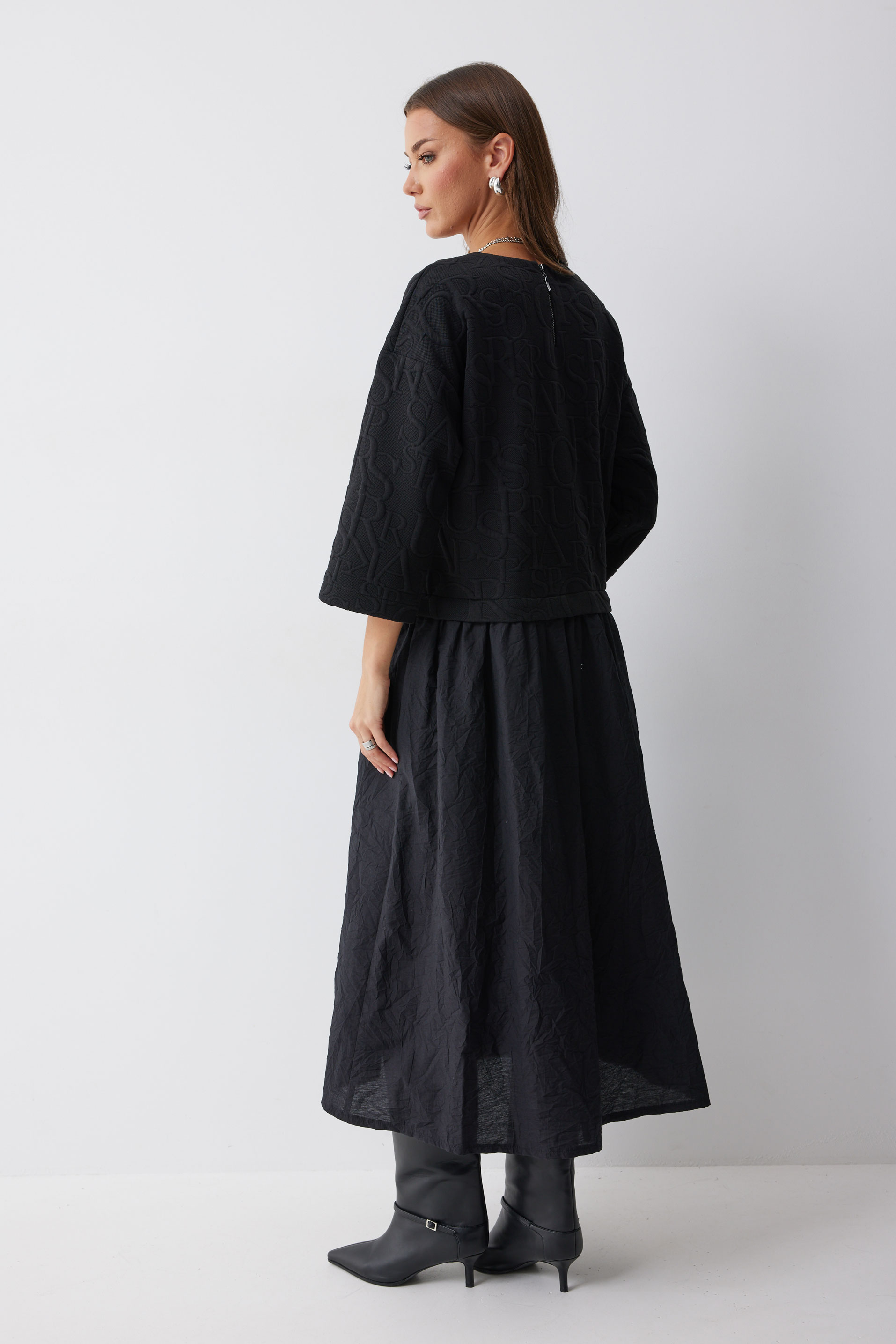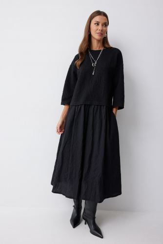 Платье 4219 3400 44-60 Платье А-силуэта из трикотажного полотна комбинированного хлопковой тканью. Горловина округлая, на спинке застежка на молнию. Рукав со спущенной линией плеча, длиной 7/8. Под линией талии подрез, в подрез вставлена юбка из хлопка. В боковых швах карманы. Платье частично на подкладке. "Длина платья (44-48р - 124см)(50-54р - 124,5см)(56-60р - 125см)
