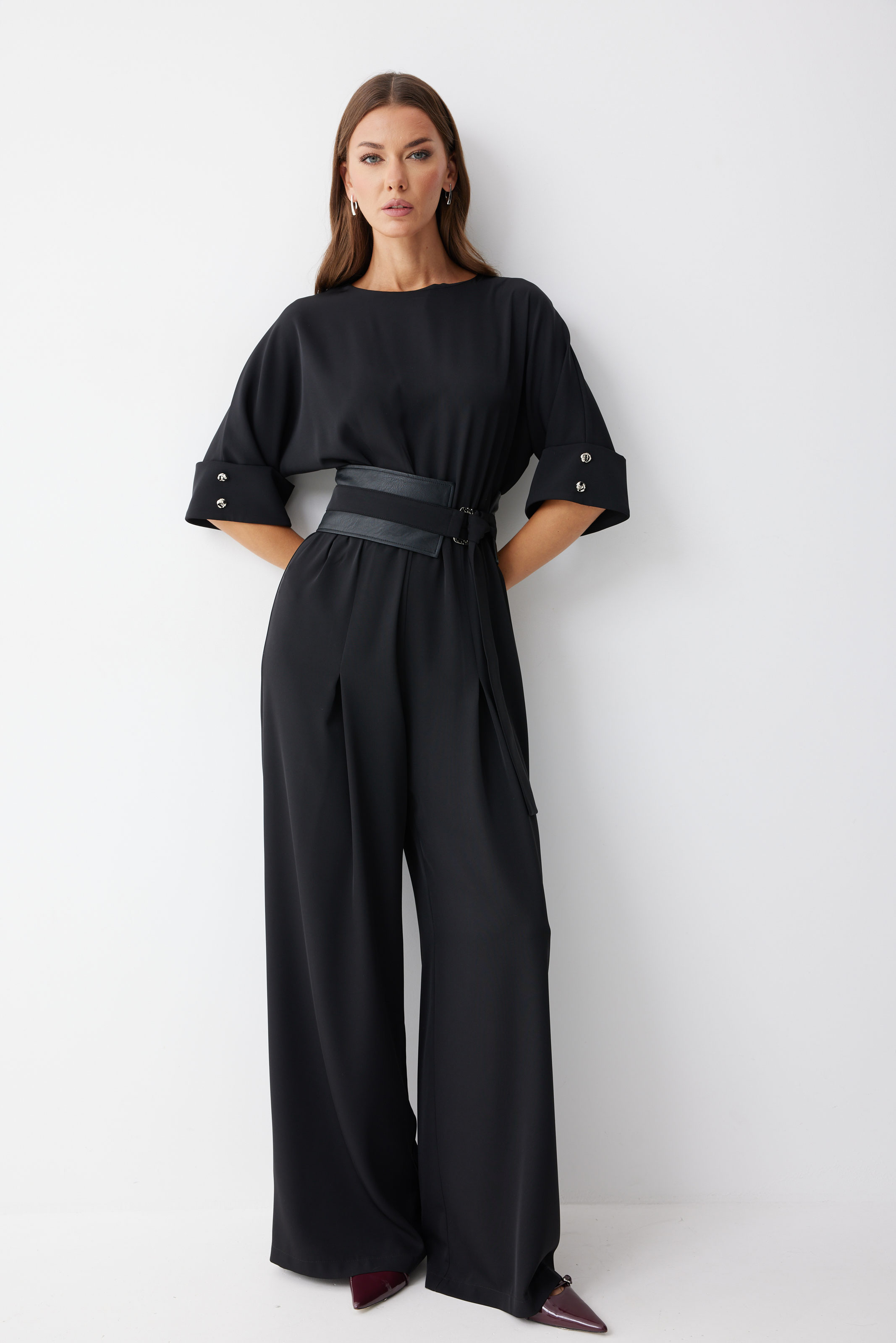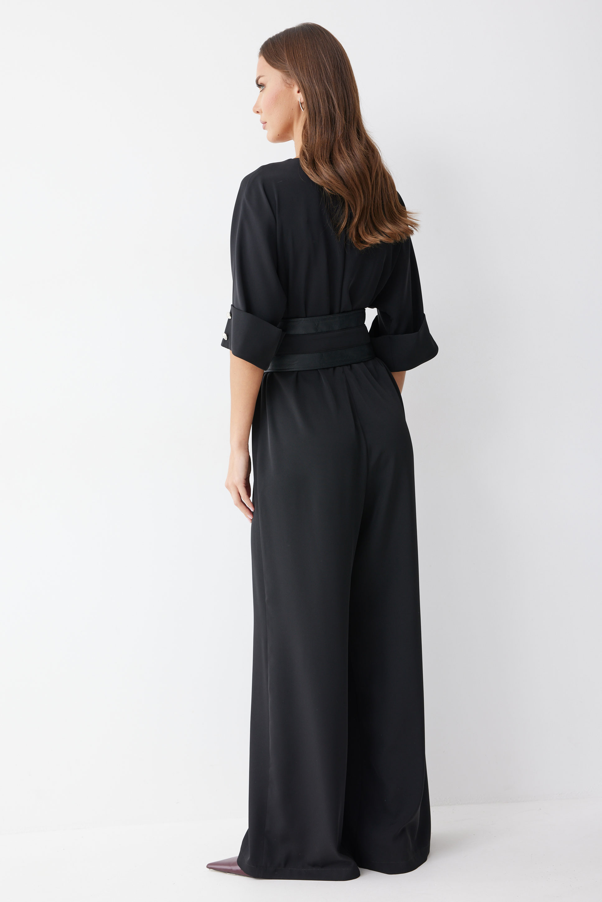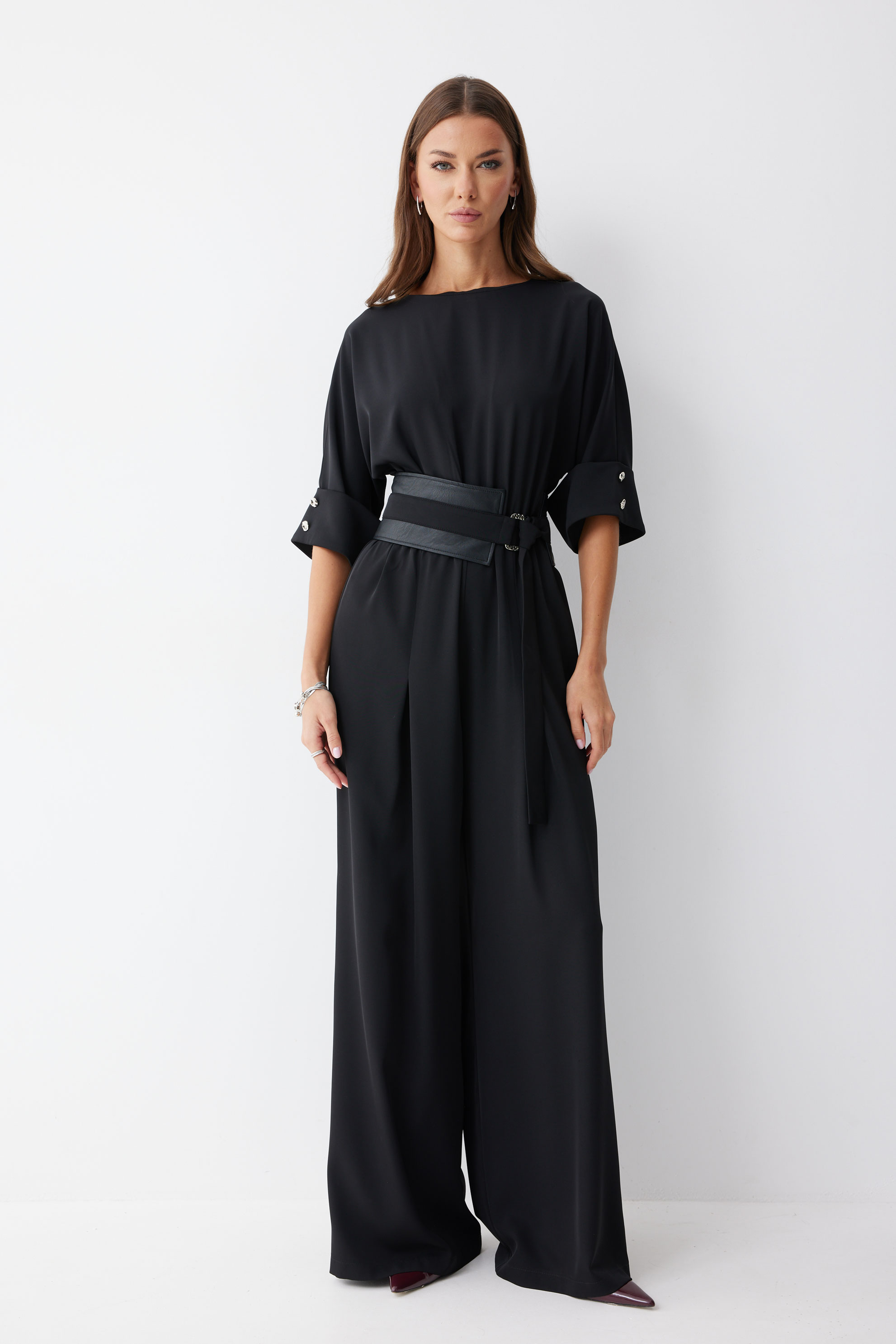 Комбинезон 4224 (черный) 3995 44-54 Комбинезон полуприлегающего силуэта, из струящейся ткани. Брюки прямого силуэта, со складками по переду. Комбинезон отрезной, по линии талии на резинке. Рукав цельнокроеный на манжете, длиной до локтя. Горловина округлая. В комплект входит пояс скомбинированный из экокожи и основной ткани. Обращаем ваше внимание, что фурнитура может незначительно отличаться от фото. "Длина комбинезона 156см