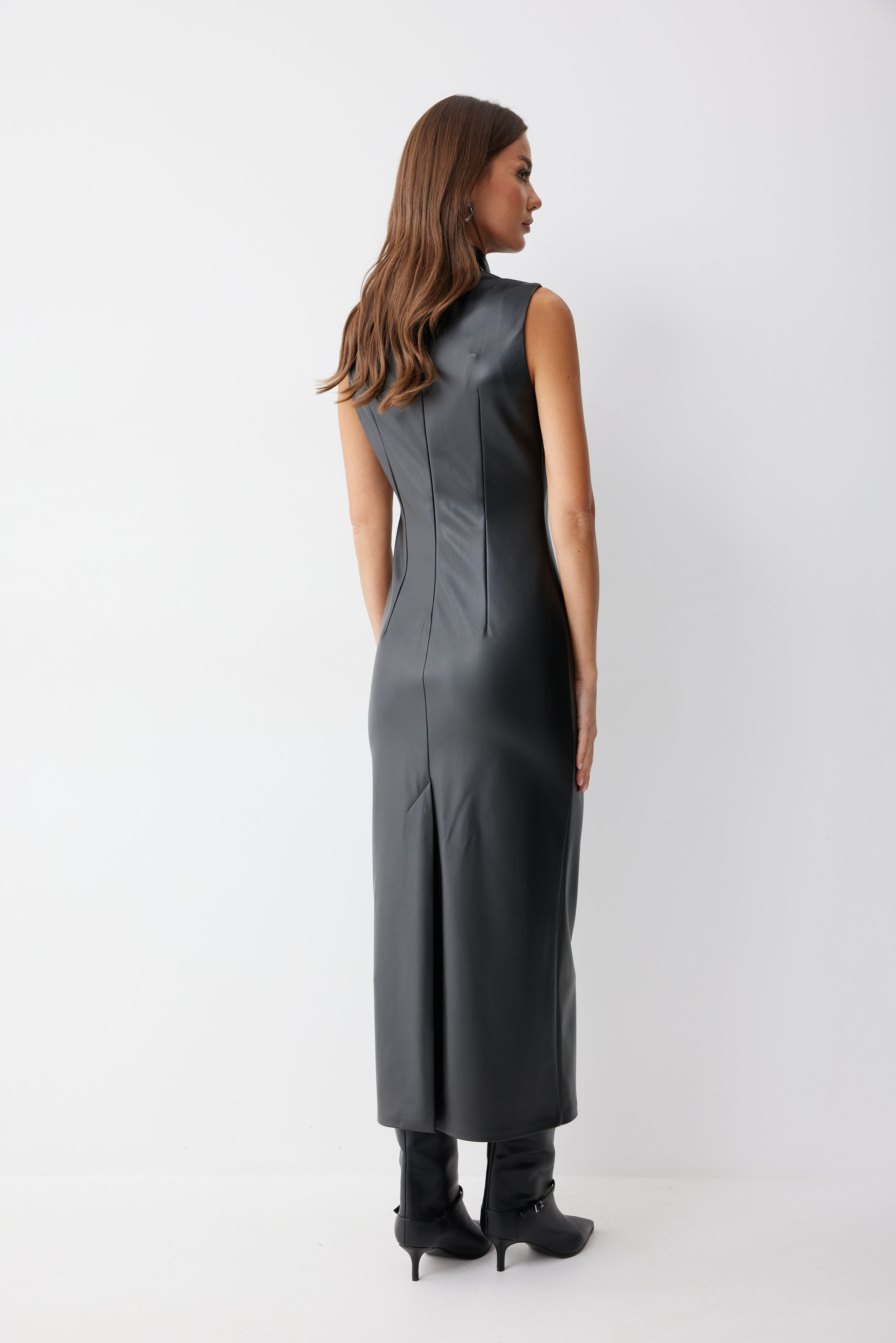 Платье 4225 (черный) 2805 44-54 Платье прилегающего силуэта из экокожи длиной миди. Горловина-стойка. Спереди под грудью подрез, нагрудные и талиевые вытачки. На спинке в центральном шве потайная молния, по низу шлица. На спинке платья талиевые вытачки. Длина платья 130см