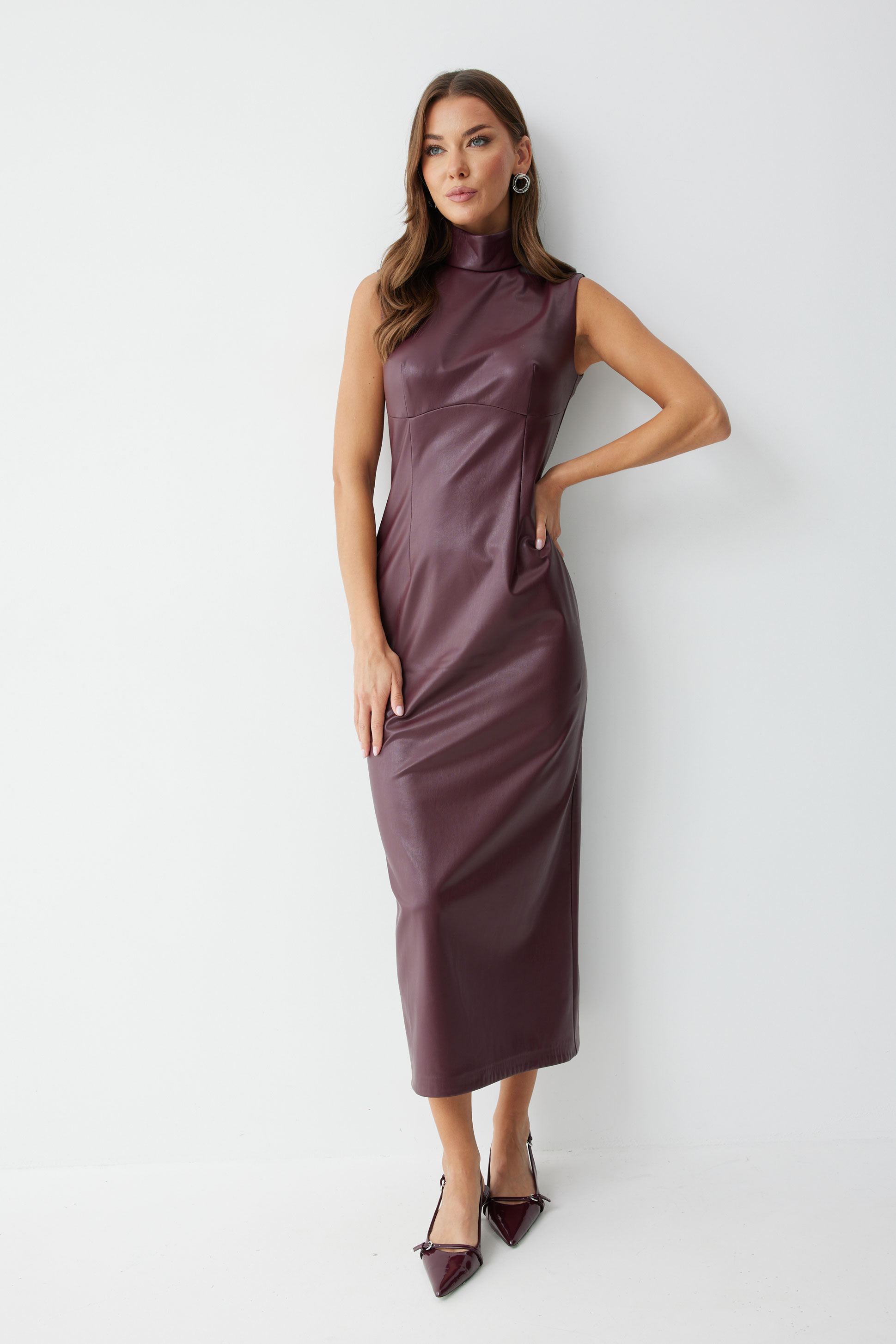 Платье 4225 (бордо) 2805 44-54 Платье прилегающего силуэта из экокожи длиной миди. Горловина-стойка. Спереди под грудью подрез, нагрудные и талиевые вытачки. На спинке в центральном шве потайная молния, по низу шлица. На спинке платья талиевые вытачки. Длина платья 130см