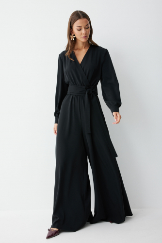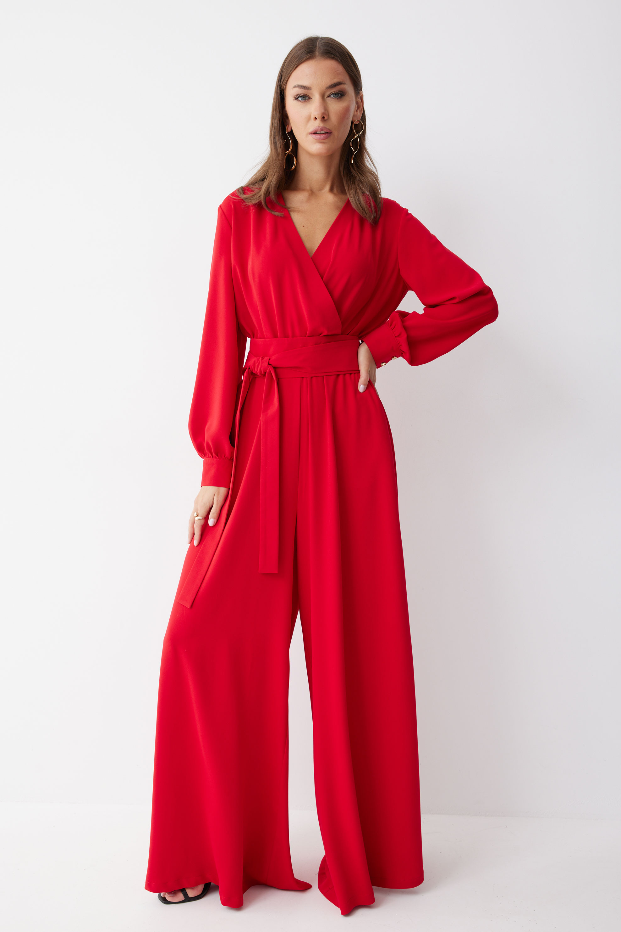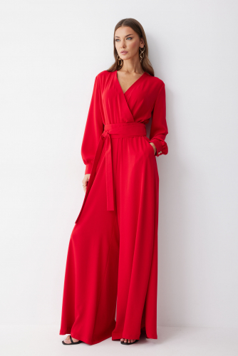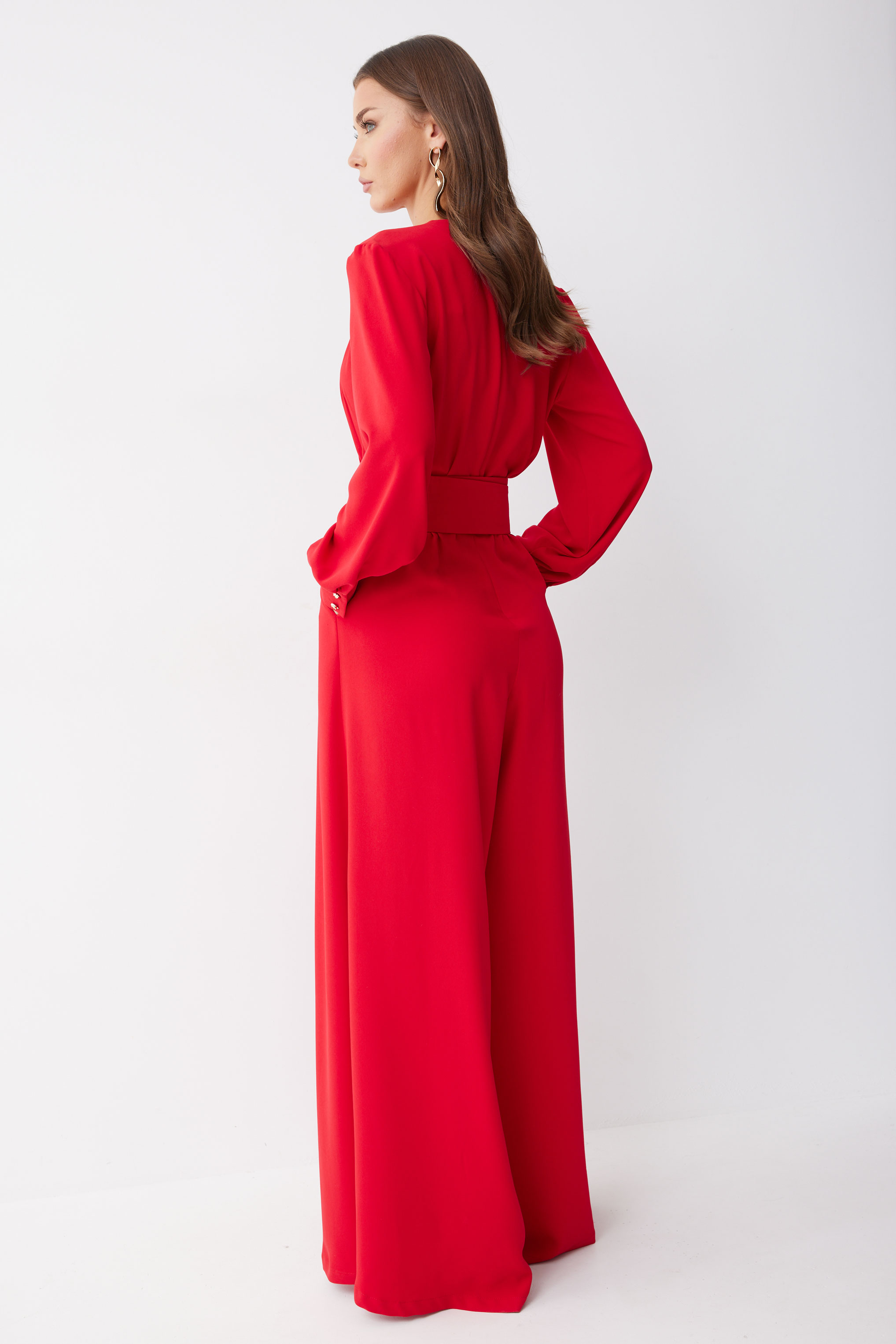 Комбинезон 4236 (красный) 3400 42-52 Комбинезон полуприлегающего силуэта с расширенными книзу брюками из струящейся ткани. Комбинезон отрезной по линии талии на резинке, верхняя часть комбинезона на запах. Рукав втачной, длинный, по низу манжета с застежкой на петлю и пуговицу. На спинке в среднем шве застежка на потайную молнию. В боковых швах карманы. В комплект входит пояс. Обращаем ваше внимание, что фурнитура может отличаться от фото. "Длина комбинезона (42-46р – 156см)(48-52р - 158,5см)