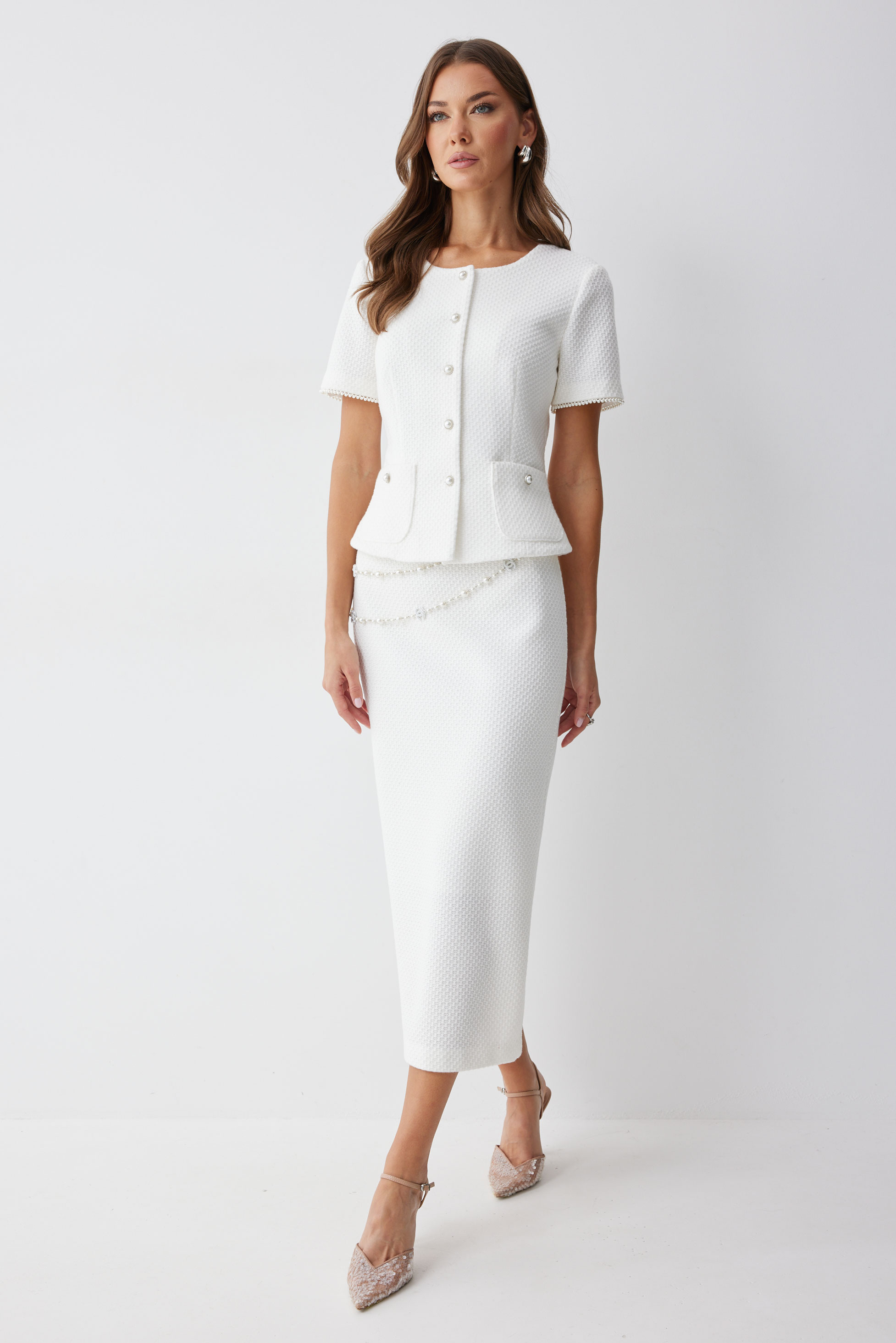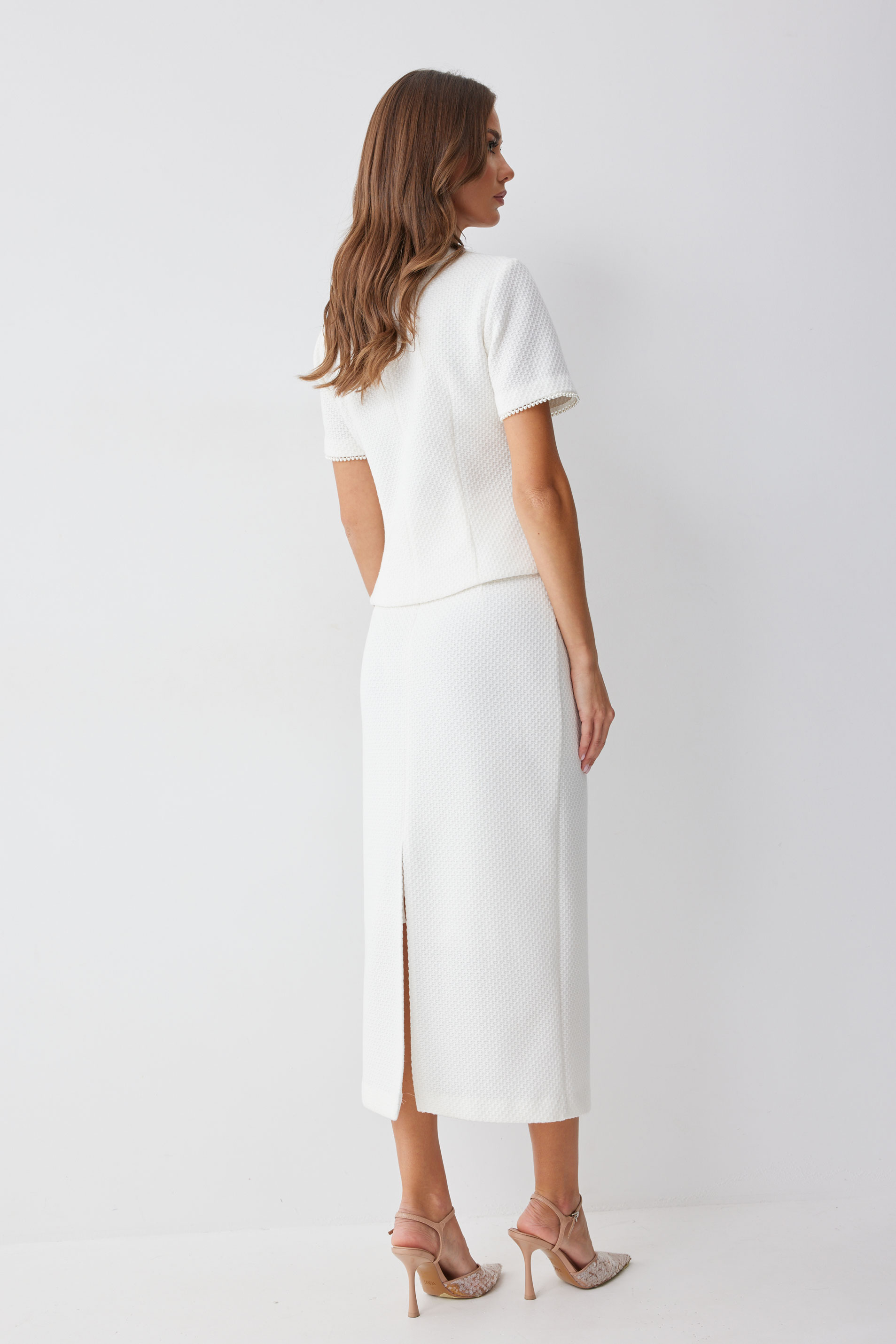 Костюм 4241 (молоко) 4675 44-54 "Жакет полуприлегающего силуэта из трикотажного полотна. Горловина округлая по центру застежка на петли и пуговицы. Рукав втачной короткий. По переду талиевые вытачки и накладные карманы, на спинке – талиевые вытачки. Жакет на подкладке. Обращаем ваше внимание, что фурнитура может отличаться от фото.