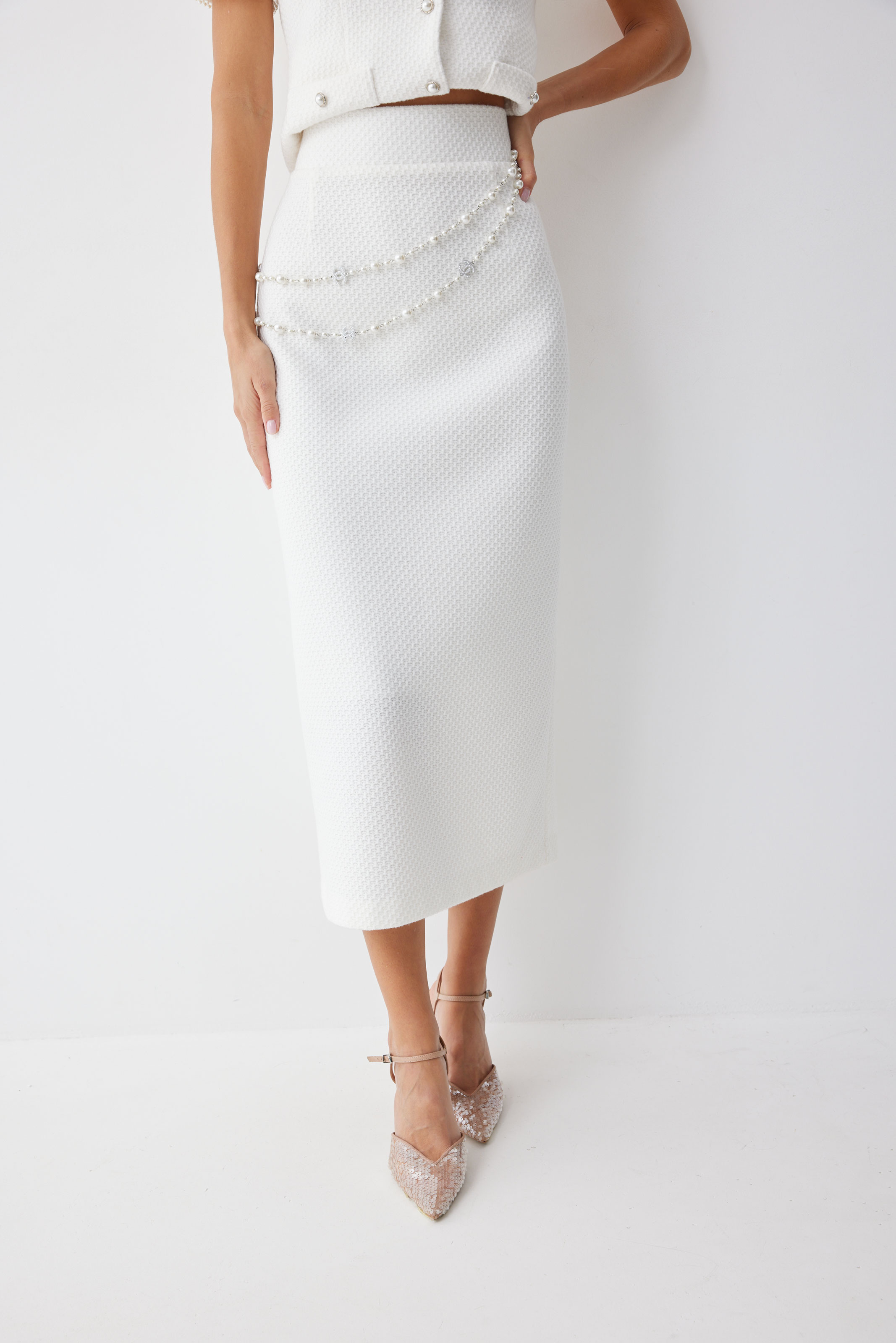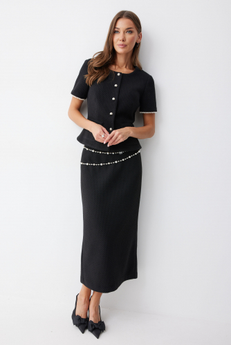 Юбка прямого силуэта из трикотажного полотна. По верху юбки притачной пояс. На спинке юбки в центральном шве застежка на потайную молнию, по низу разрез. Юбка на подкладке." "Длина жакета (44-48р - 53см)(50-54р - 55см)