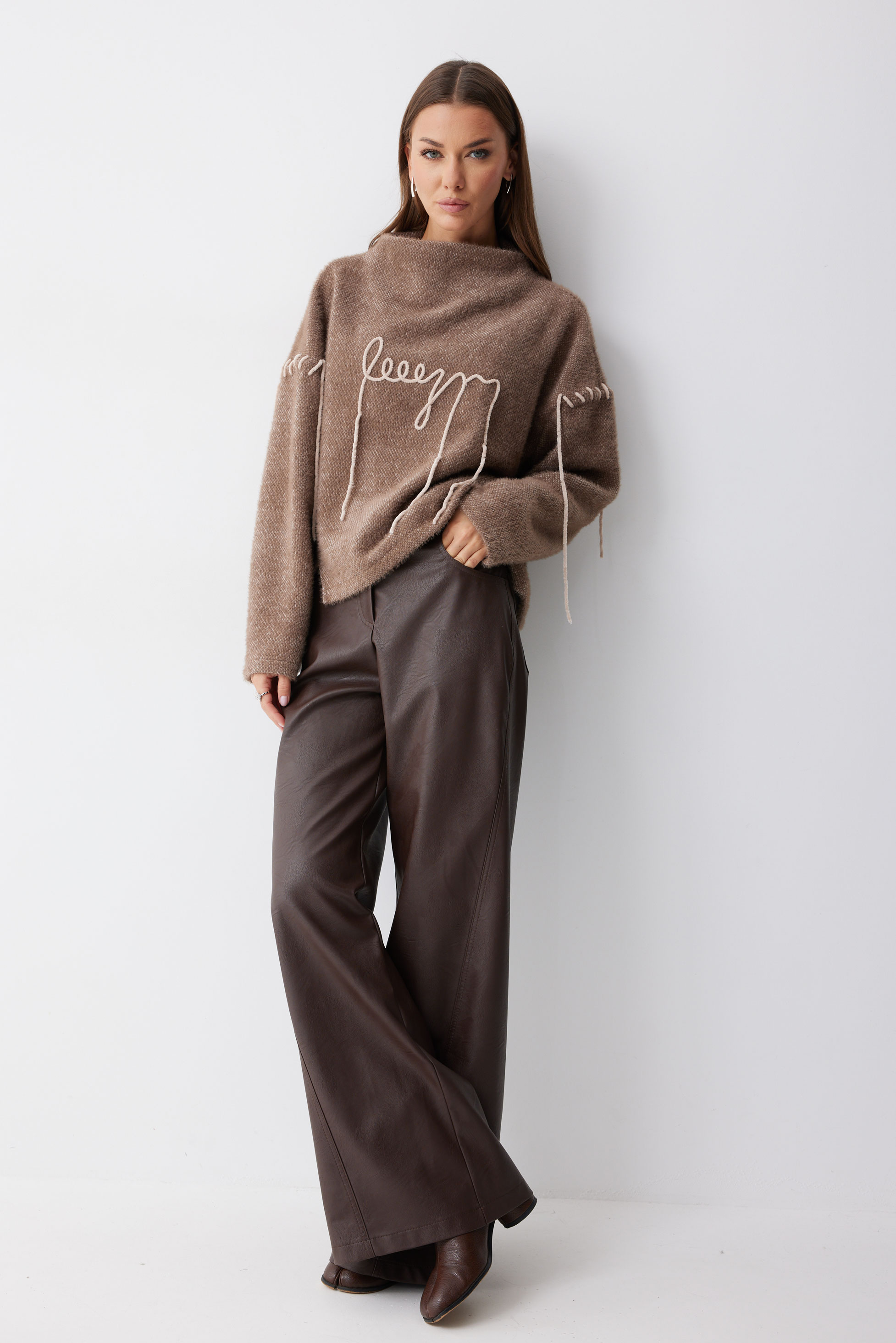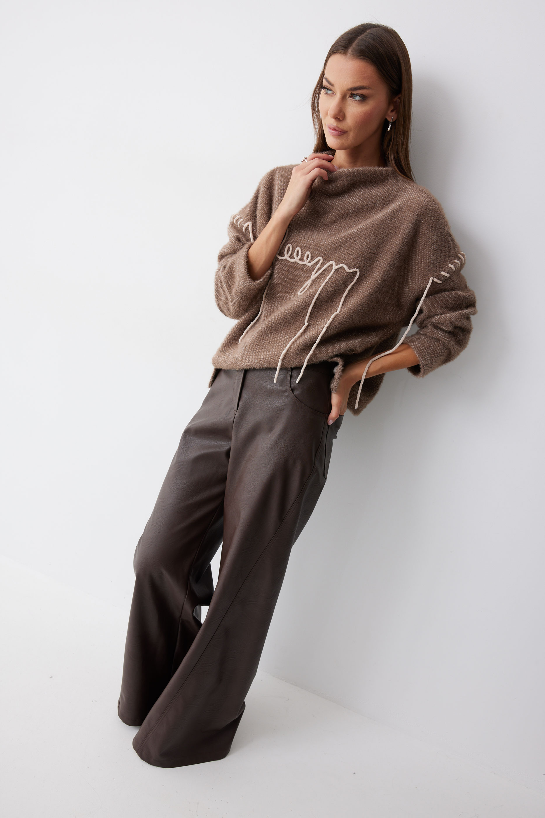 Джемпер 4242 (капучино) 2550 44-54 Джемпер прямого силуэта из трикотажного полотна с фигурным низом. Горловина цельнокроеная стойка. Рукав со спущенной линией плеча, удлиненный. Джемпер со смещенным боковым швом. По переду джемпера дизайнерская вышивка. "Длина джемпера (44-48р – 62см)(50-54р - 66см)