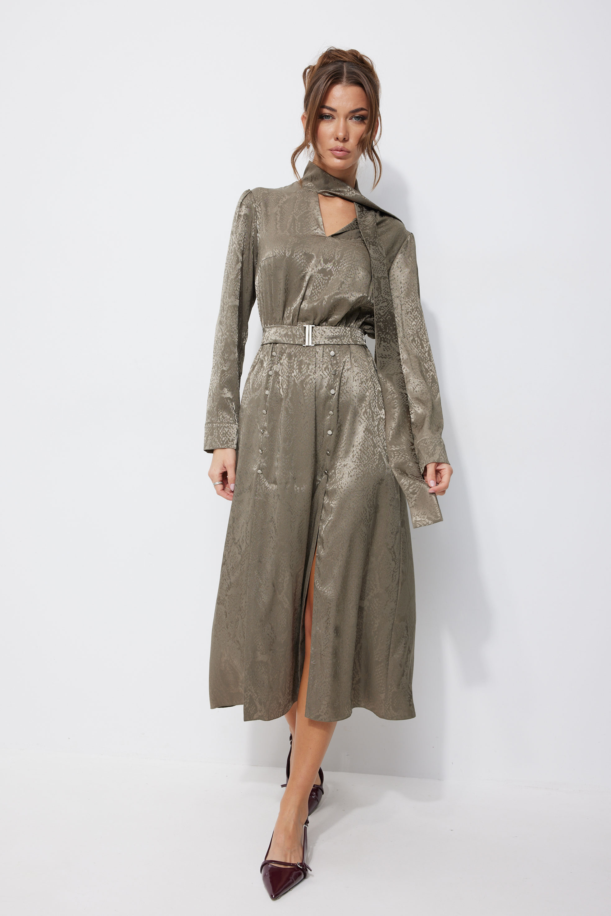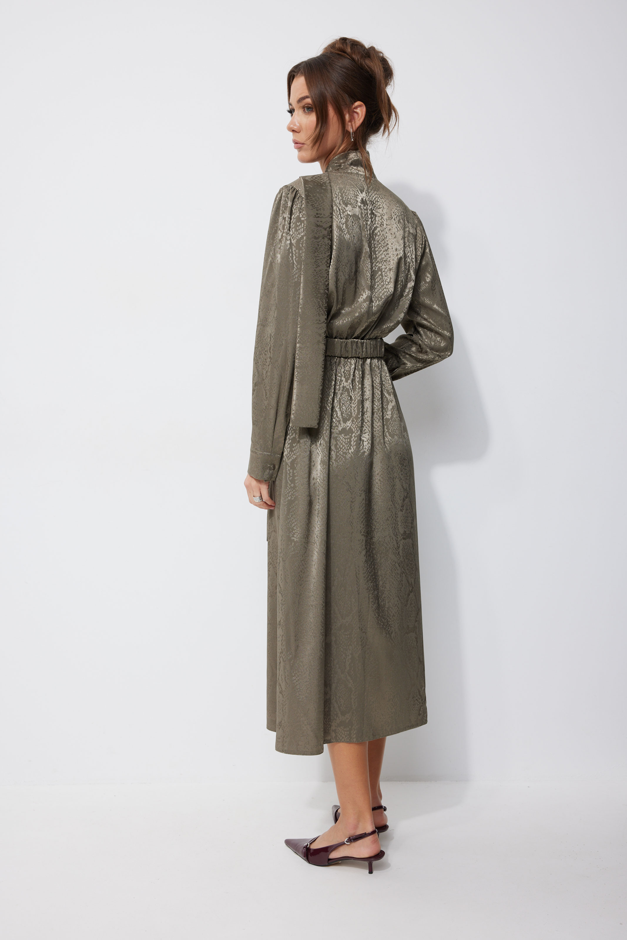 Платье 4248 (оливка) 3230 44-54 Нарядное платье из жаккардового атласа с анималистичным дизайном. Платье свободного кроя. Отрезное по талии, с резинкой. Рукав длинный, с манжетой с застежкой на петлю с пуговицей. Платье с мягким воротником-стойкой, переходящим в бант-завязки по переду. По переду V-образный вырез по горловине. По переднему полотнищу юбки шлицы в рельефах, рельефы от талии до шлиц декорированы пуговицами. Платье дополняется съемным поясом из основной ткани, с пряжкой. В среднюю часть пояса вставлена резинка. Обращаем Ваше внимание, что фурнитура может незначительно отличаться от фото. "Длина платья 130 см во всех размерах.
