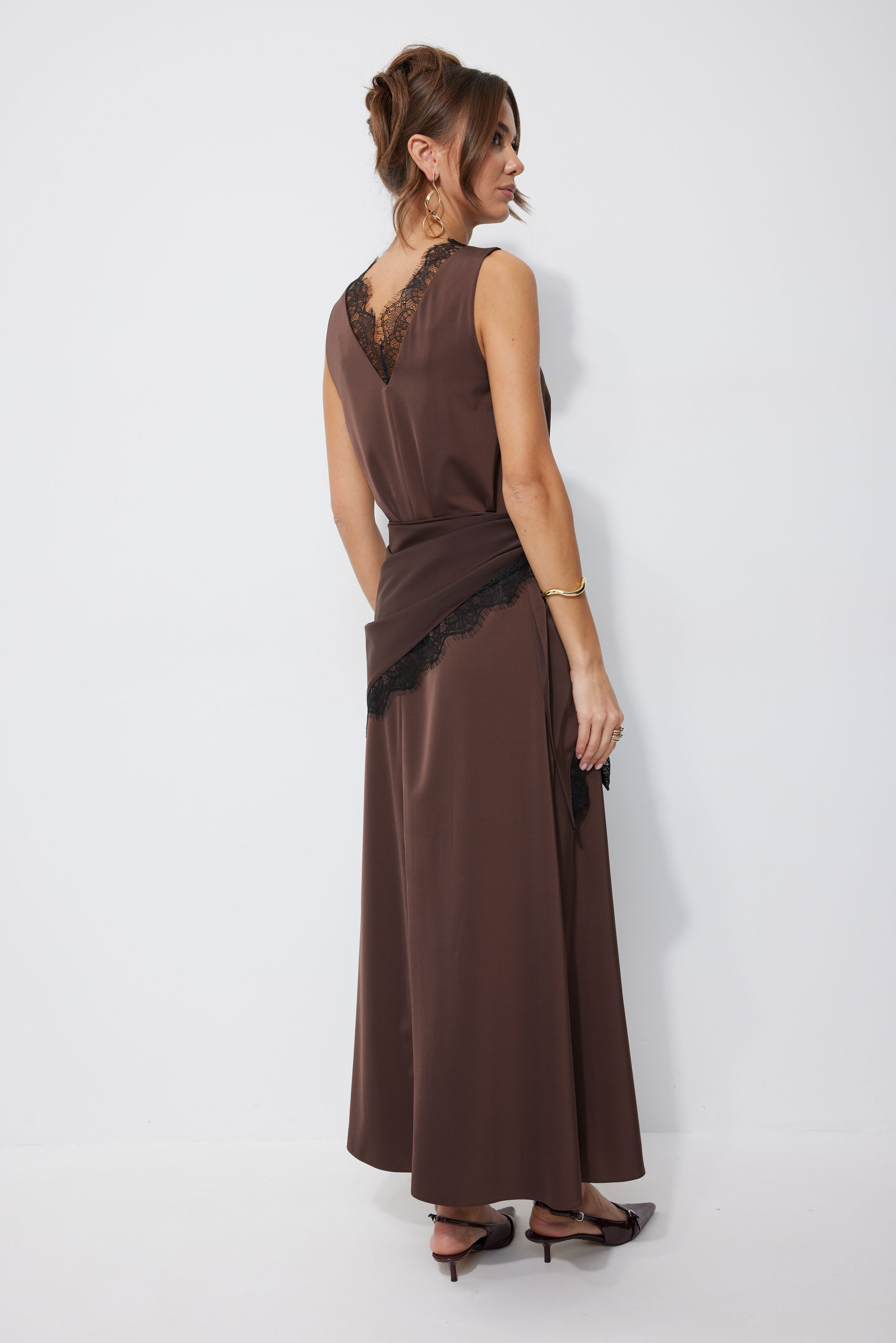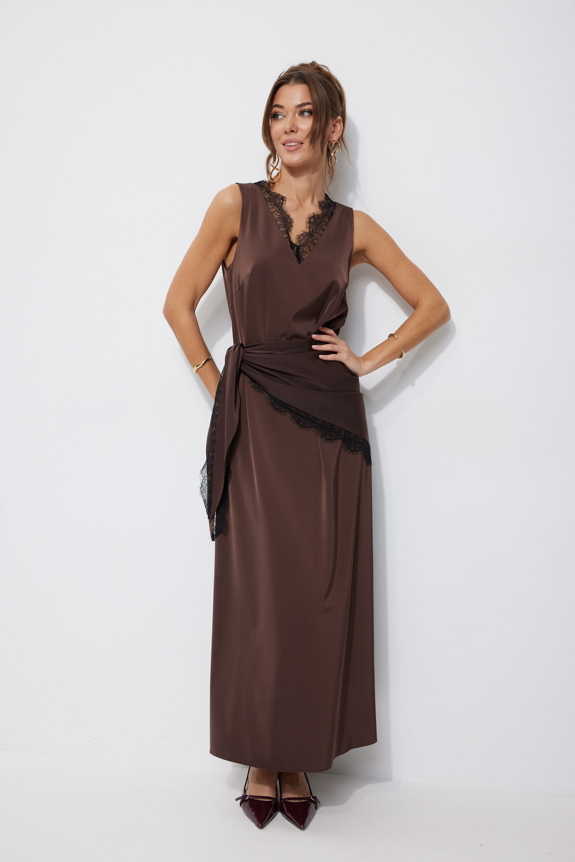 Платье 4249 (коричневый) 3230 44-54 Нарядное платье из струящейся ткани, длина макси. Платье свободного кроя, прямое, расширенное к низу. С глубоким V-образным вырезом горловины по переду и спинке, декорированным французским кружевом. По переду нагрудные вытачки. Без рукава. Платье дополняется платком из основной ткани. Платок декорирован по двум срезам французским кружевом. Обращаем Ваше внимание, что кружево может незначительно отличаться от фото. Длина платья от плеча 139 см во всех размерах.