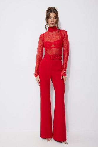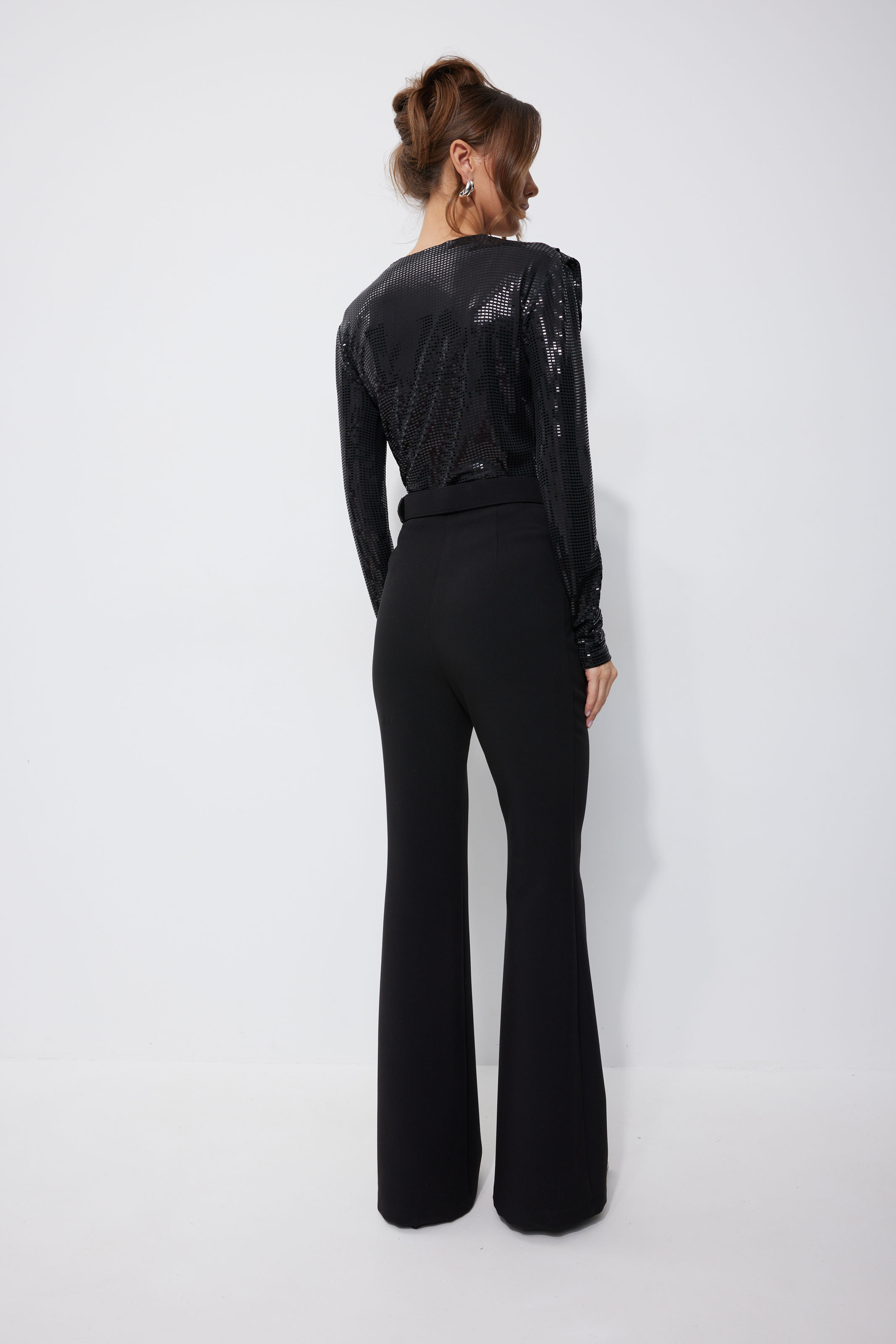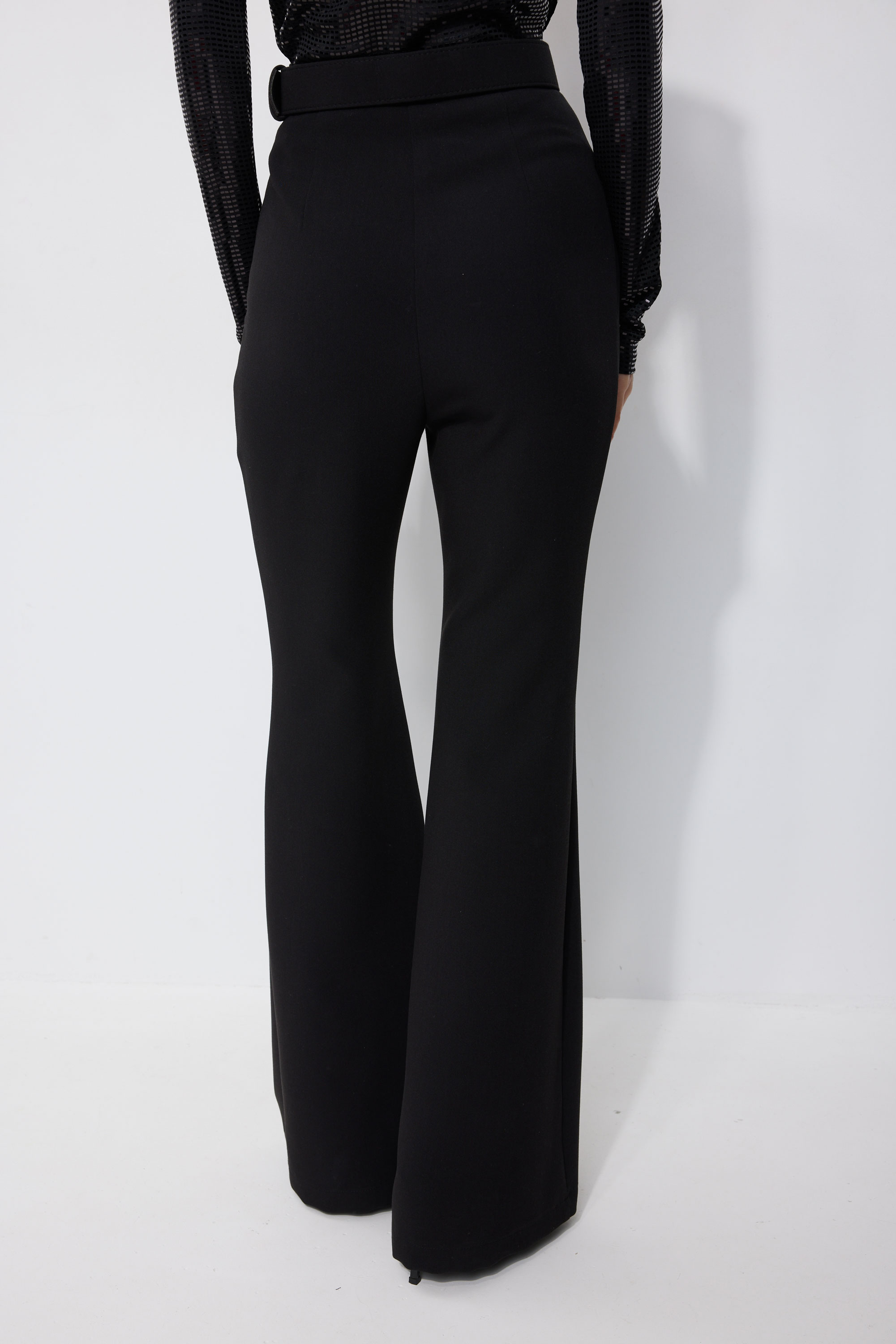 Брюки 4254 (черный) 2805 44-54 Брюки прилегающего силуэта расширенные книзу из костюмной ткани. По верху притачной пояс с застежкой на петлю и пуговицу и шлевками для ремня. На передних половинках обработана застежка молния в среднем шве. В комплект входит съемный ремень. Обращаем ваше внимание, что фурнитура может отличаться от фото. Длина брюк (44-48р – 114+4см пояс)(50-54р - 115+4см пояс)