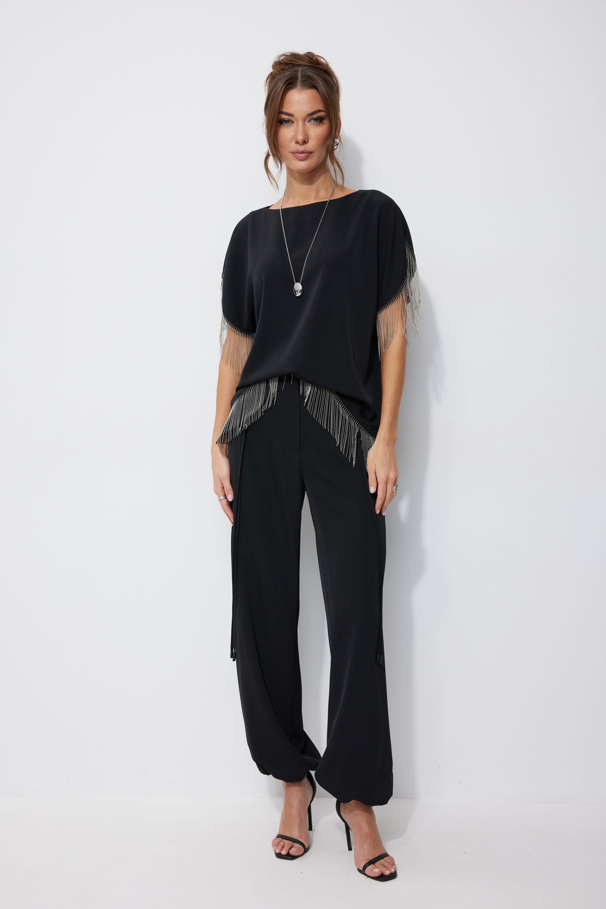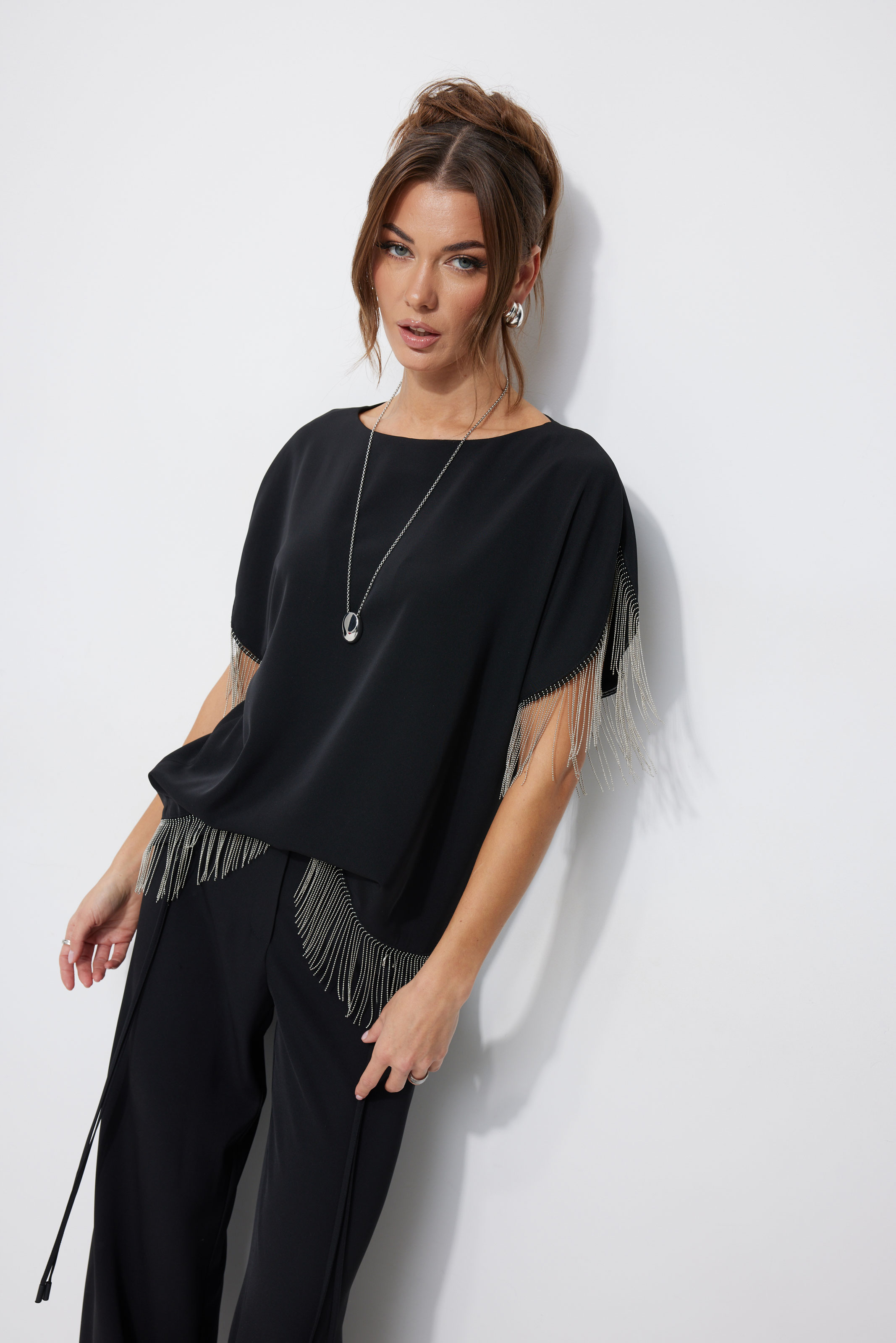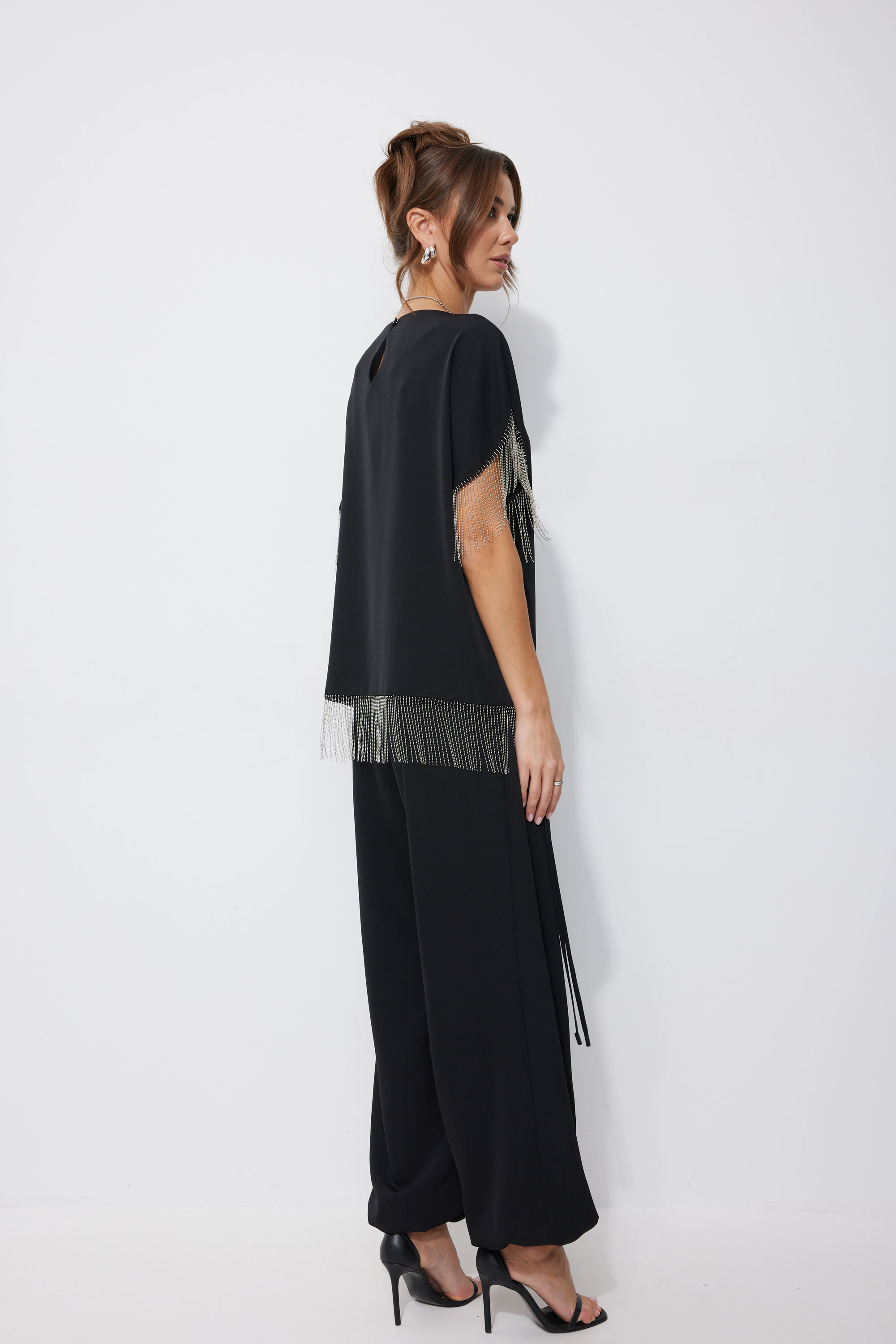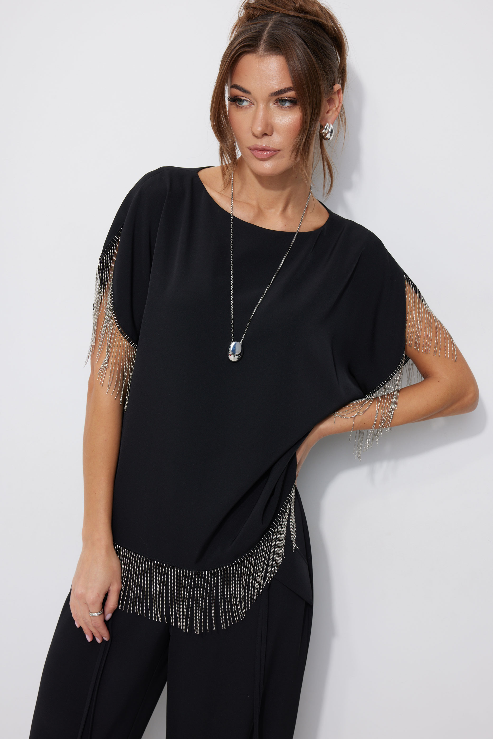 Блуза 4255 2975 44-54 Блузка прямого силуэта из струящейся ткани. Горловина-лодочка, на спинке застежка на петлю и пуговицу. Рукав цельнокроеный с фигурным вырезом. По низу рукава и низу изделия декоративная тесьма. Обращаем ваше внимание, что фурнитура может отличаться от фото. "Длина блузка (44-48р – 57см)(50-54р - 59см)