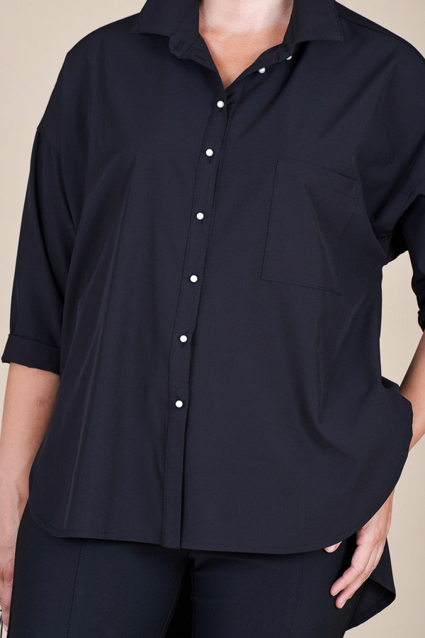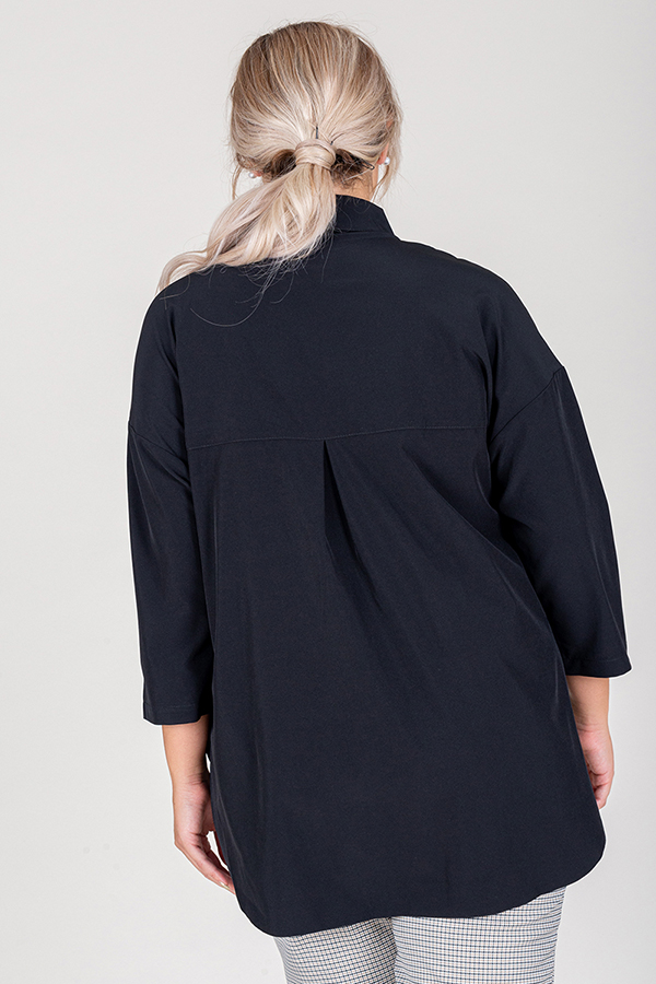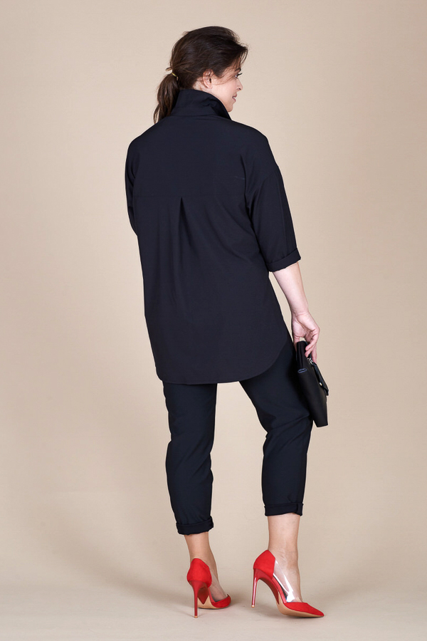 Модная блуза-туника из блузочной ткани очень свободного силуэта с застёжкой на планке. Низ изделия асимметричной длины (спинка удлинена относительно переда) с закруглениями по бокам. Рубашечный рукав ¾. Круглый вырез горловины обработан отложным воротником на стойке. На задней части изделия выполнена кокетка с небольшой бантовой складкой. На передней-накладной карман в области груди. Жемчужные пуговицы на застёжке придают изделию нарядный вид. Достоинство этой модели в способности скрыть некоторые недостатки фигуры. Её можно сочетать как с брюками, так и с джинсами.
