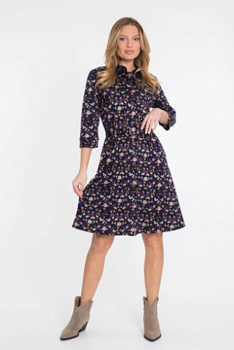 Платье выполнено из кулирки с набивным рисунком. Платье со спущенным рукавом и вытачкой из плечевого среза. Горловина имеет V-образный вырез. На полочке средний шов.