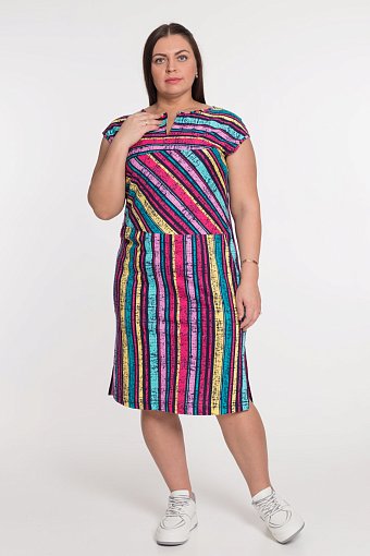 Лёгкое летнее платье из кулирки, 100% хлопок. Линия плеча спущена, спереди на горловине декоративный разрез. Внизу, по бокам, также расположены разрезы.