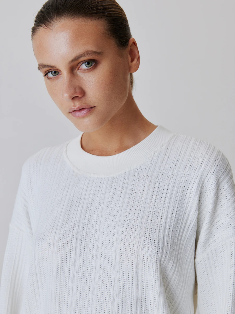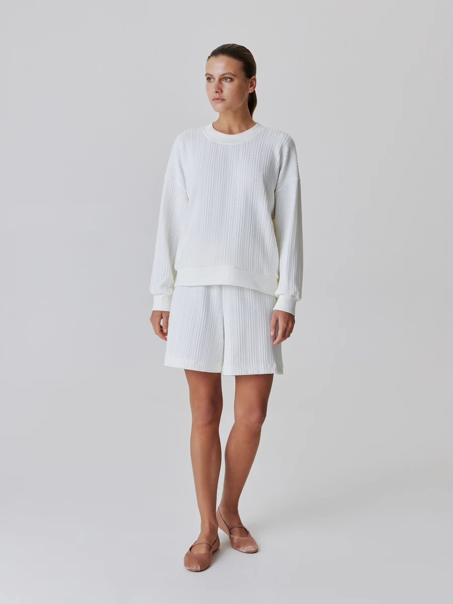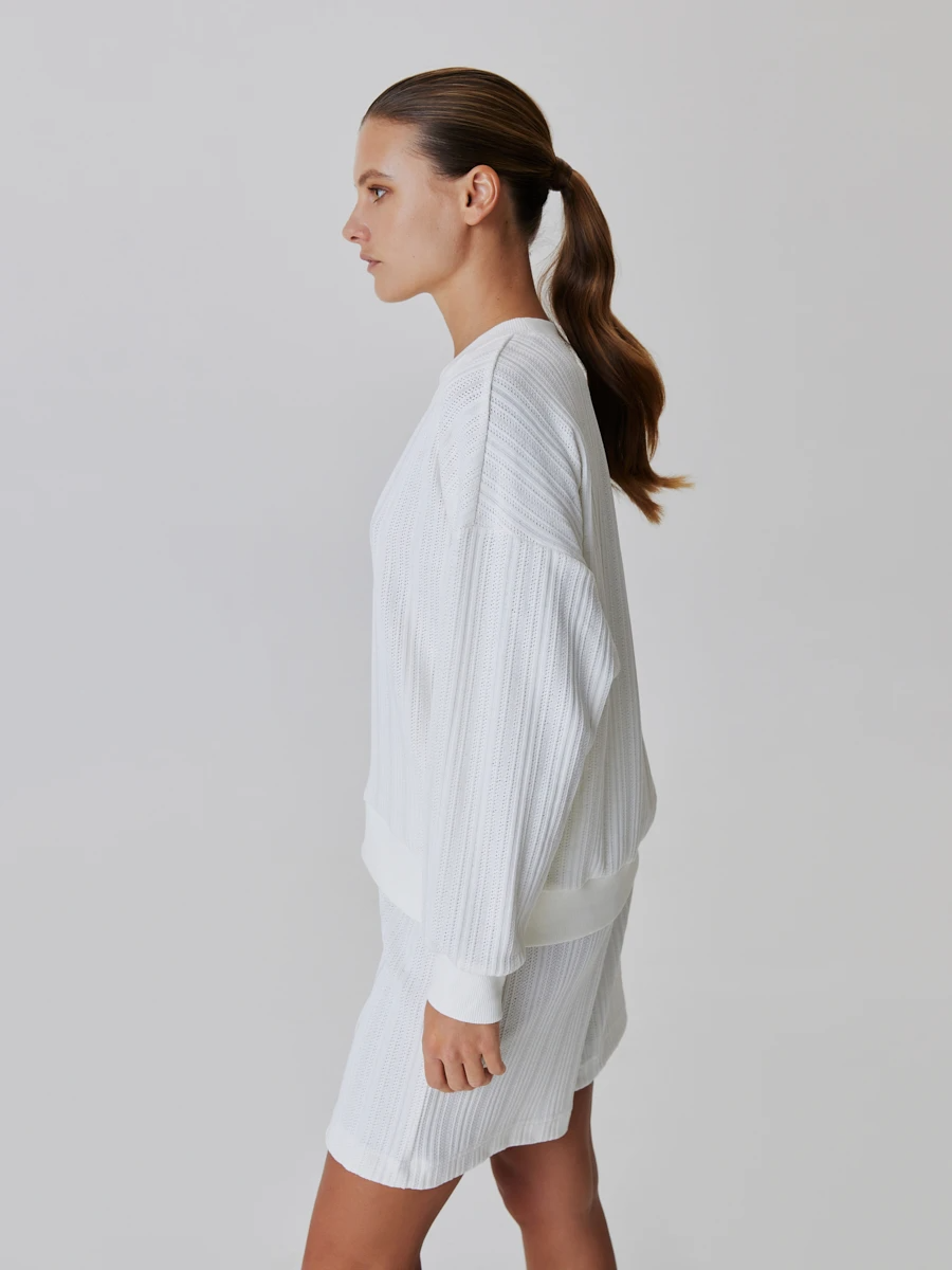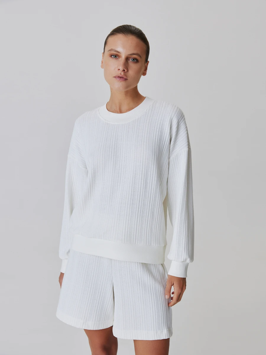 Базовый oversize свитшот в универсальном молочном оттенке. Модель выполнена из мягкого трикотажа и имеет фактурную мелкую вязку с вертикальным рисунком. Низ изделия, горловина и рукава оснащены эластичными вставками. Стандартная длина позволяет по-разному стилизовать свитшот. Можно подвернуть край, заправить в брюки или носить навыпуск. Такой элемент гардероба освежит любой повседневный образ.