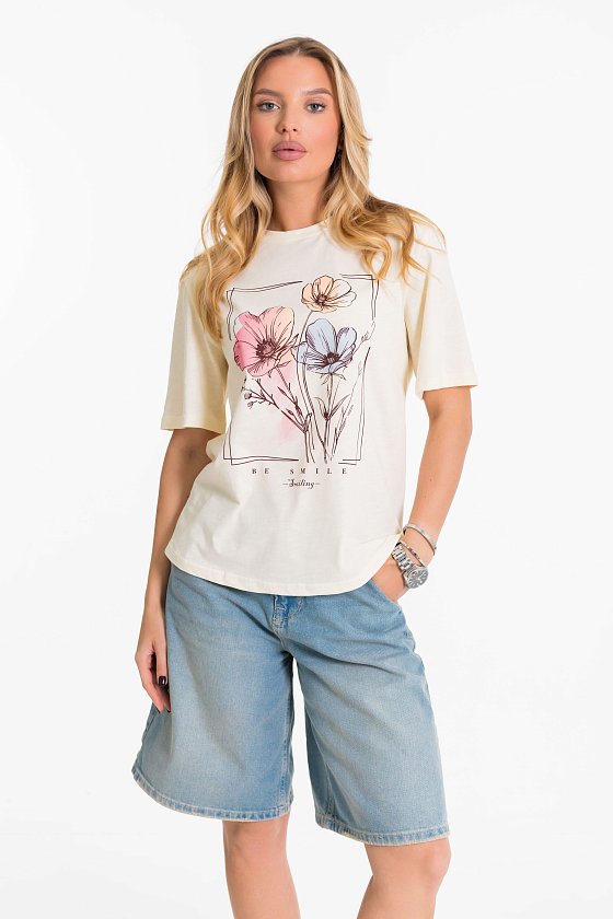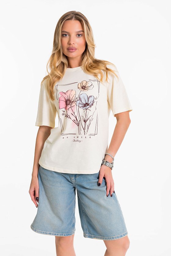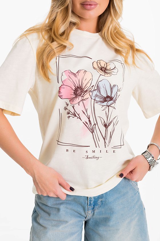 Женская футболка с принтом изготовлена из хлопкового полотна - кулирка "фламли", что обеспечивает комфорт и хорошую воздухопроницаемость. Футболка имеет короткий рукав и круглый вырез горловины, что придает ей классический стильный вид. Такая модель футболки отлично сочетается с джинсами, брюками или юбкой. Изготовленная из натуральной ткани, футболка обеспечит комфорт в течение всего дня.