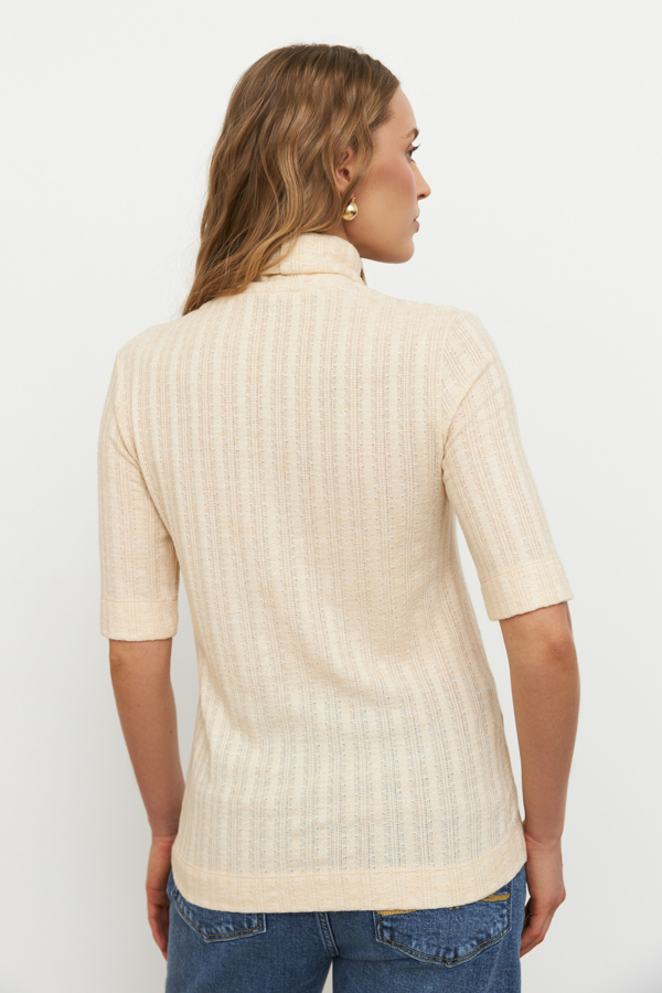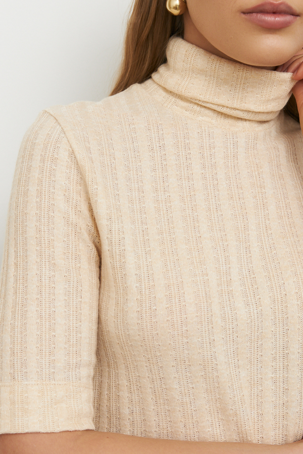Джемпер прилегающего силуэта из фактурного эластичного полотна. Втачной короткий рукав. Вырез горловины высокая стойка. Джемпер – это хорошая базовая вещь, подходящая для любого гардероба.