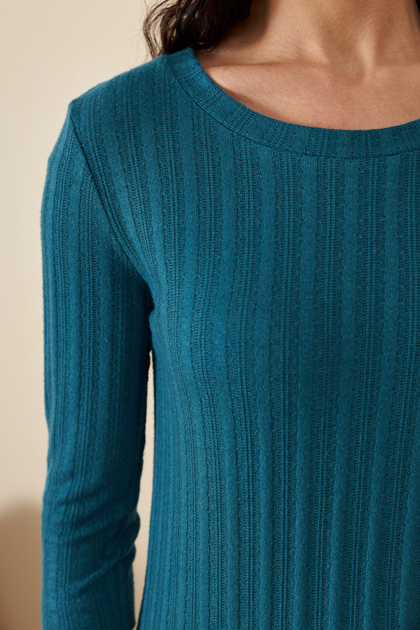 Джемпер прилегающего силуэта из фактурного эластичного полотна. Втачной рукав 3/4. Круглый вырез горловины оформлен бейкой.