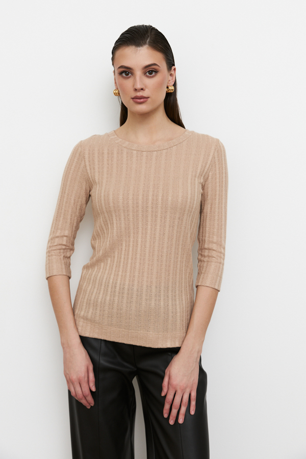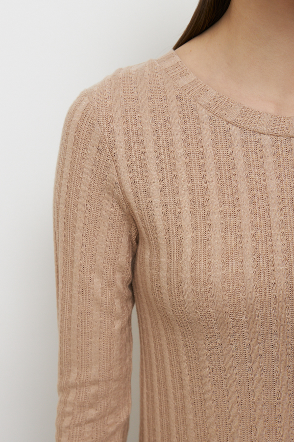 Джемпер прилегающего силуэта из фактурного эластичного полотна. Втачной рукав 3/4. Круглый вырез горловины оформлен бейкой.