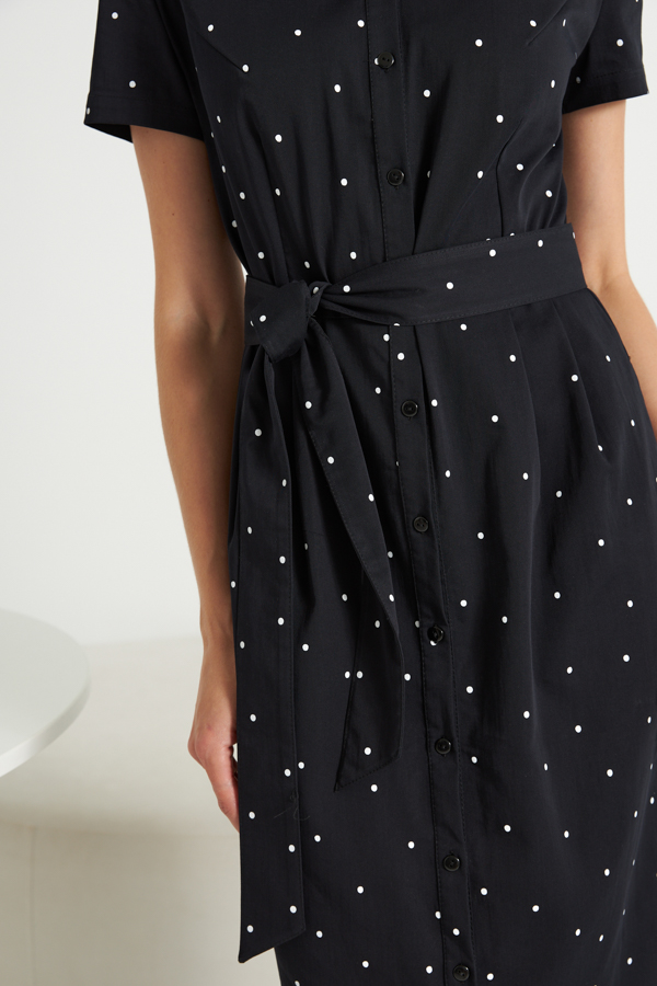 Платье приталенного силуэта из хлопковой плательной ткани. Изделие отрезное по линии талии с защипами. В боковых швах карманы. Втачной короткий рукав. Притачная планка с застёжкой на пуговицы. Вырез горловины обработан отложным воротником на стойке. В комплекте пояс из основной ткани.