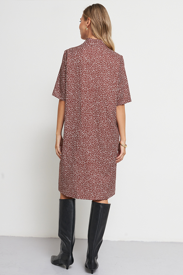 Платье свободного силуэта из плательной ткани. По центру передней части изделия выполнен шов. Цельнокроеная стойка, переходящая в V-образный вырез горловины, визуально делает фигуру стройнее. Втачной короткий рукав.