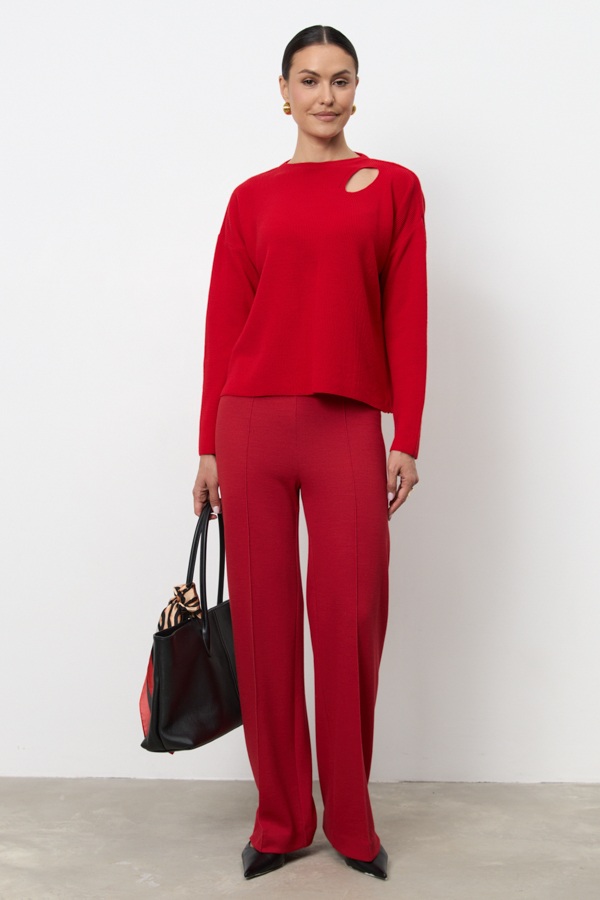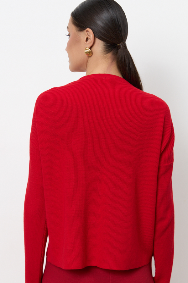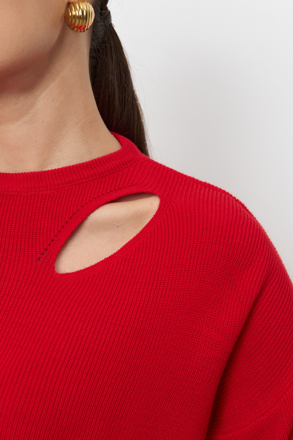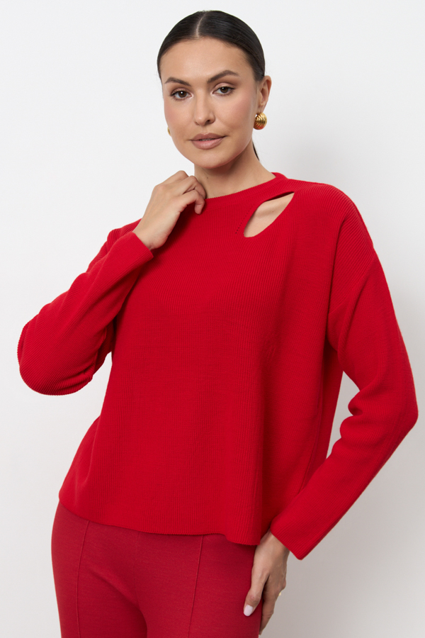 Джемпер свободного силуэта с декоративным вырезом в области плеча. Рукав втачной в спущенную пройму. Изделие выполнено из мягкой структурированной пряжи.